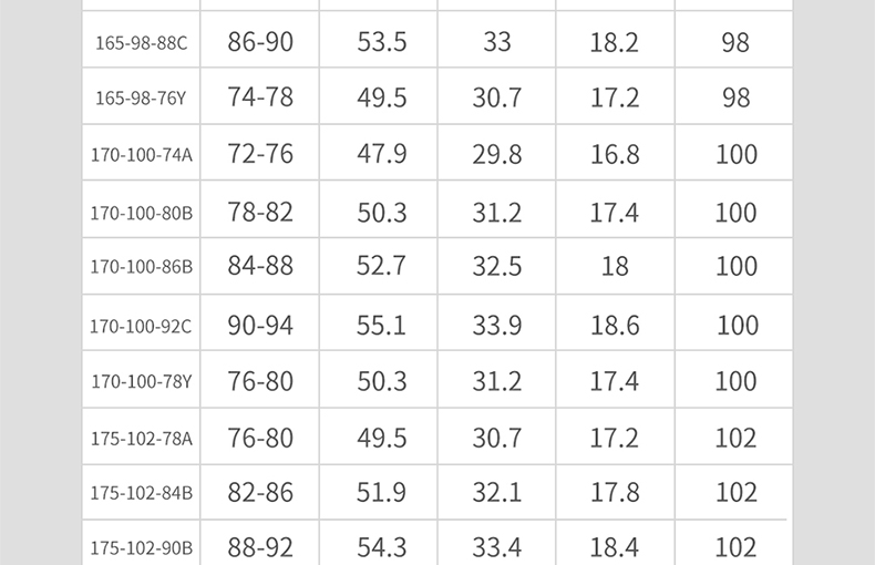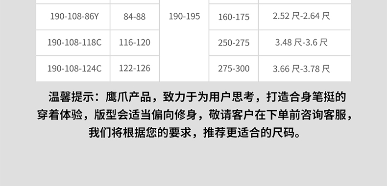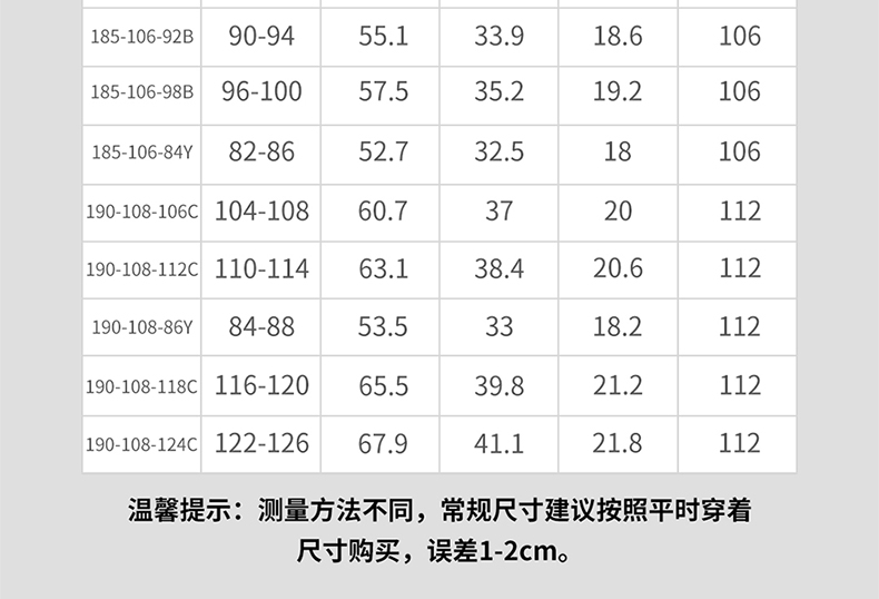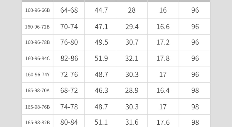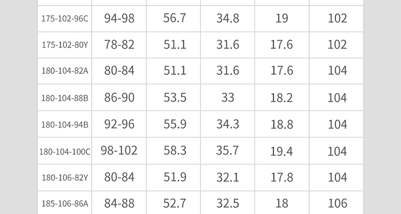 尺碼 190/118C【高190 重250-275】 190/124C【高190 重275-300】 160/66B 160/72B 160/78B 160/84C 160/74Y 165/70A 165/76B 165/82B 165/88C 165/76Y 170/74A 170/80B 170/86B 170/92C 170/78Y 175/78A 175/84B 175/90B 175/96C 175/80Y 180/82A 180/88B 180/94B 180/100C 180/82Y 185/86A 185/92B 185/98B 185/84Y 190/86Y 190/106C 190/112C
