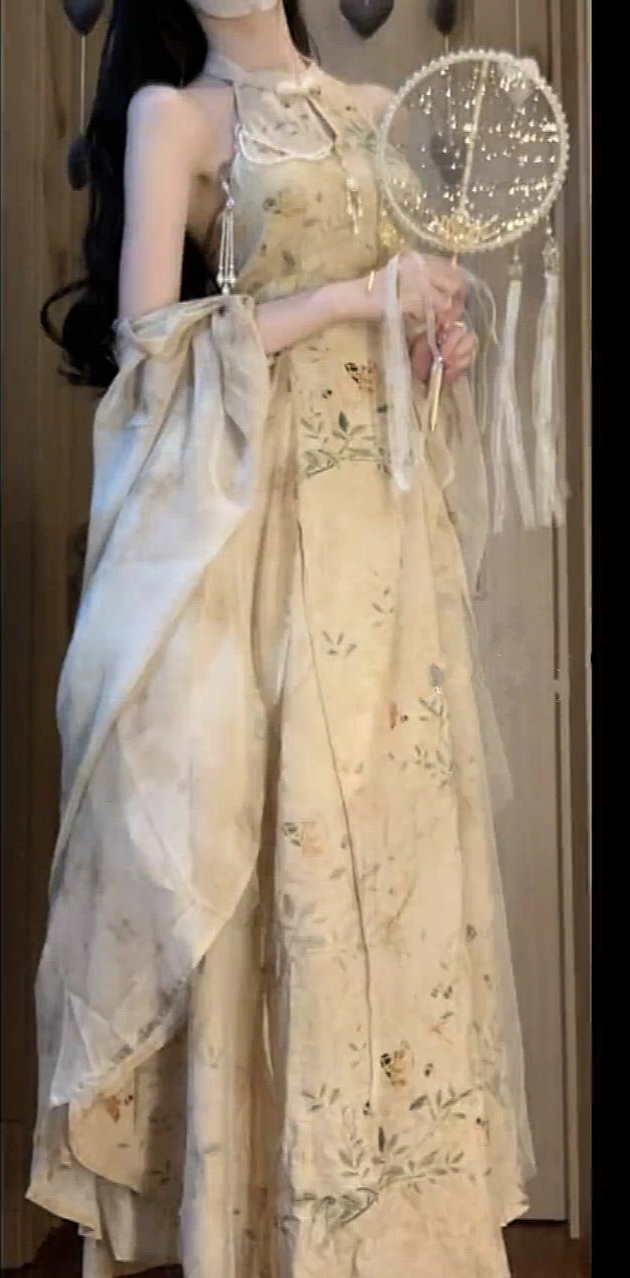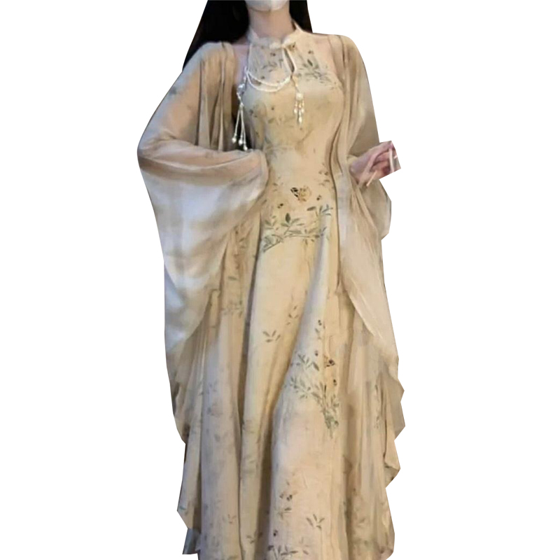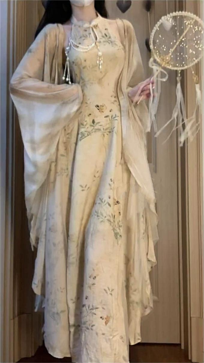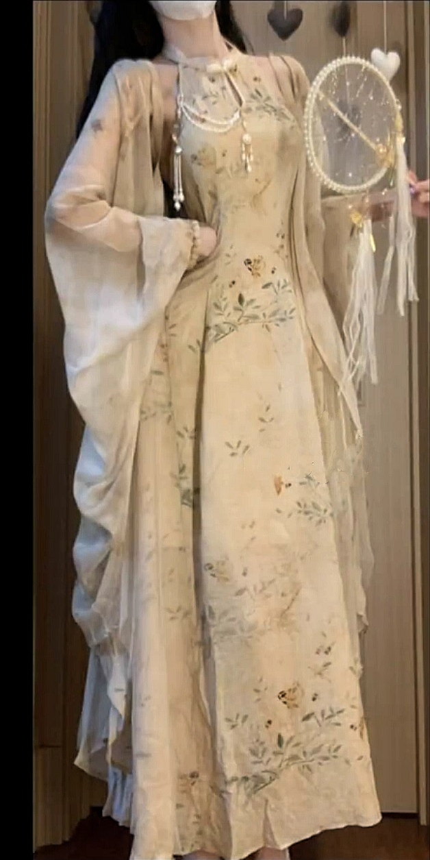 鏡花水月 新中式國風挖肩改良拼紗旗袍洋裝女秋季禪意開衫披肩