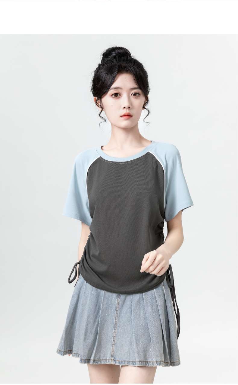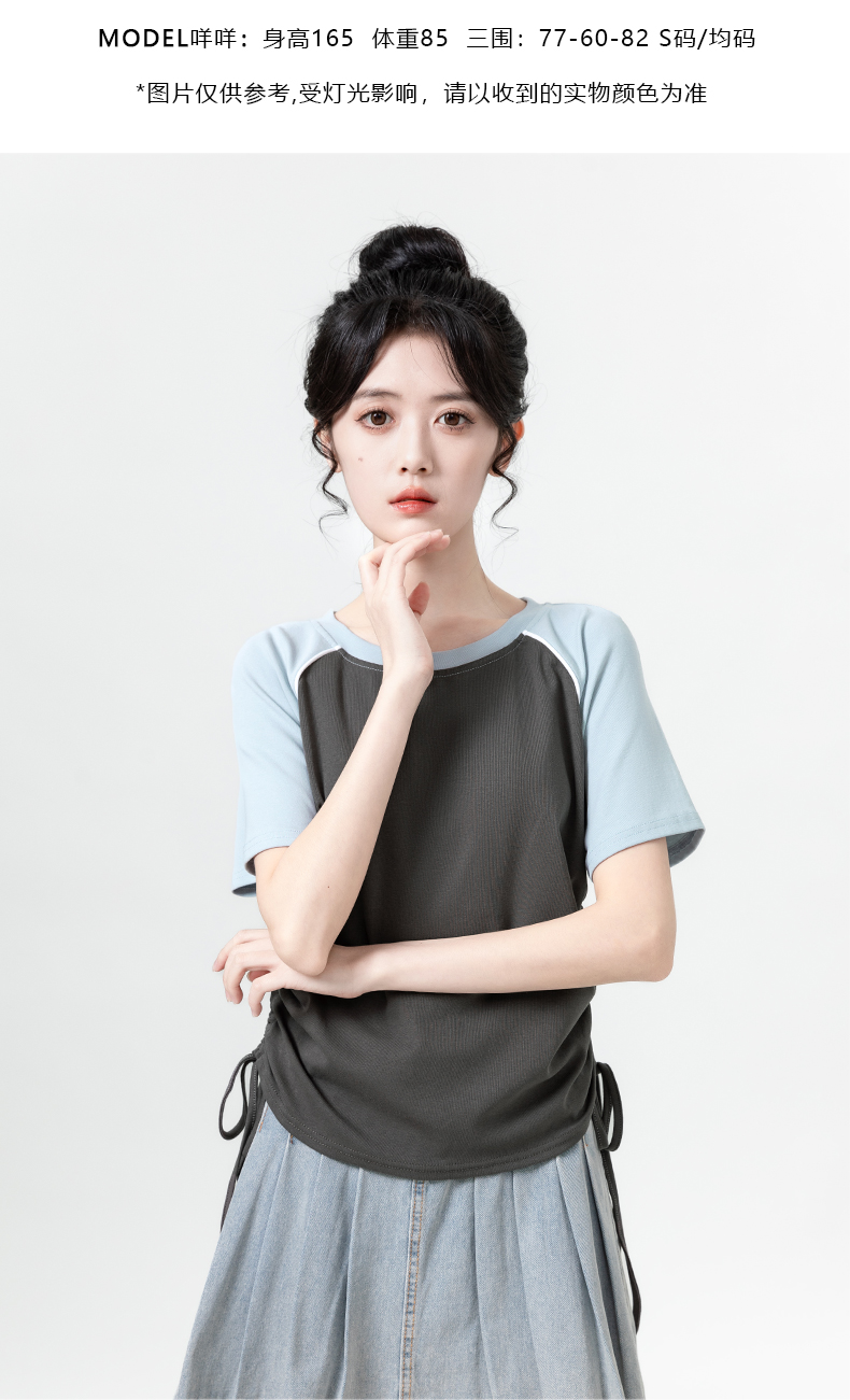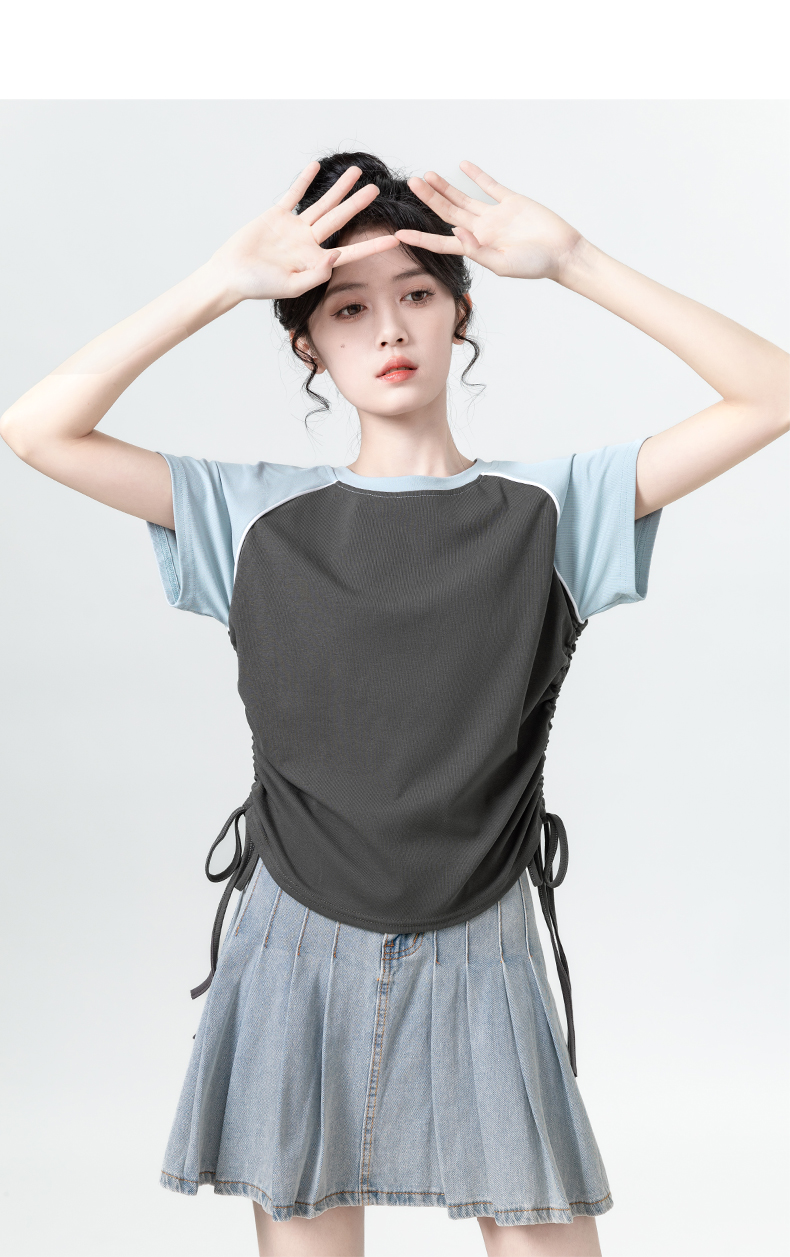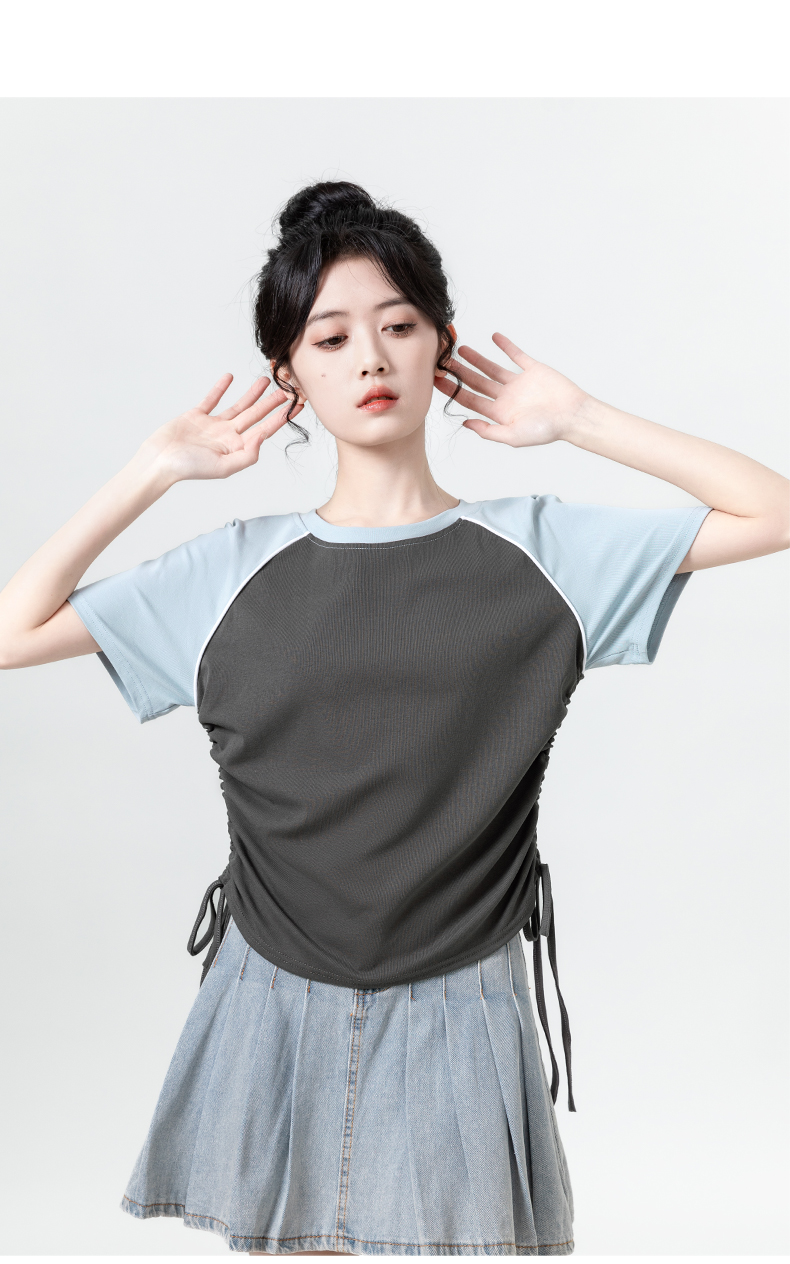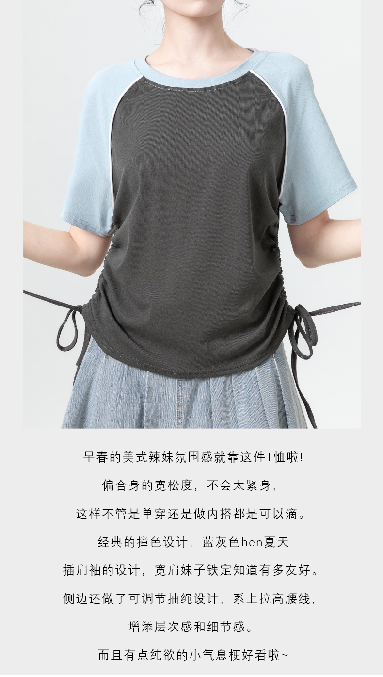 撞色插肩短袖T恤女夏季2023新款兩側抽繩寬鬆T恤設計感短款上衣