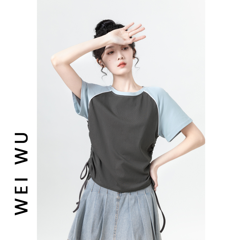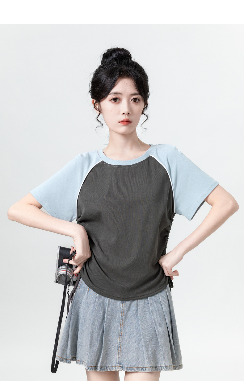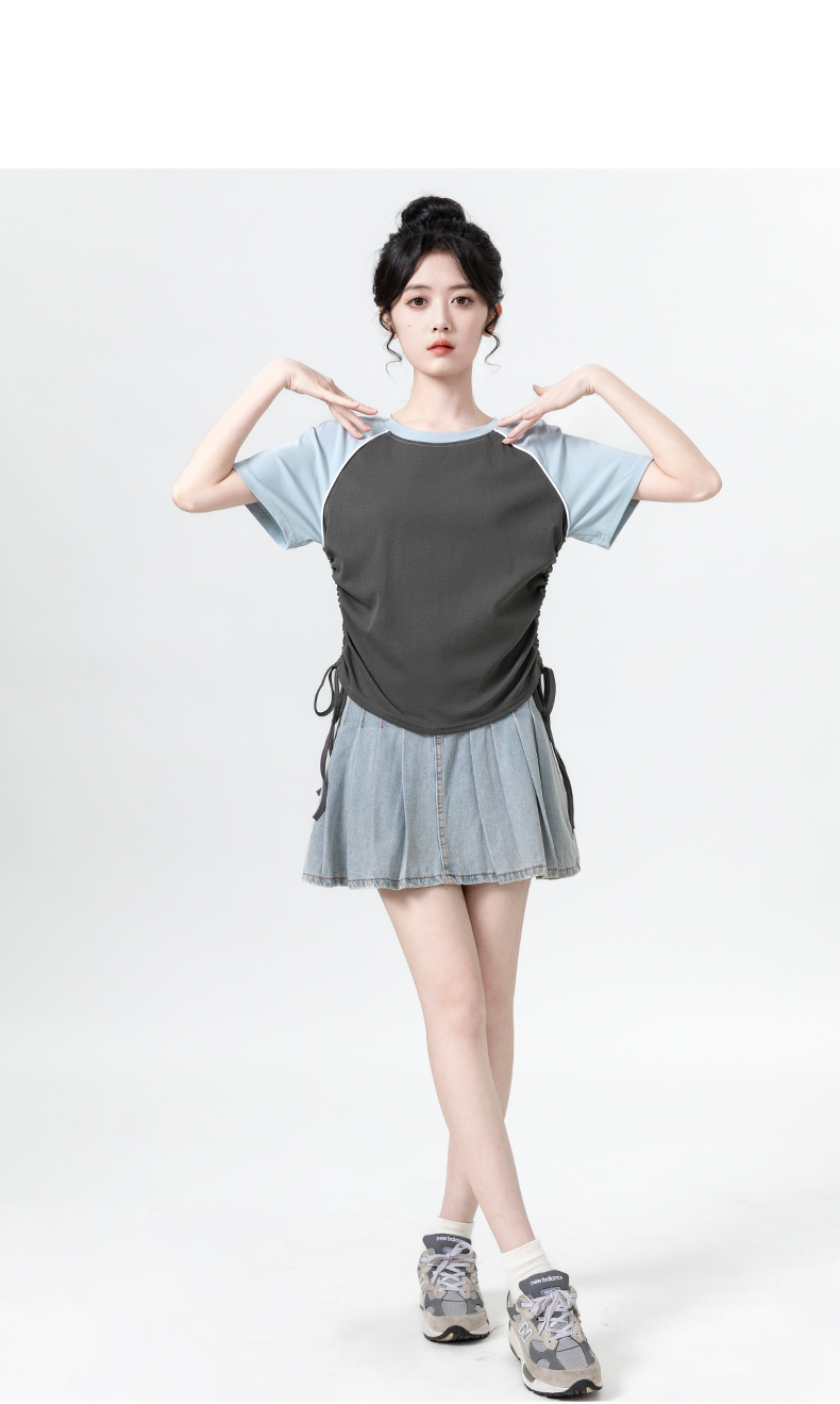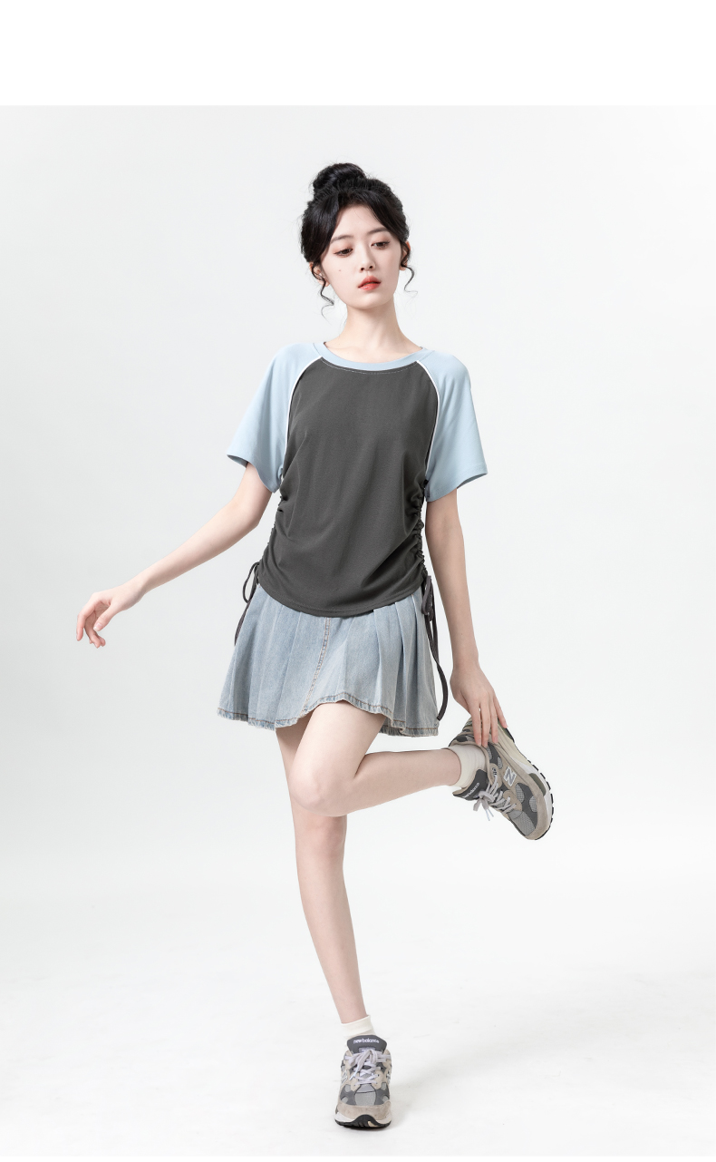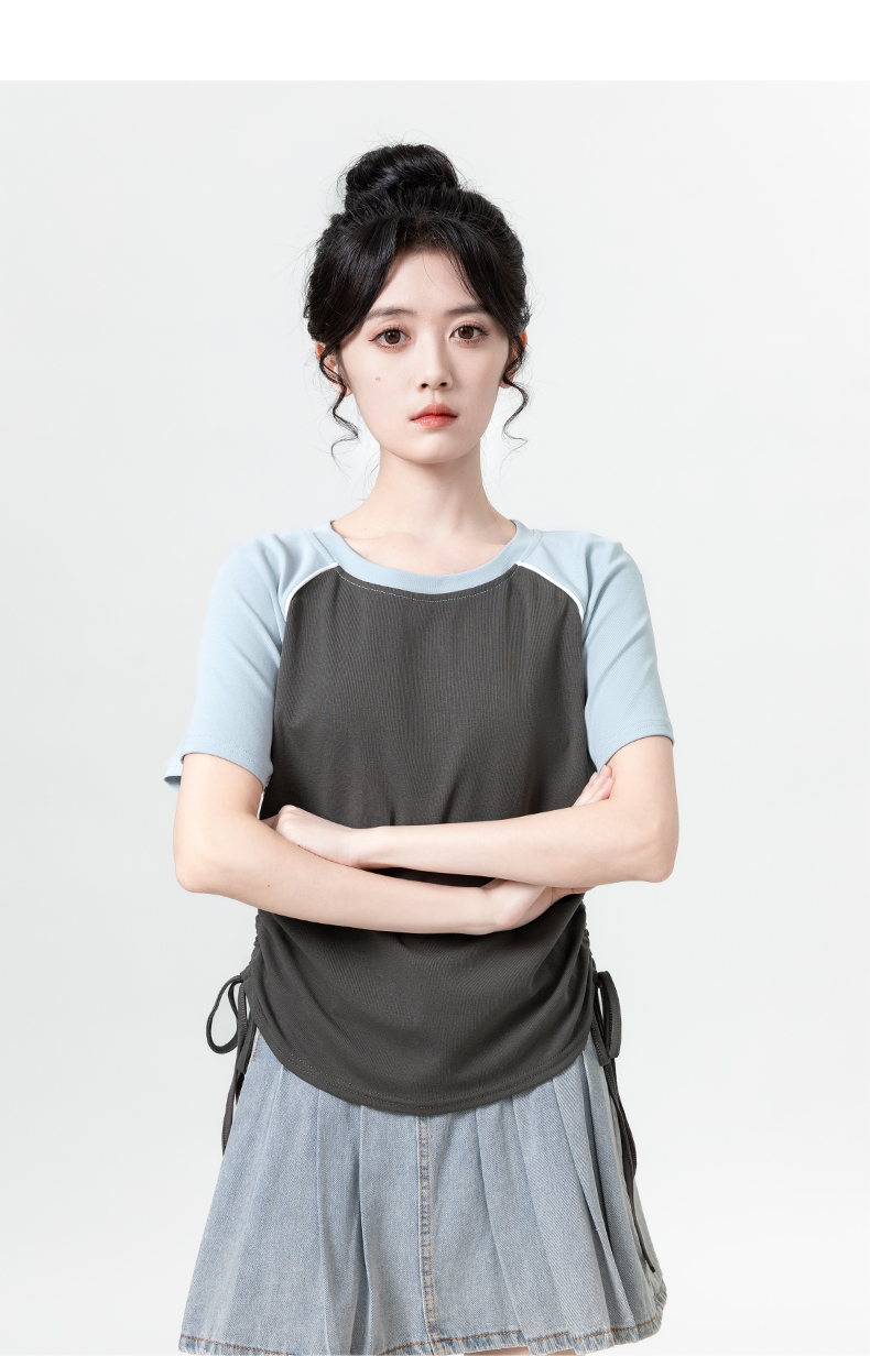 撞色插肩短袖T恤女夏季2023新款兩側抽繩寬鬆T恤設計感短款上衣