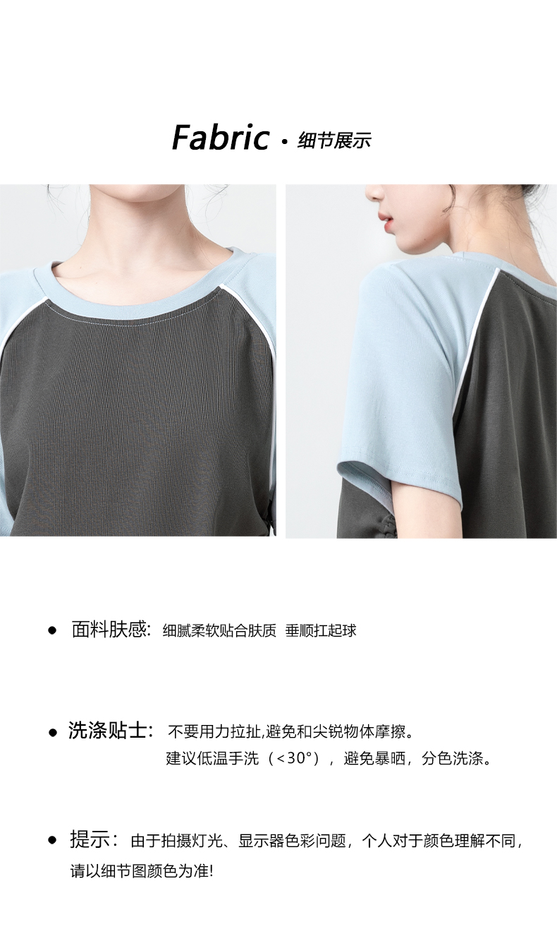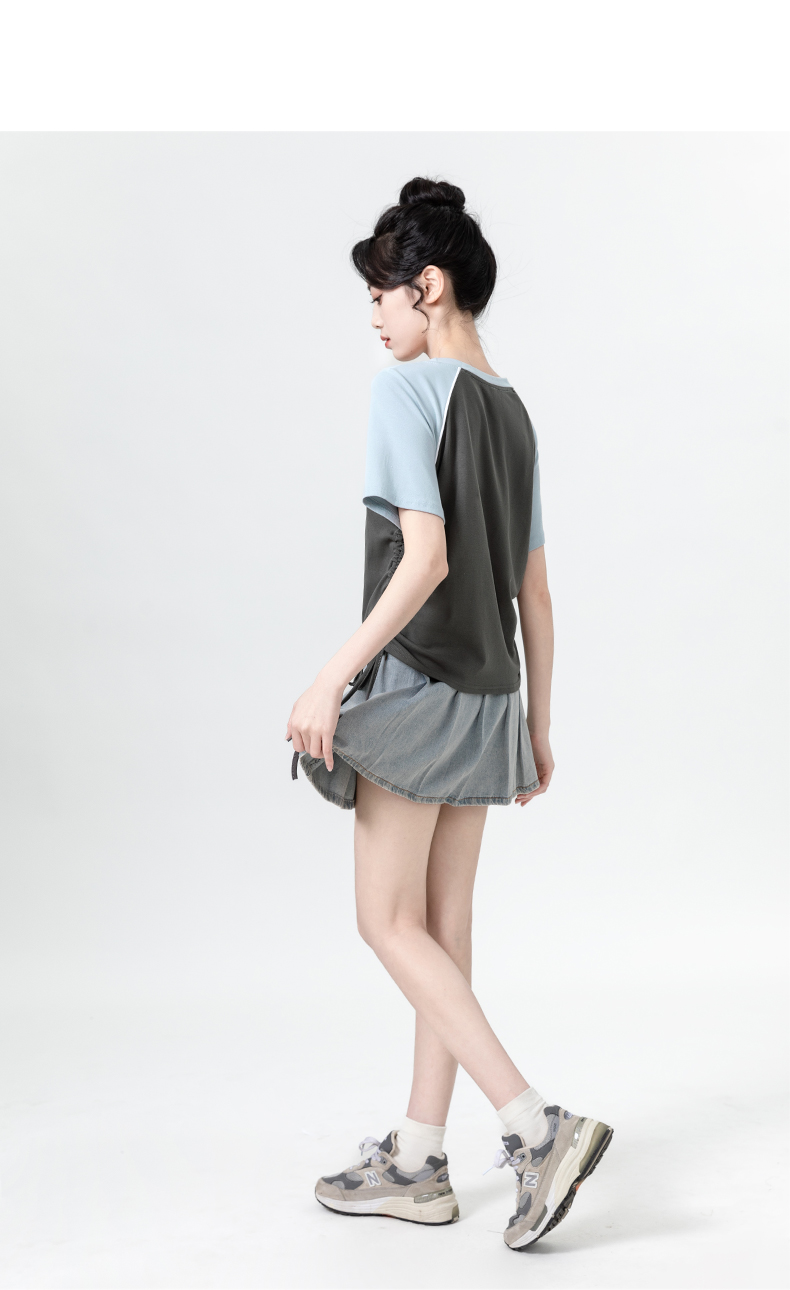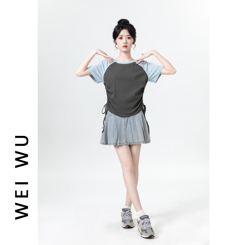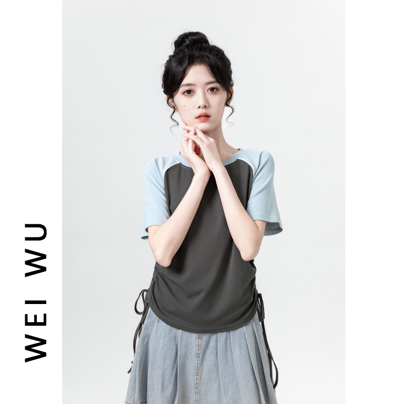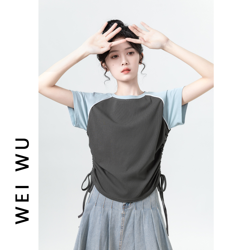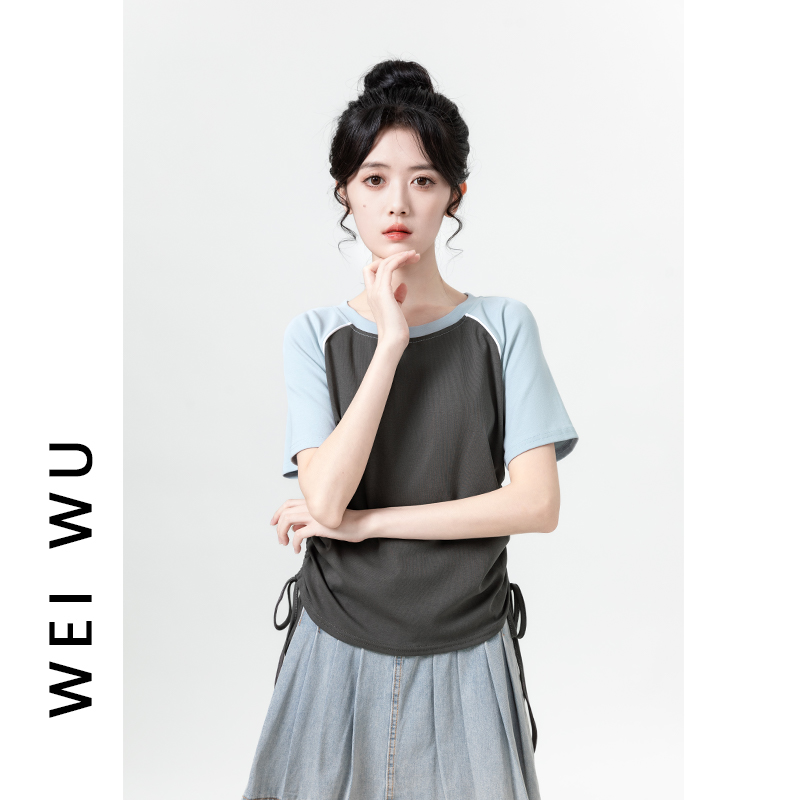 撞色插肩短袖T恤女夏季2023新款兩側抽繩寬鬆T恤設計感短款上衣
