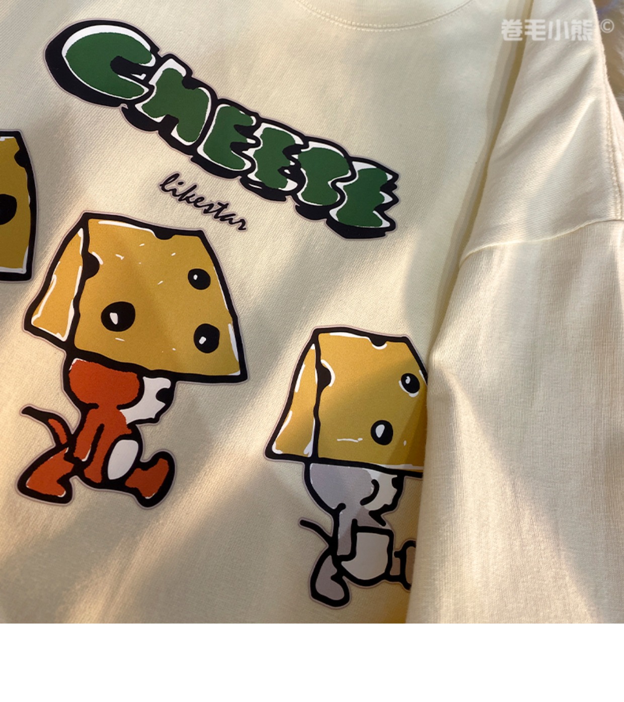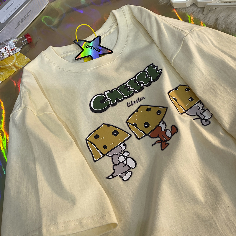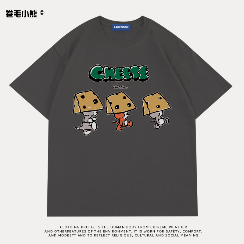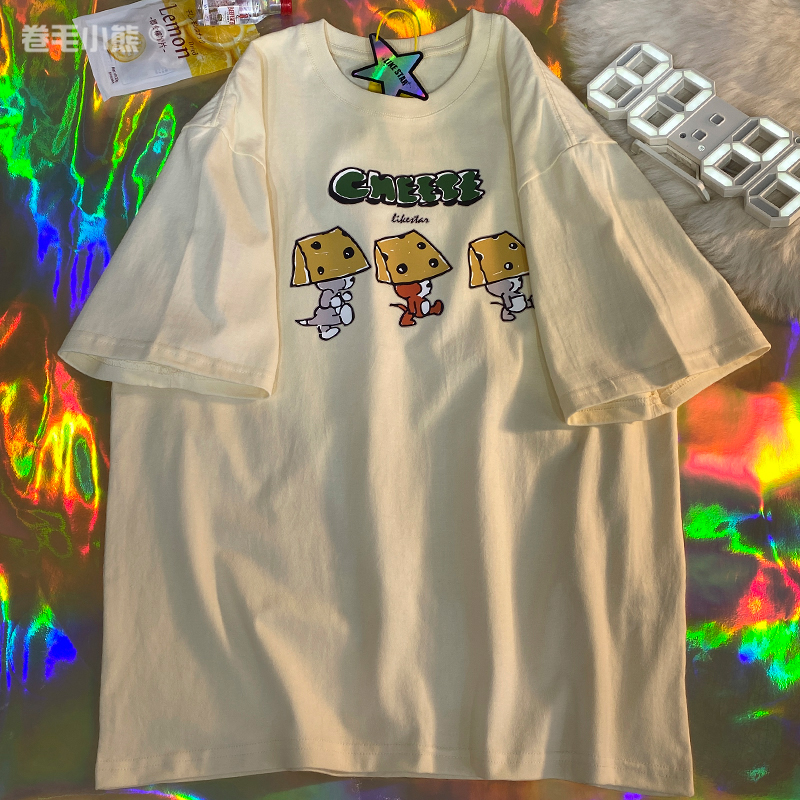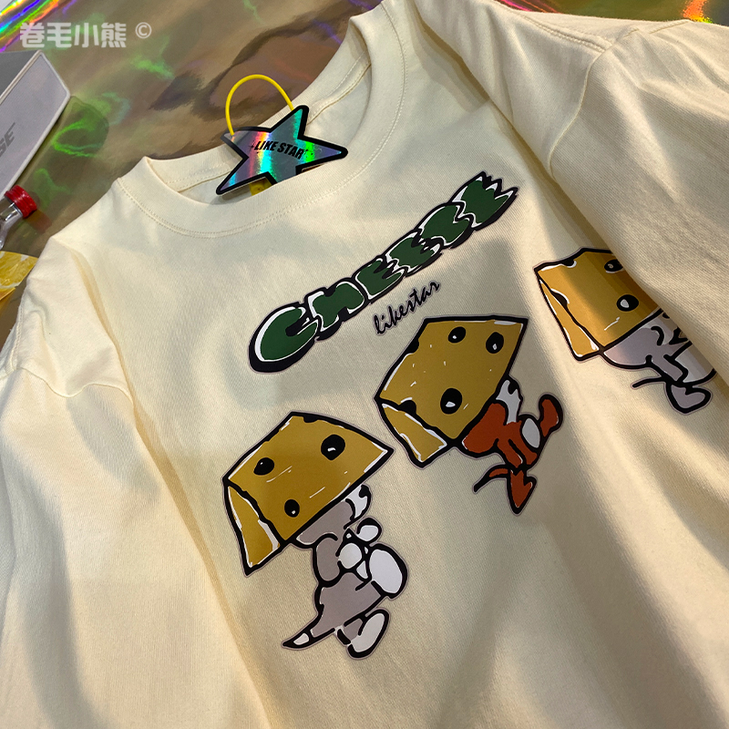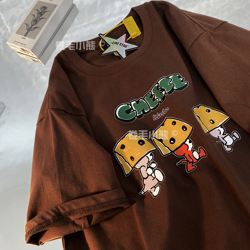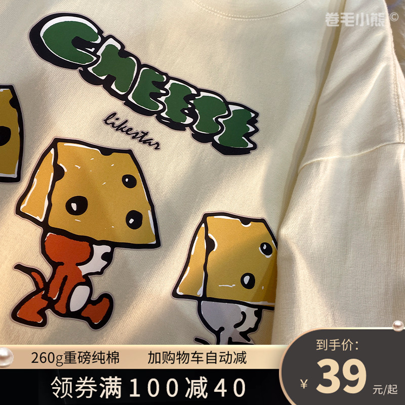 芝士s捲毛小熊重磅純棉短袖t恤女2023年新款寬鬆韓版美式上衣情侶