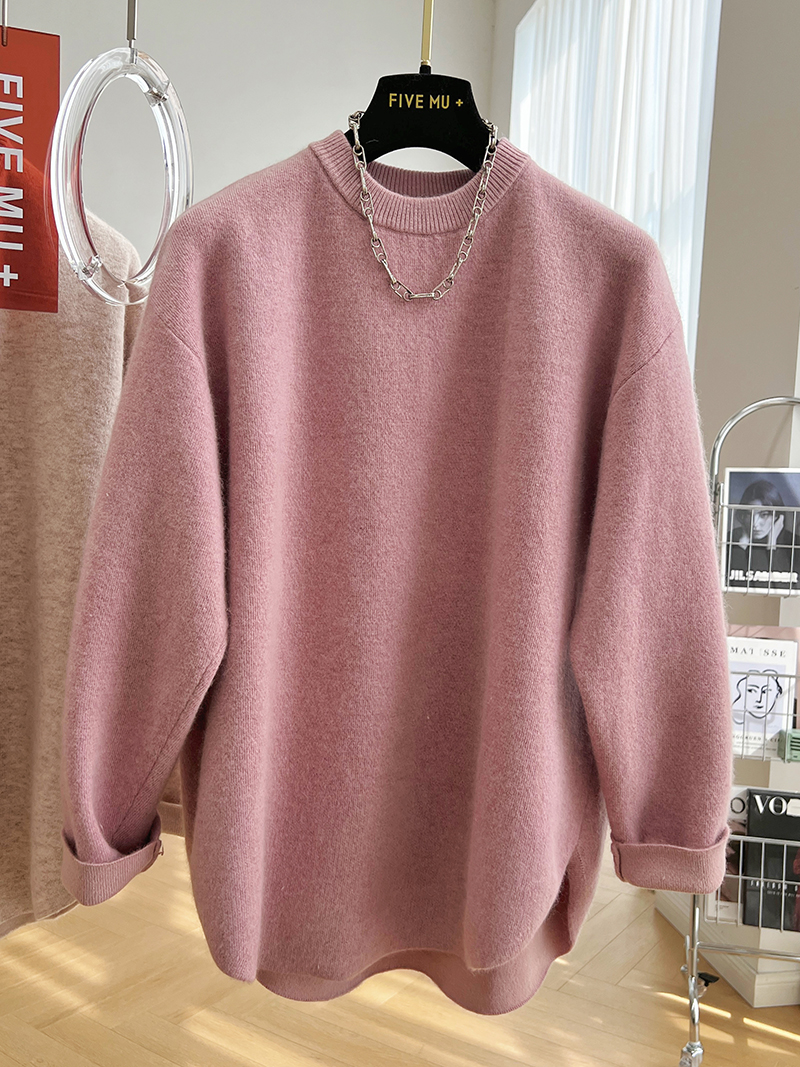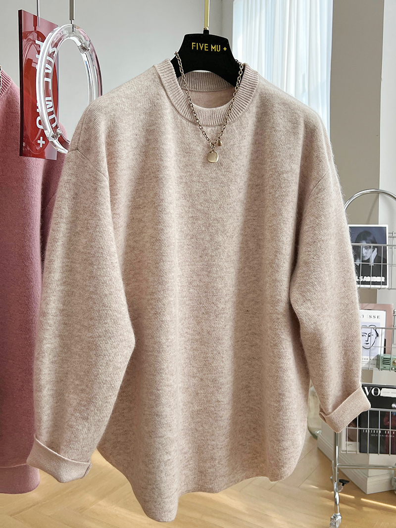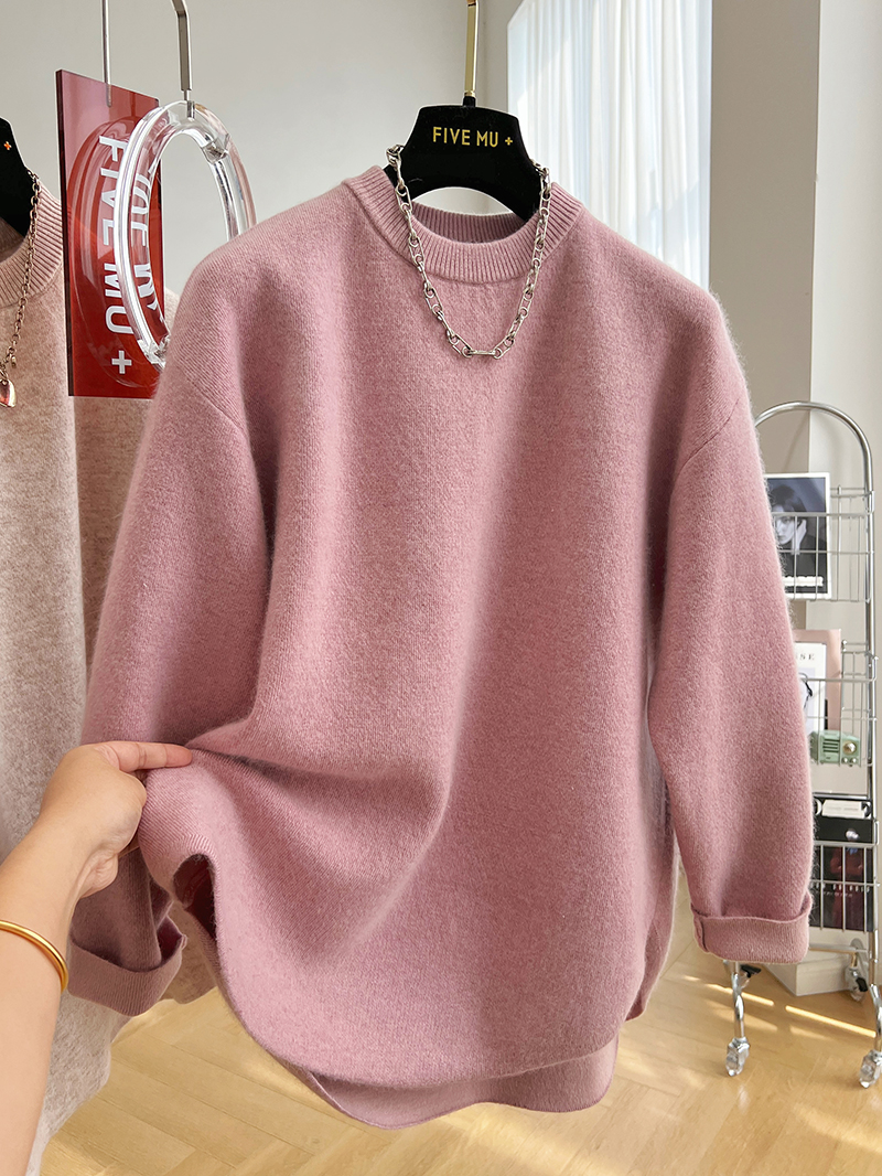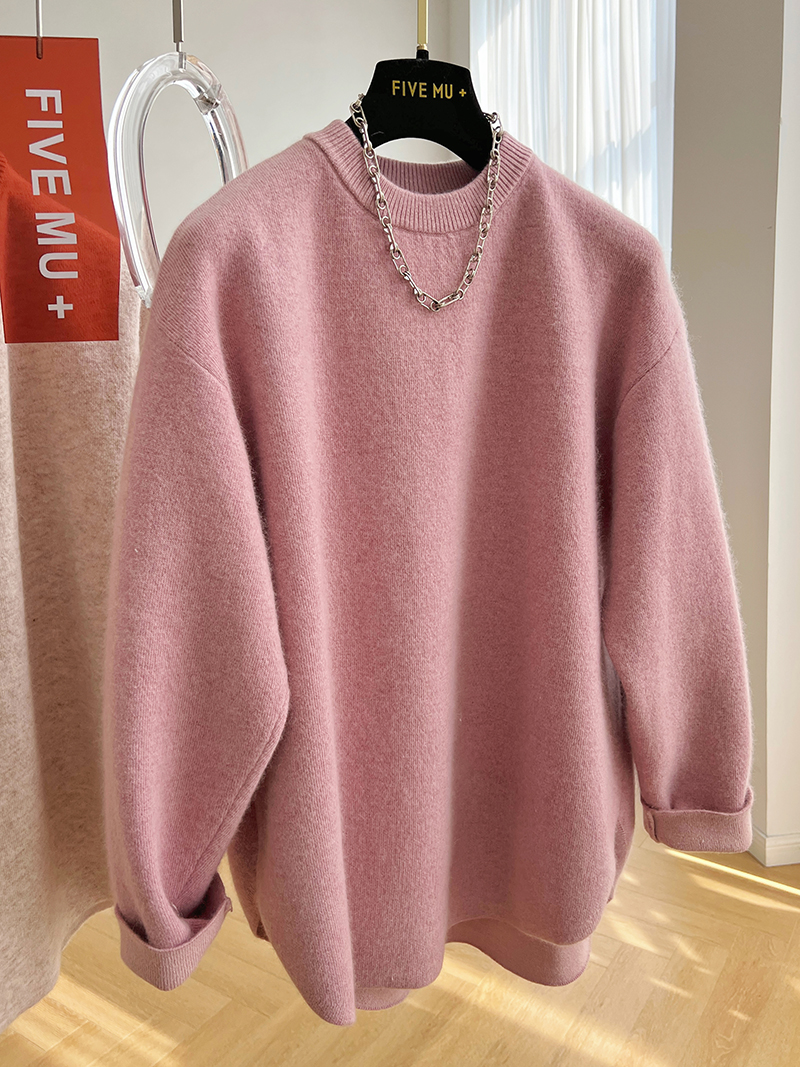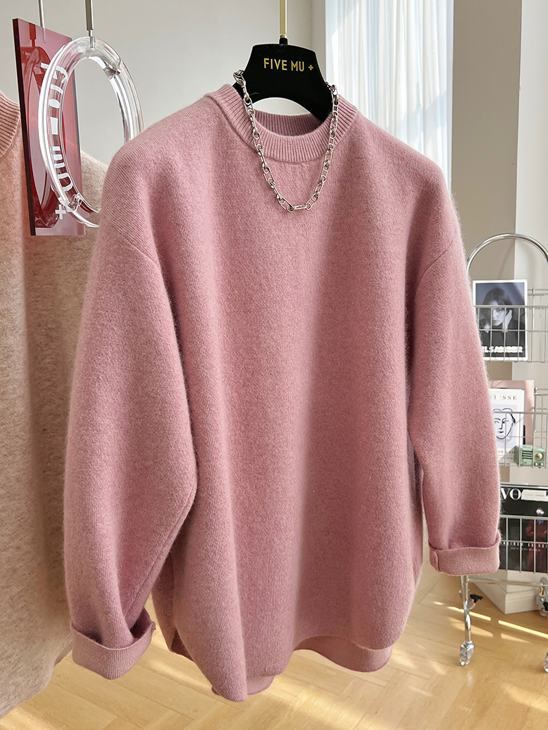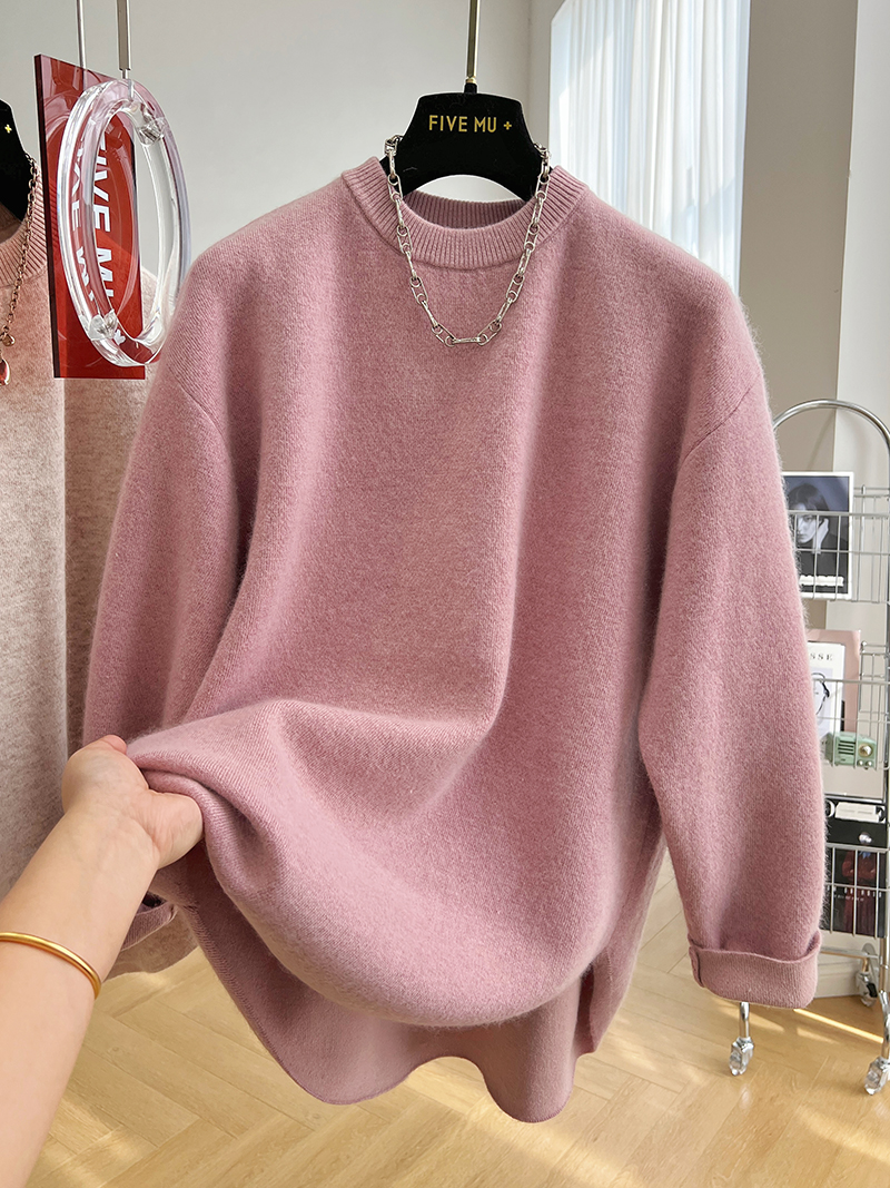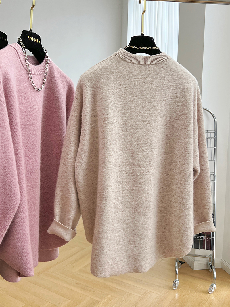韓系高級感軟糯浣熊絨混羊毛圓領套頭針織衫女秋冬套頭中長版毛衣