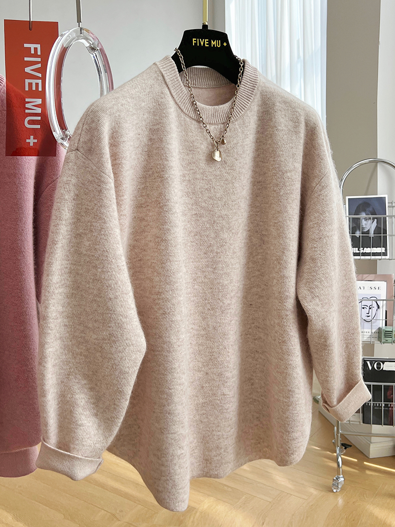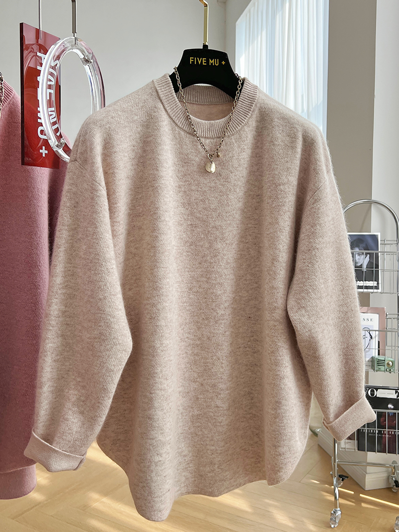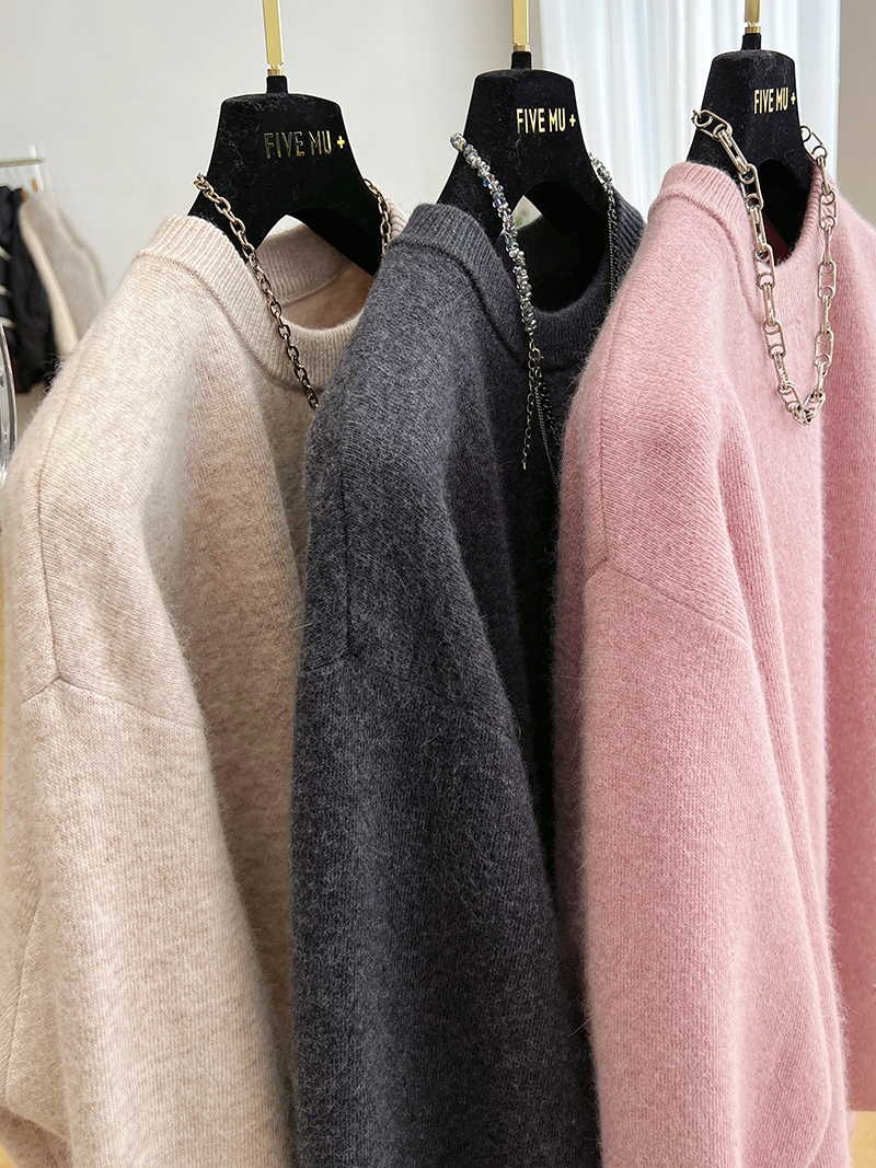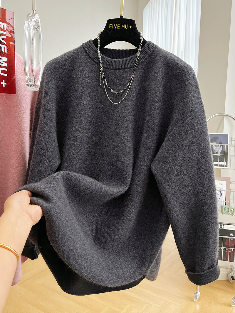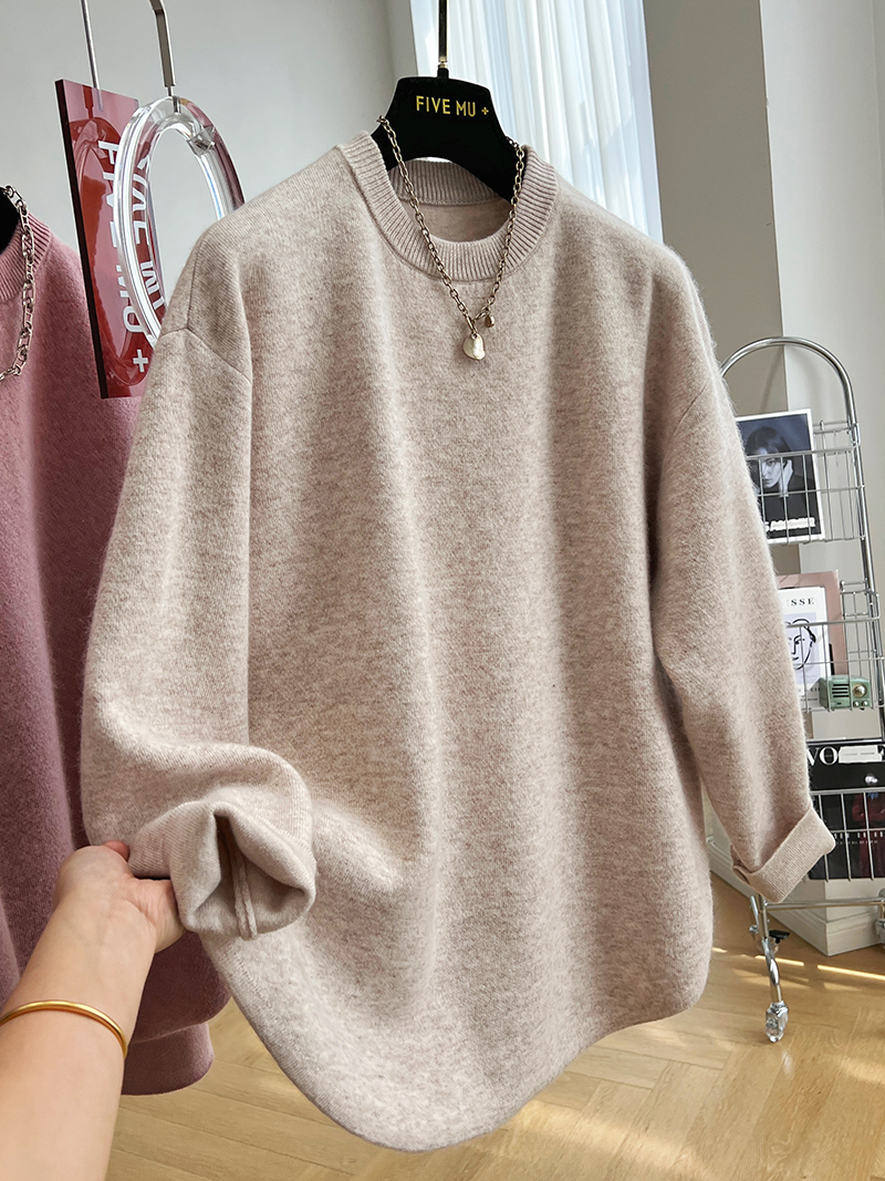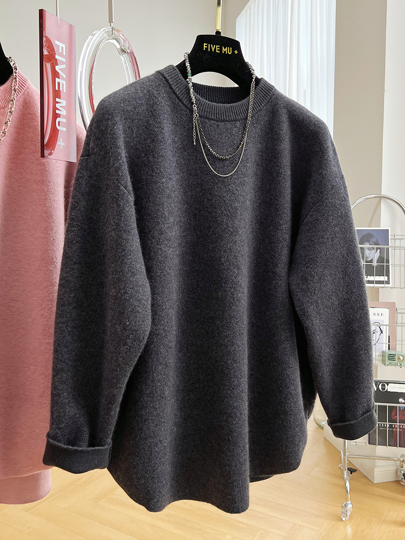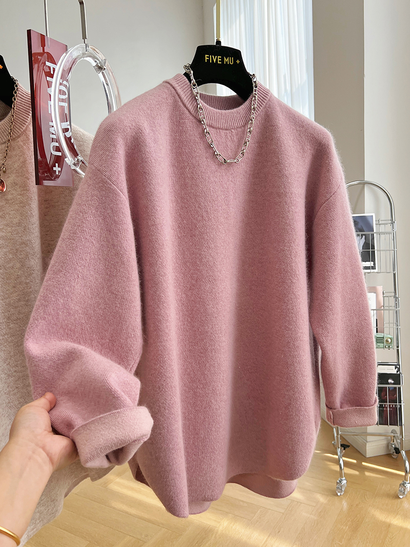 韓系高級感軟糯浣熊絨混羊毛圓領套頭針織衫女秋冬套頭中長版毛衣