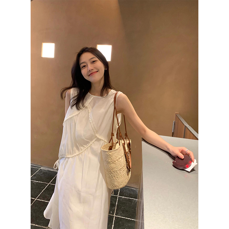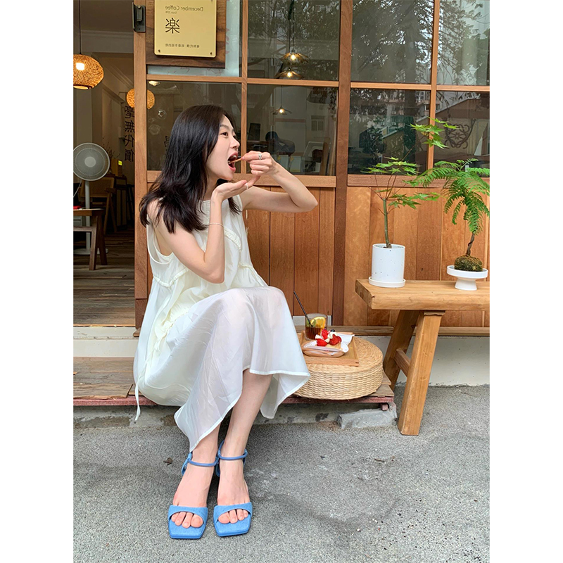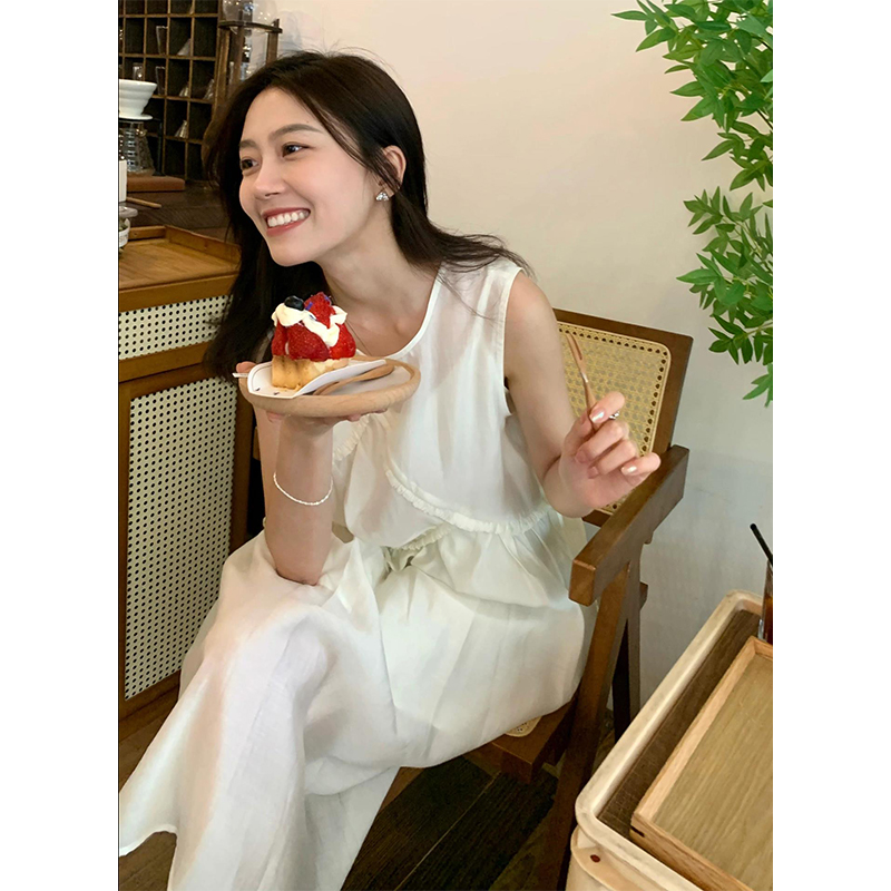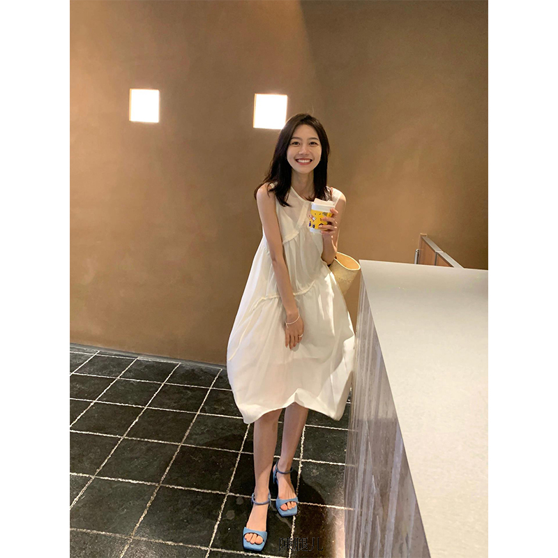 Turn right/陳大腿 法式復古白色無袖吊帶洋裝女夏小眾度假長裙