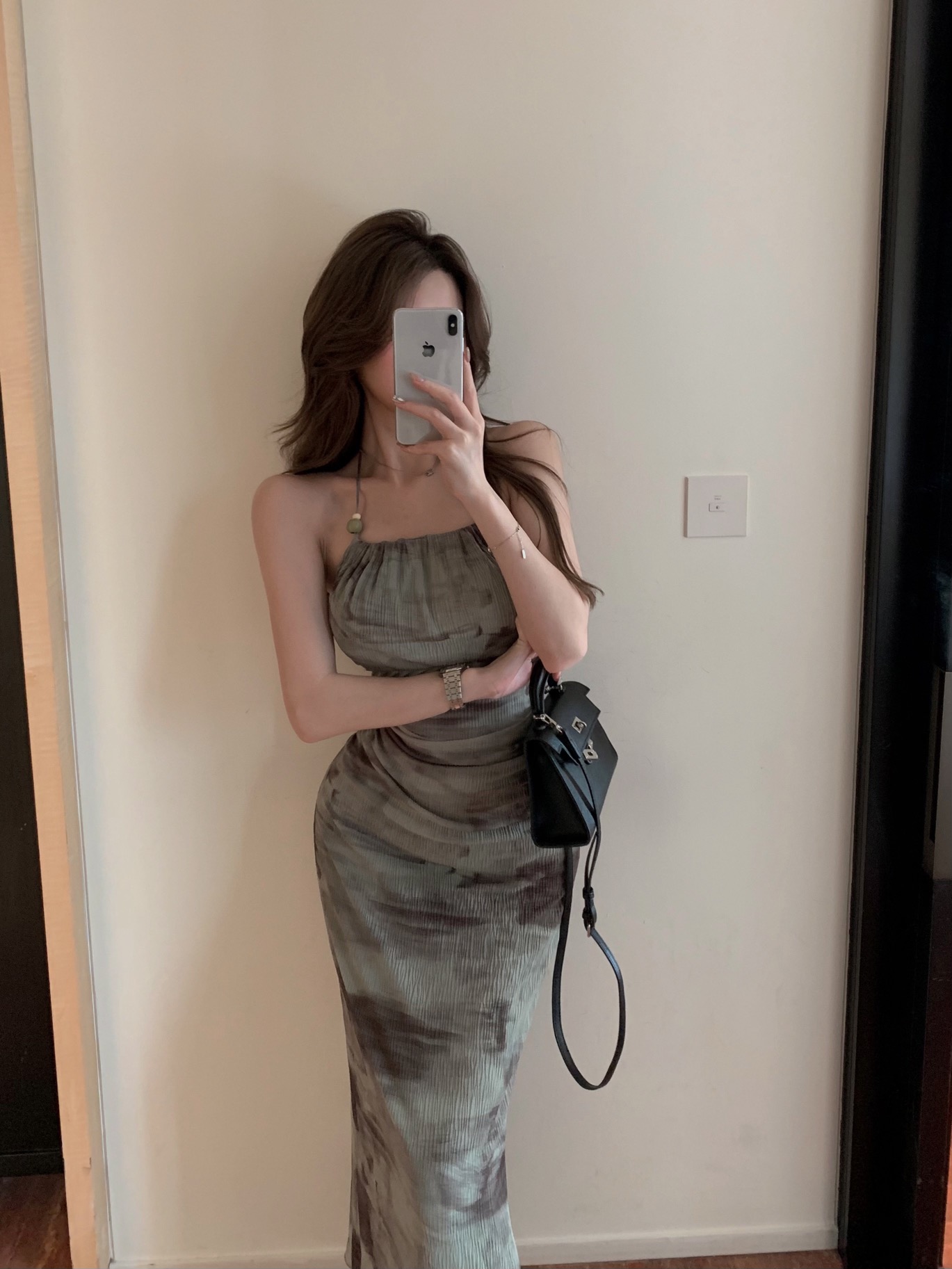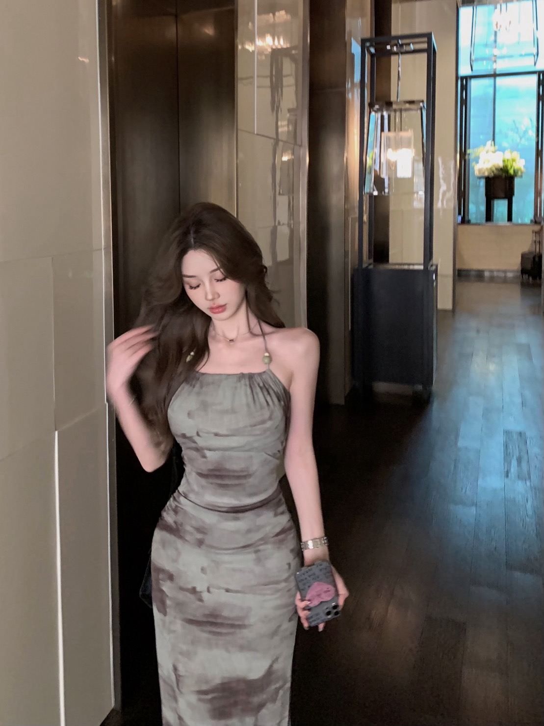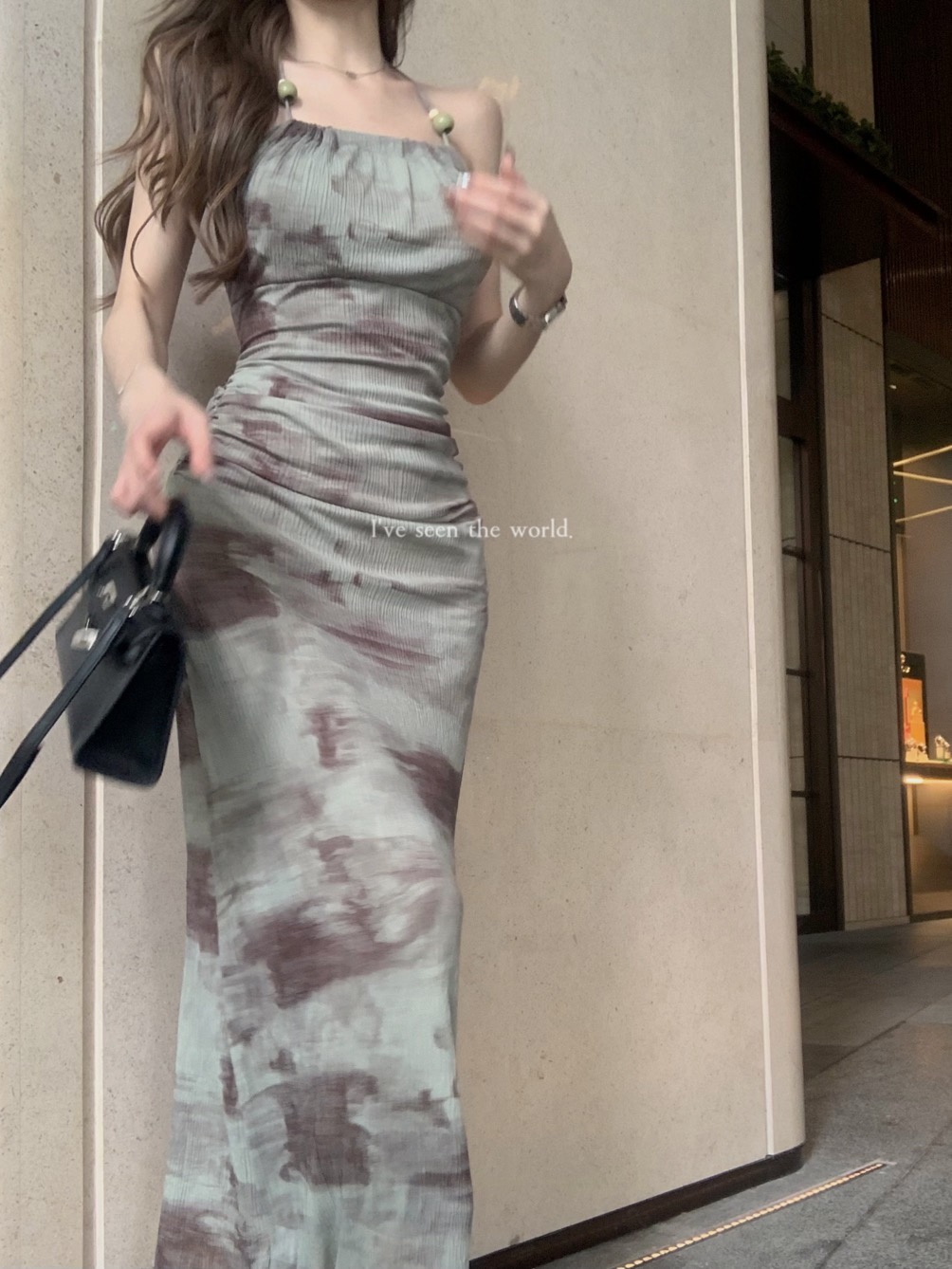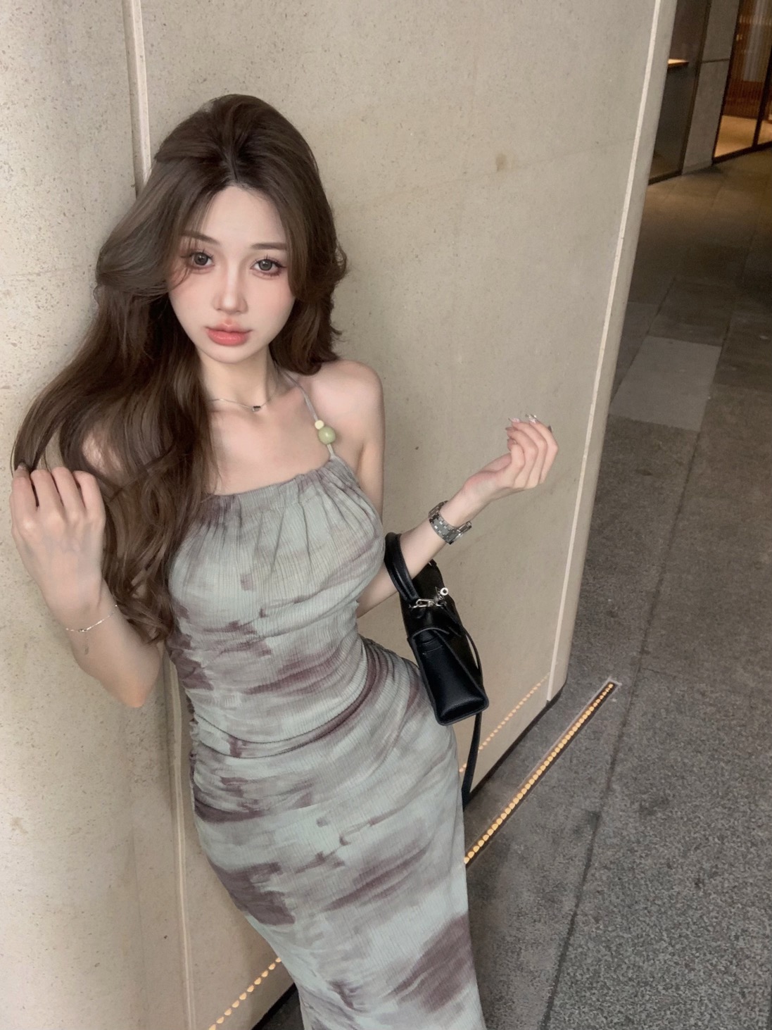 甜辣妹串珠掛頸吊帶洋裝女夏季純欲裙子紮染收腰高級感包臀長裙