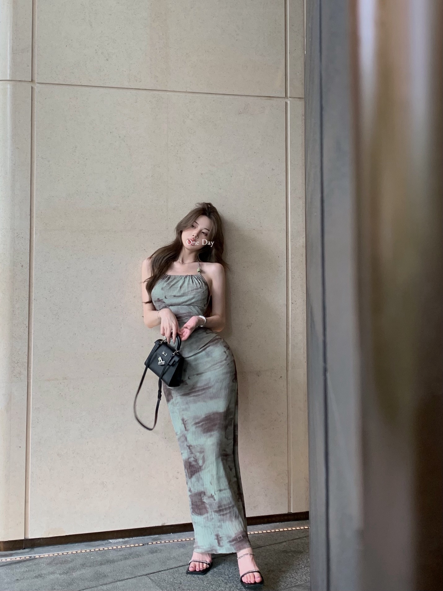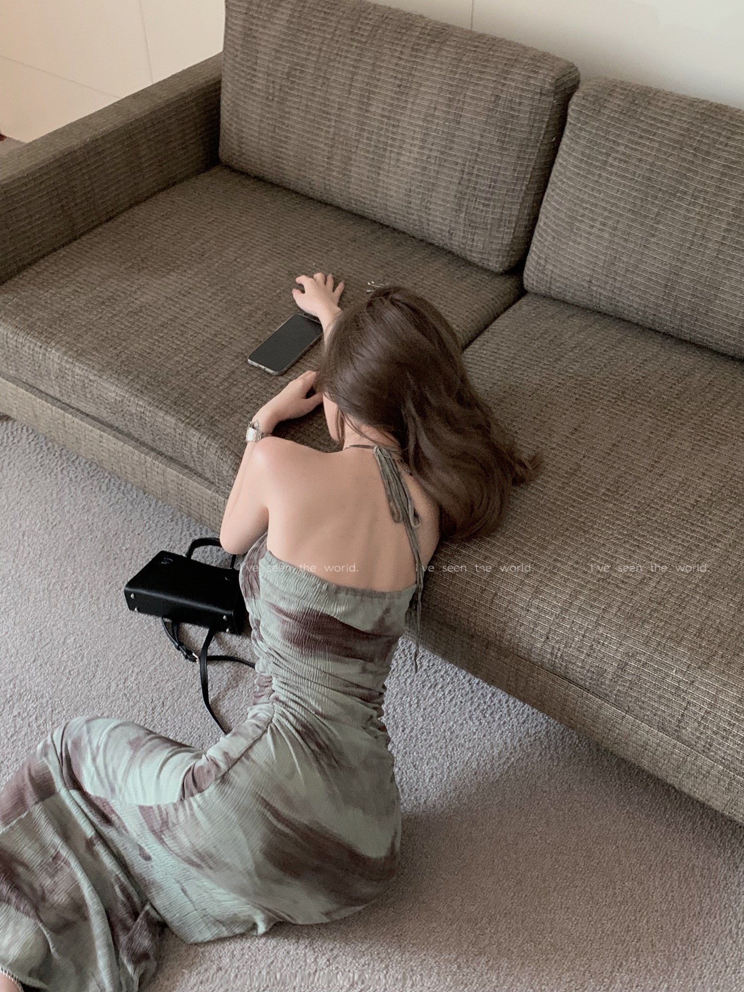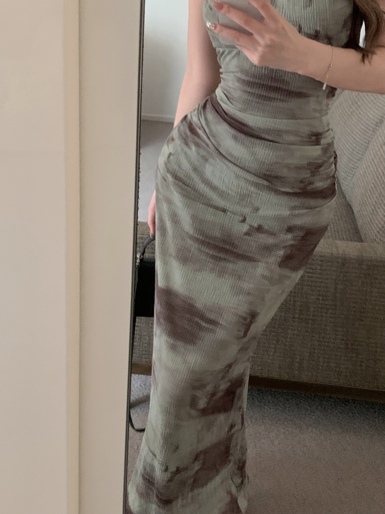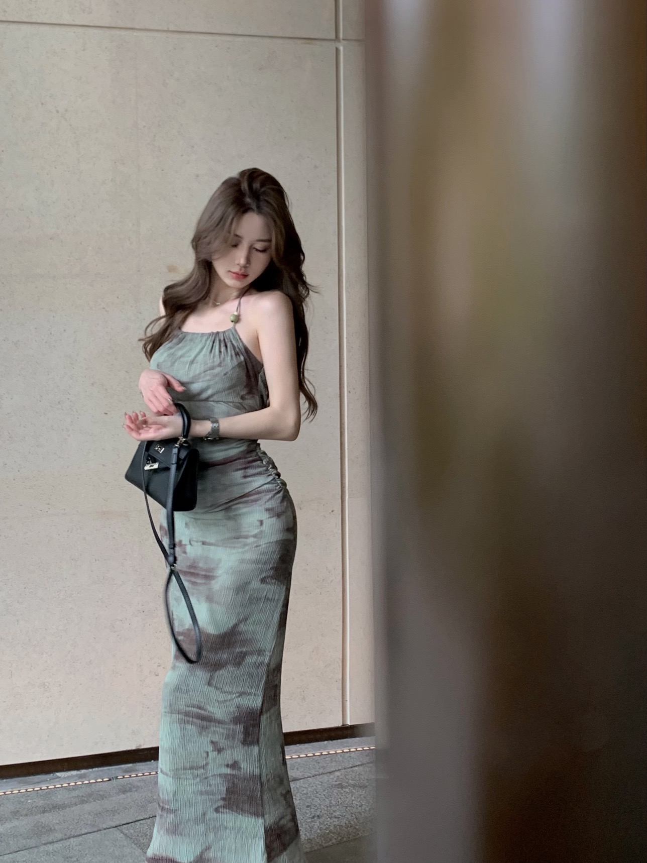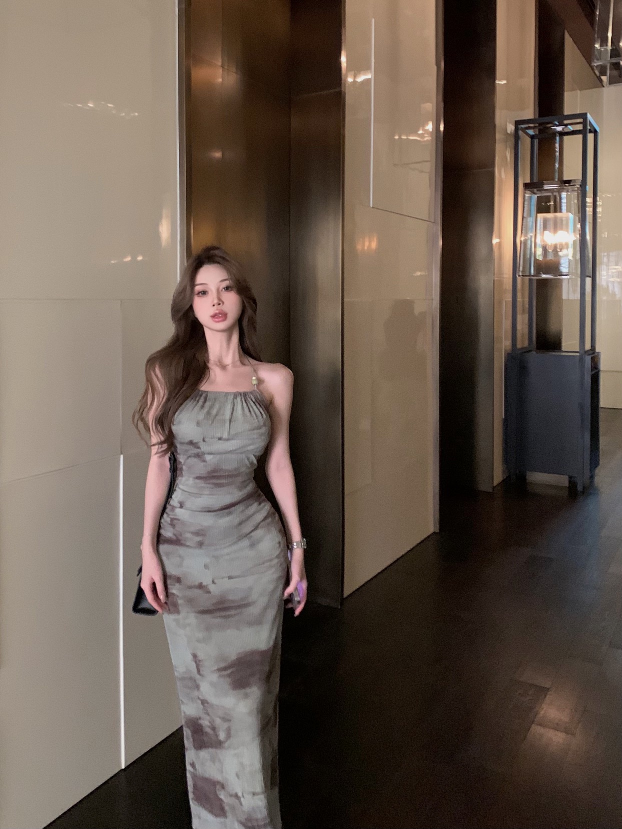 甜辣妹串珠掛頸吊帶洋裝女夏季純欲裙子紮染收腰高級感包臀長裙