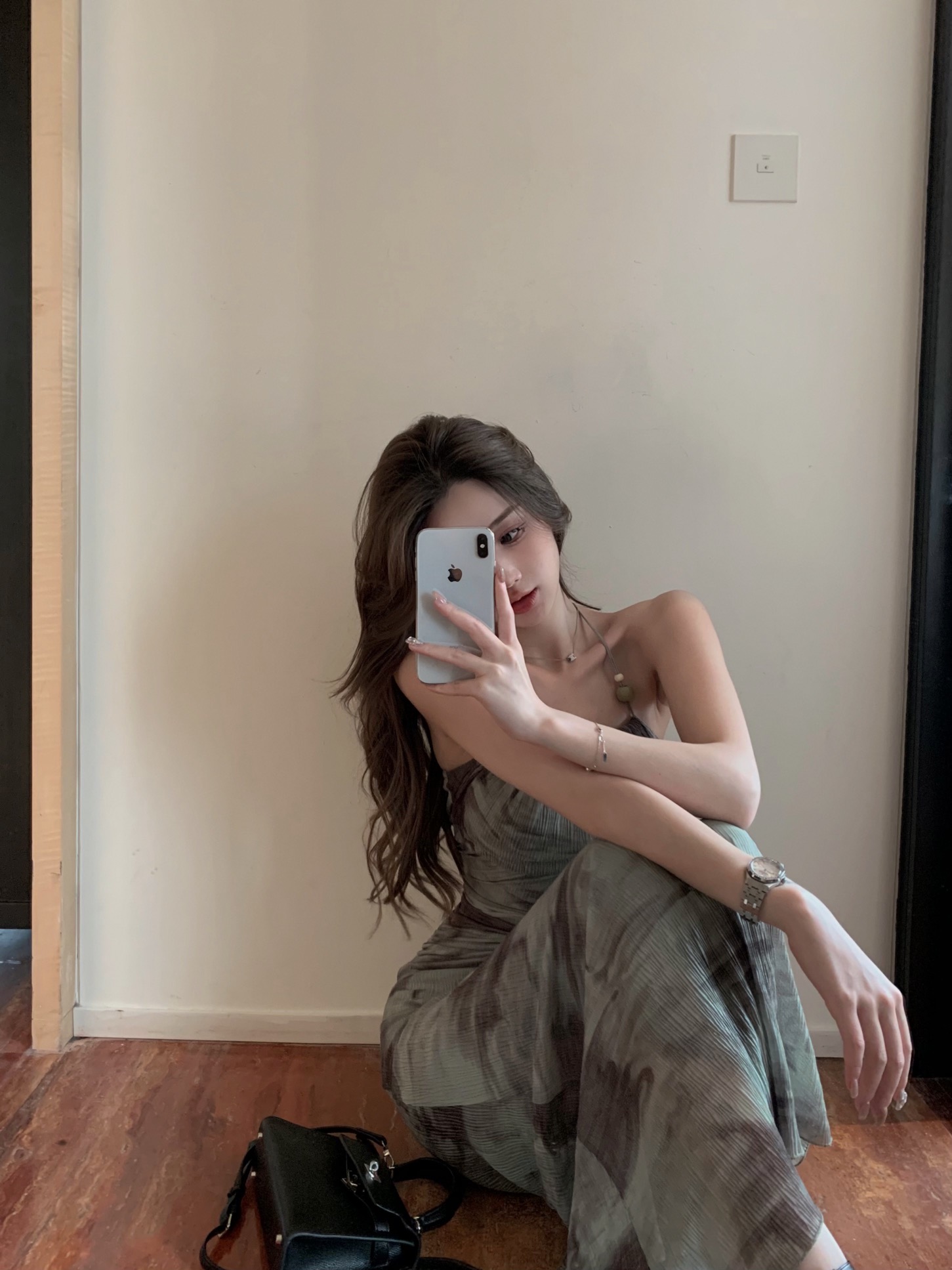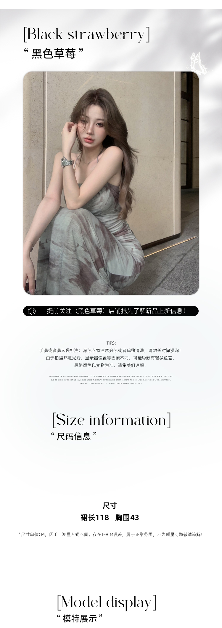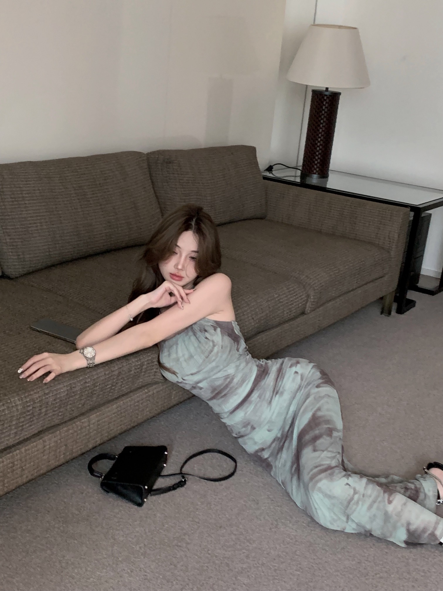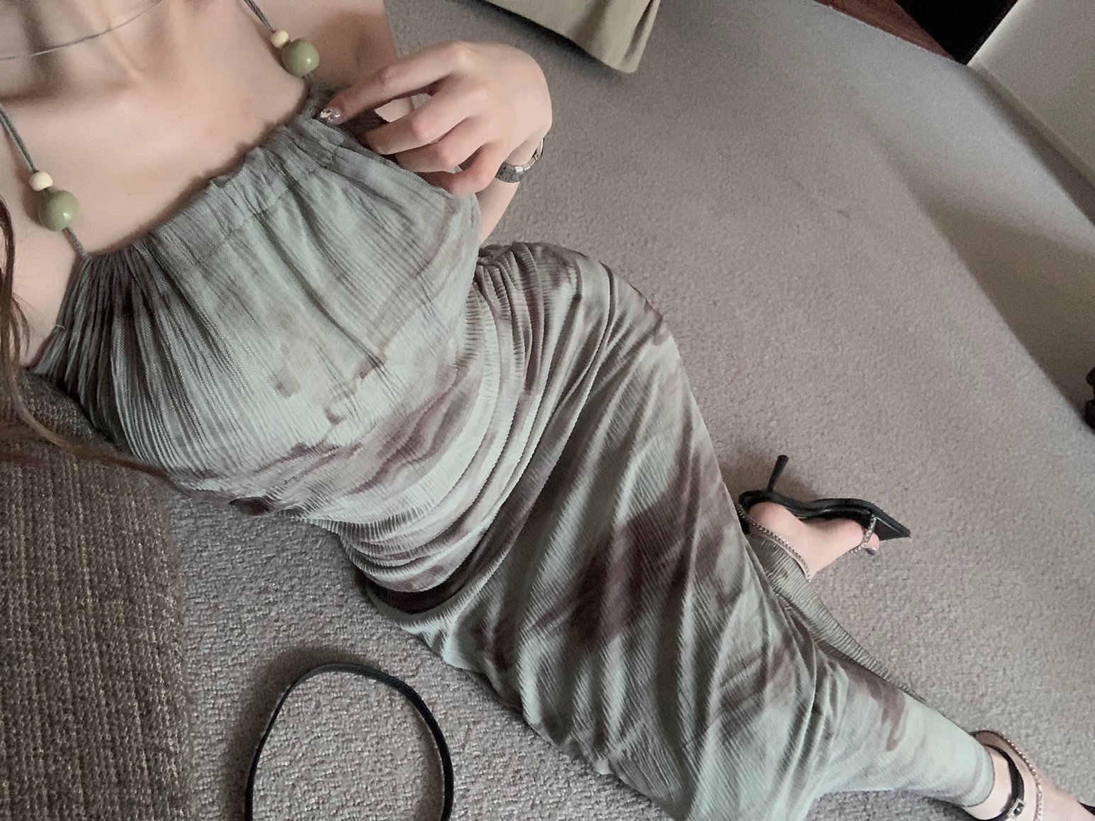 甜辣妹串珠掛頸吊帶洋裝女夏季純欲裙子紮染收腰高級感包臀長裙