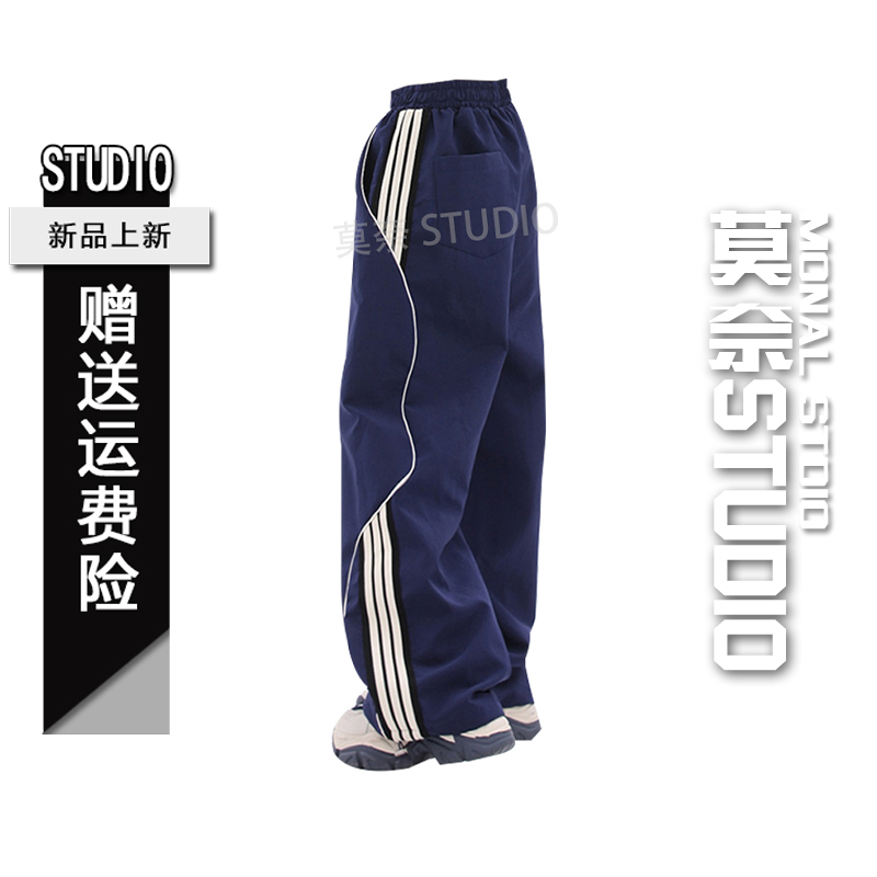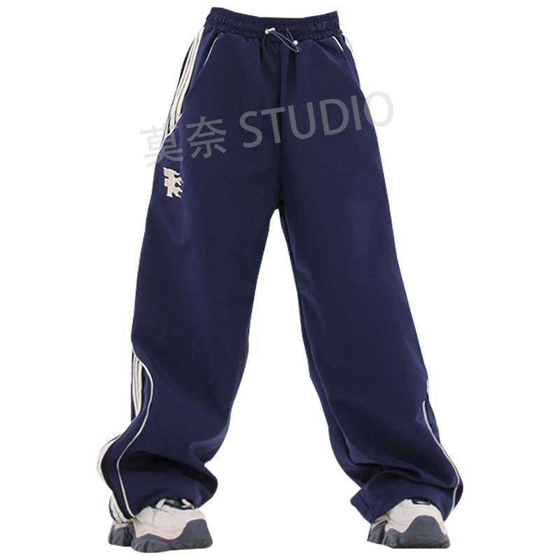 美式復古工裝褲女秋冬藏青色寬鬆休閒褲長褲設計感直筒闊腿運動褲