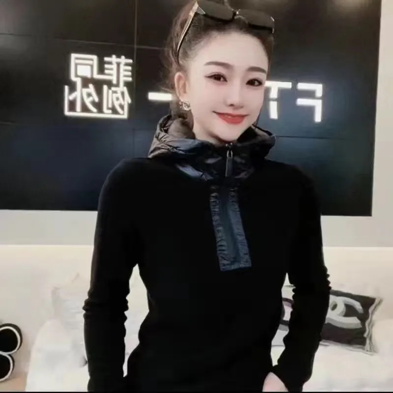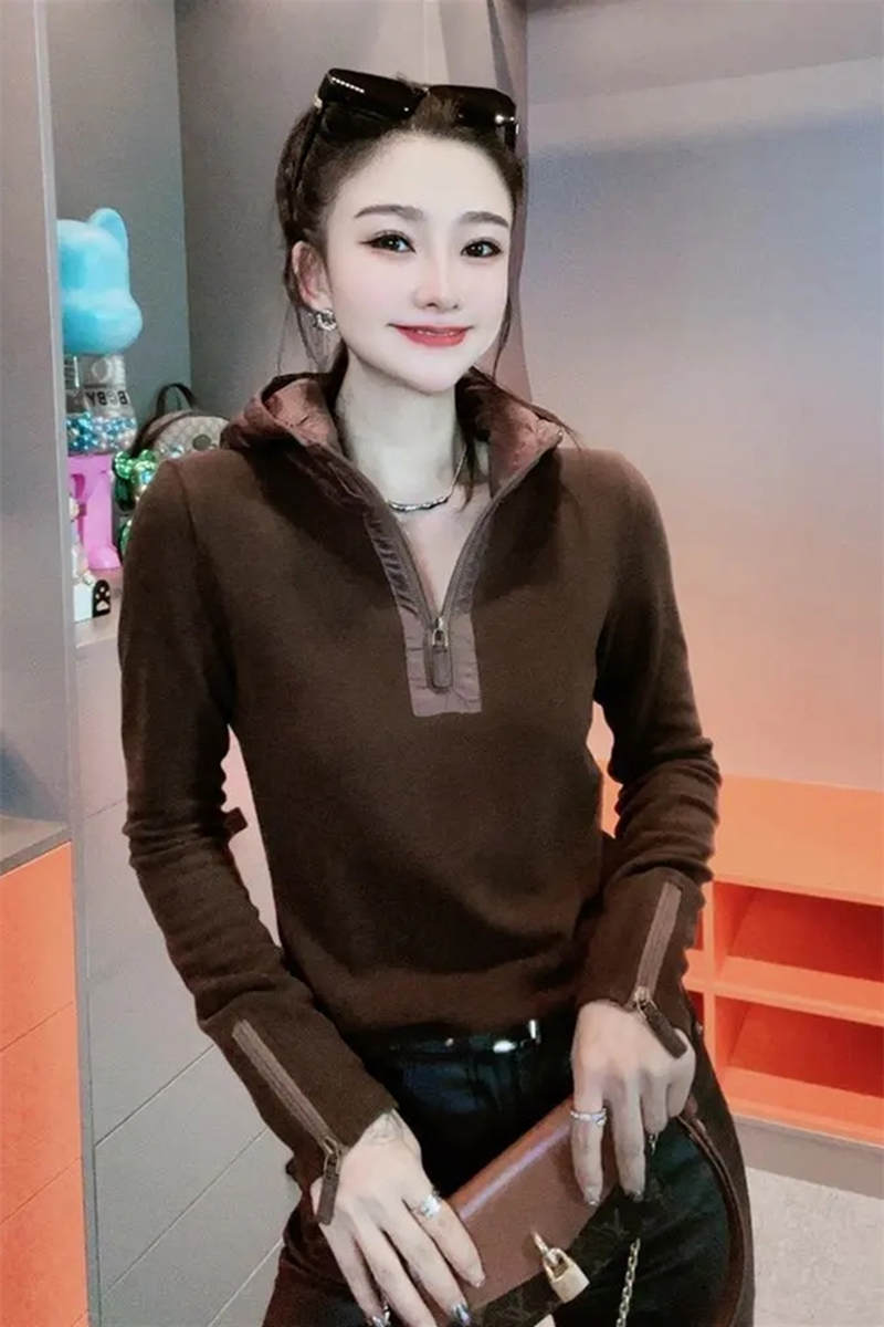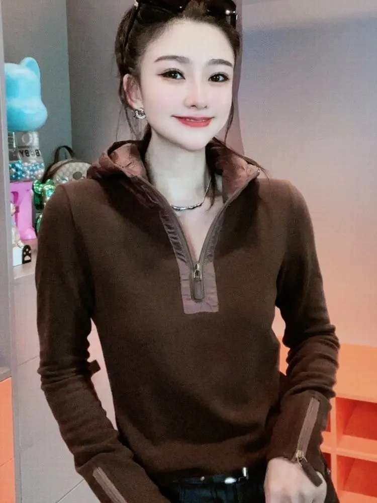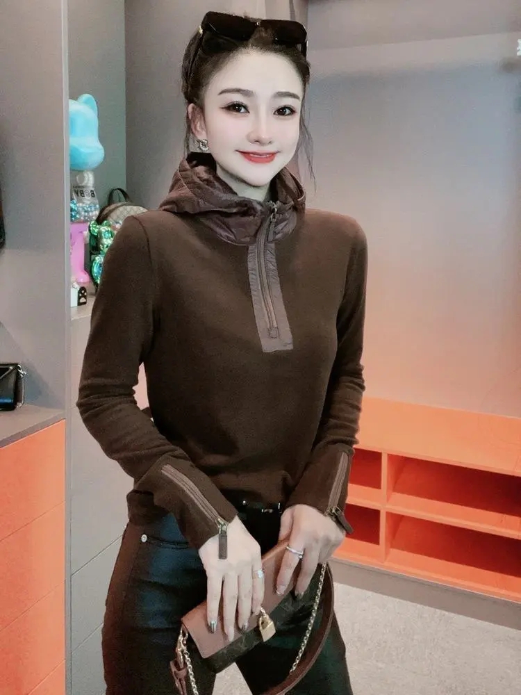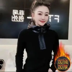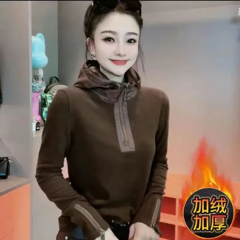 秋冬時尚氣質設計感半拉鍊加絨加厚連帽上衣顯瘦百搭遮肉休閒T恤