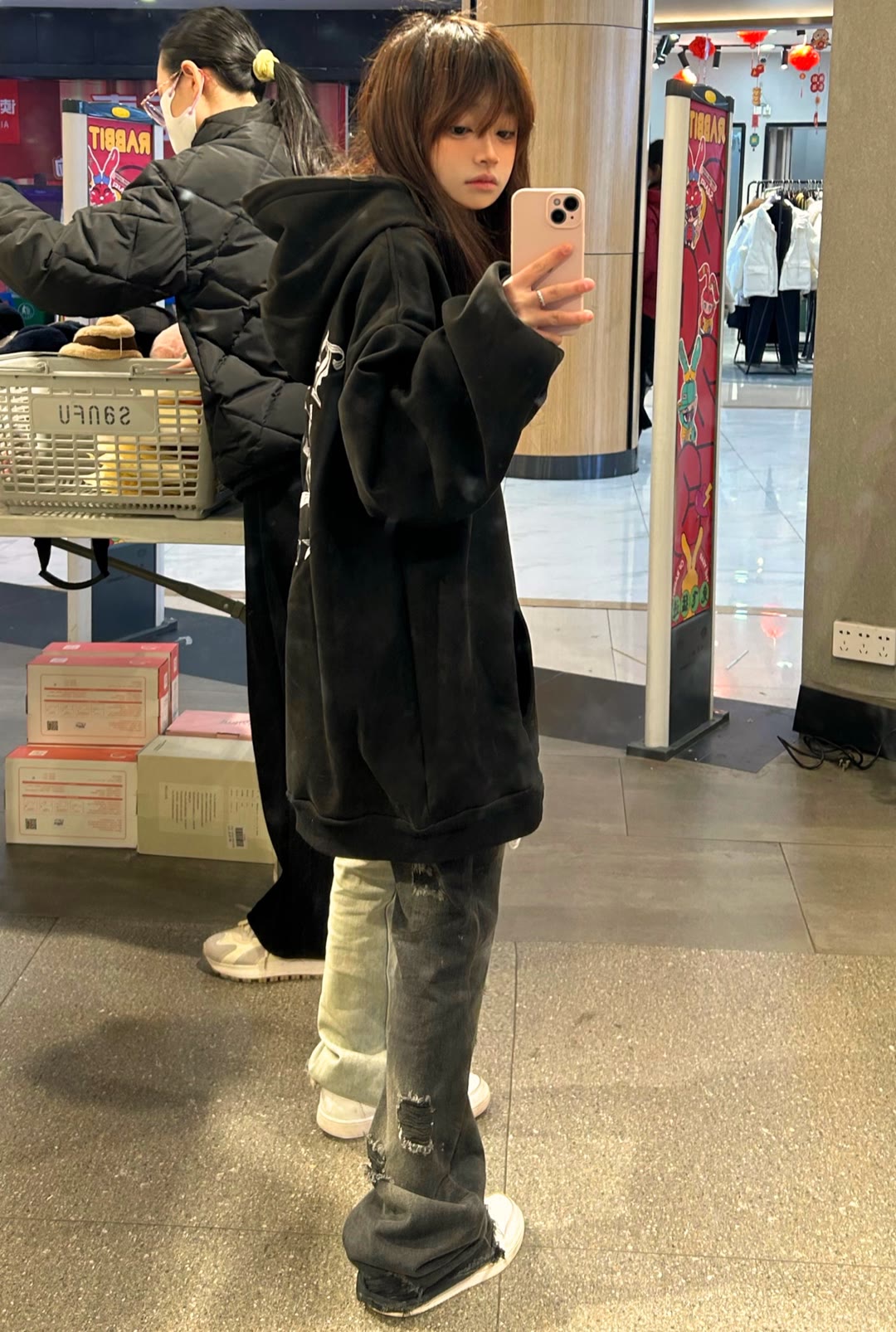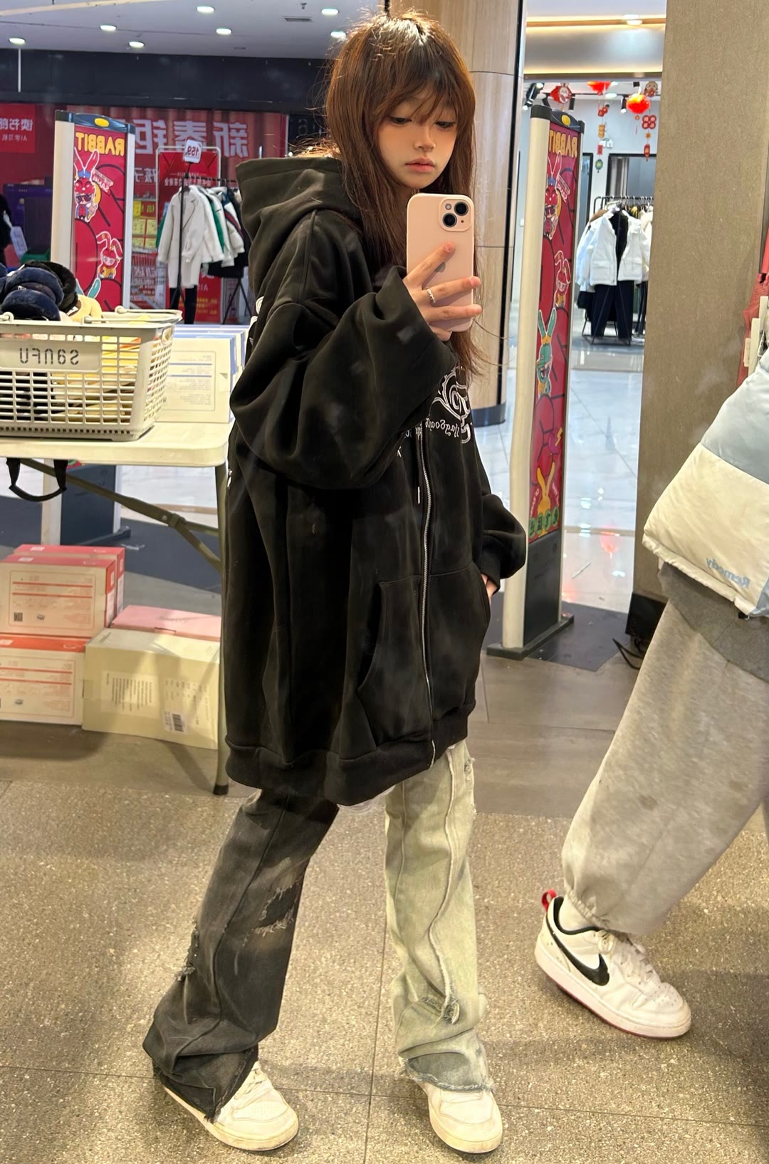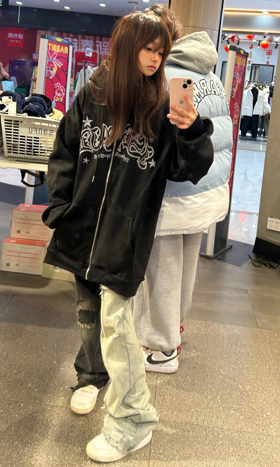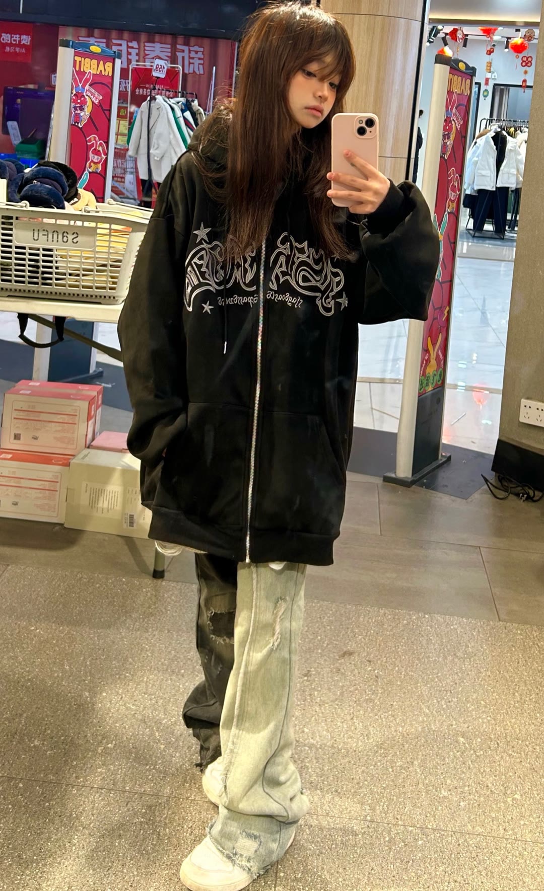 2023春秋季國潮美式oversize黑色開衫拉鍊外套女高街ins寬鬆上衣