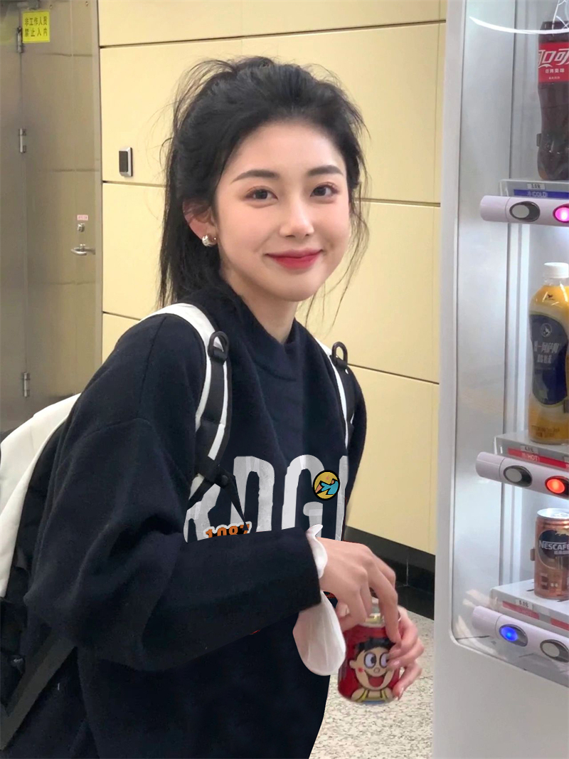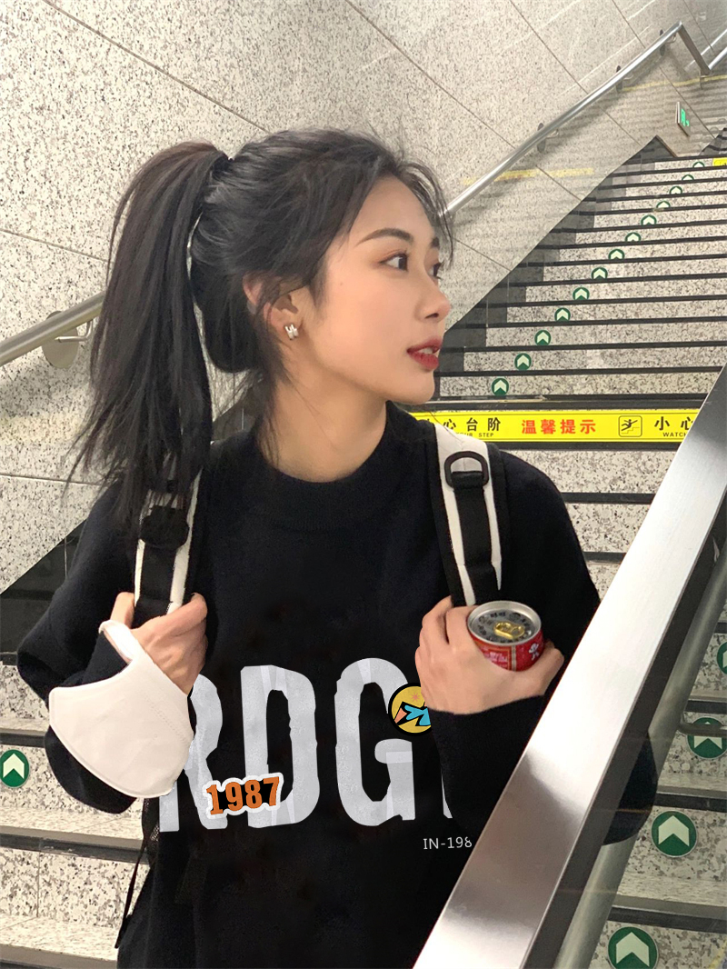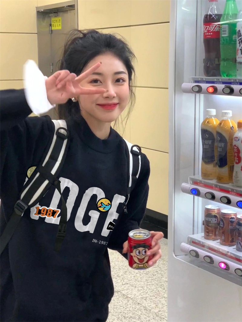 加絨美式復古春秋冬季薄款無帽衛衣女小個子正肩黑色圓領長袖上衣