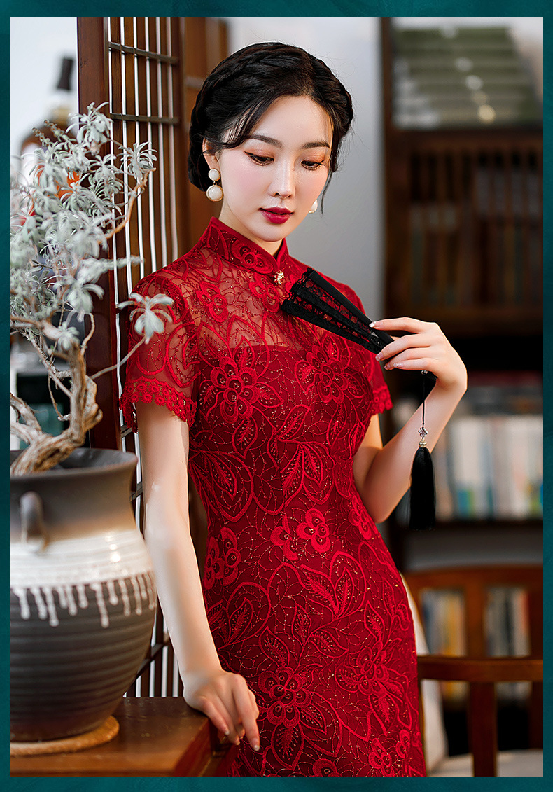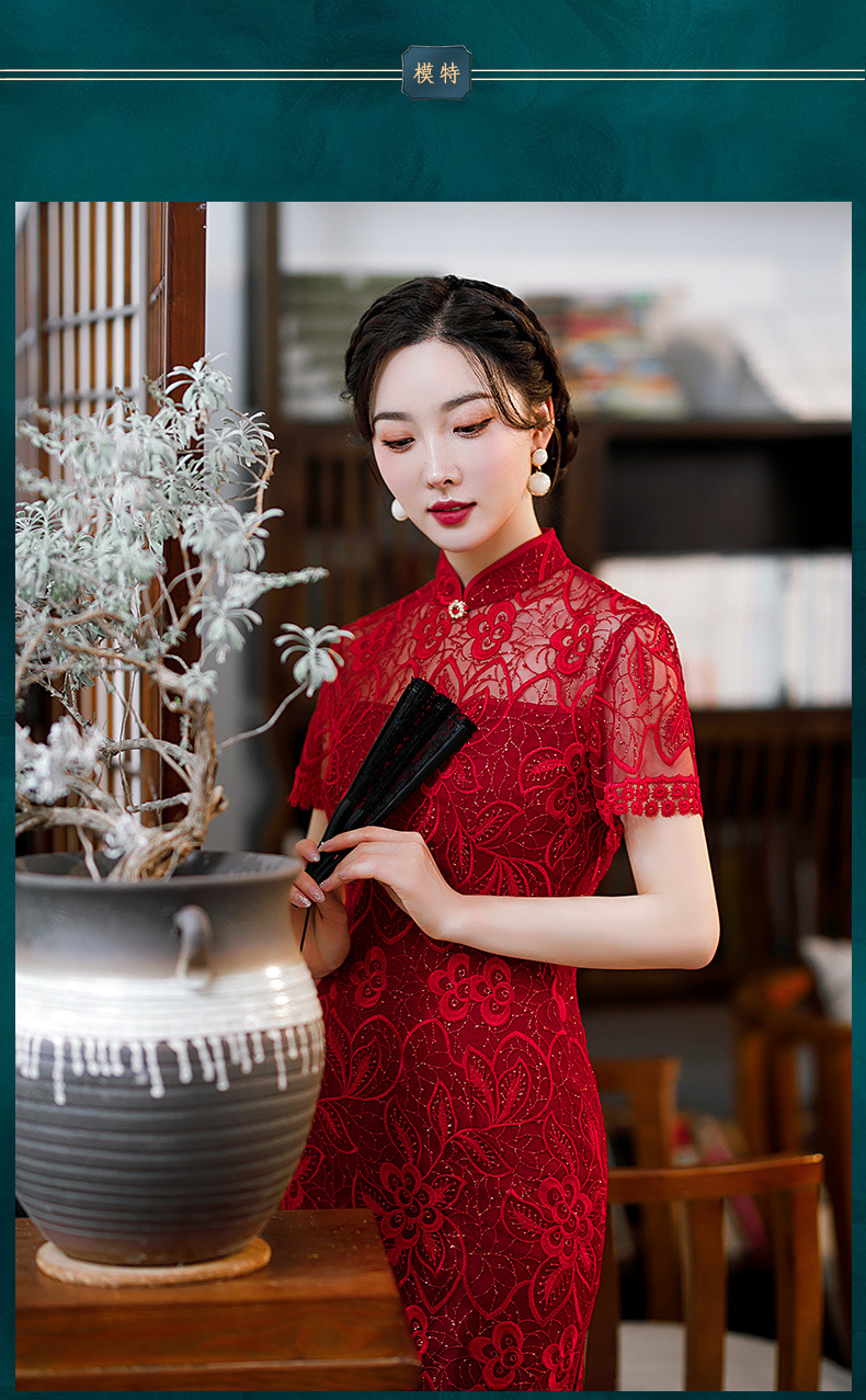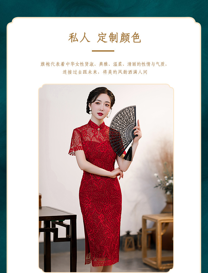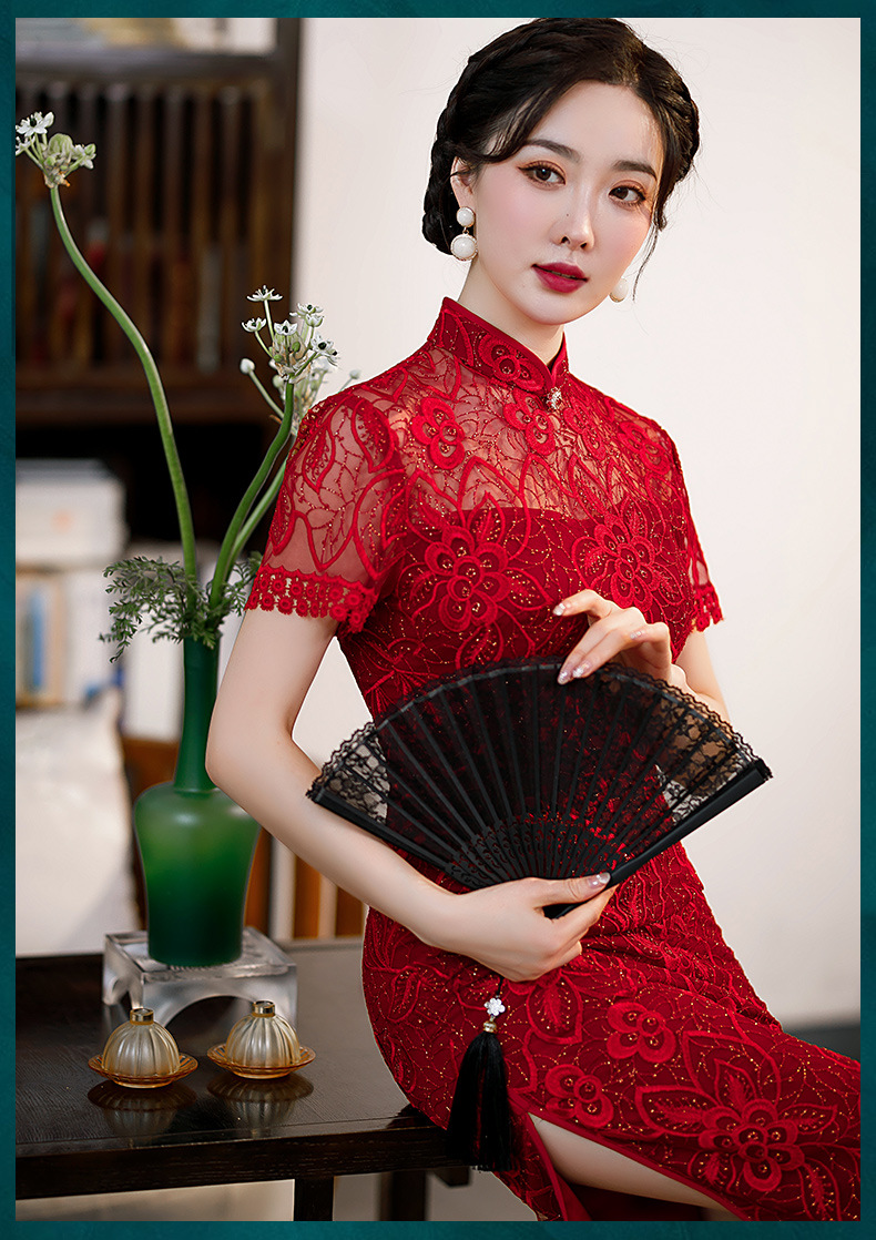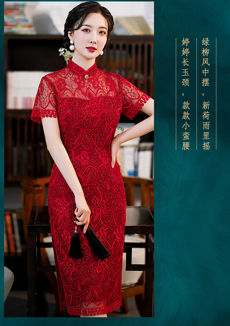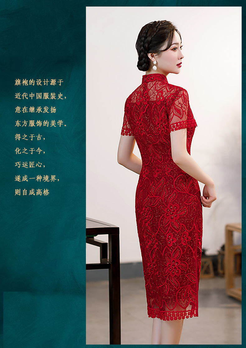 时尚亮片修身蕾丝红色旗袍气质刺绣晚礼服新娘敬酒连衣裙夏B1021
