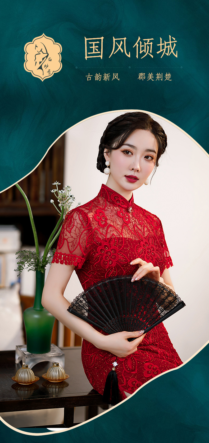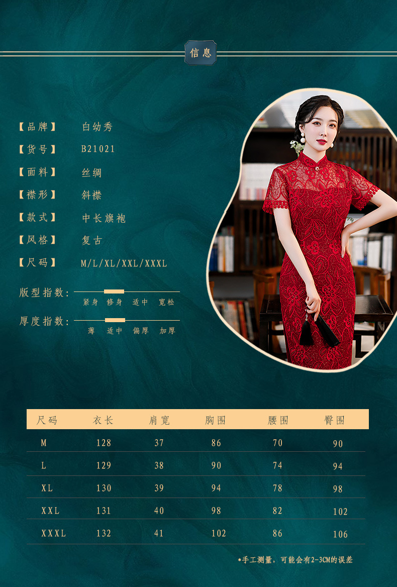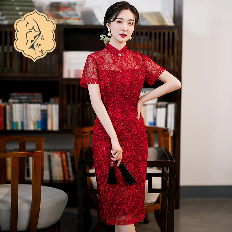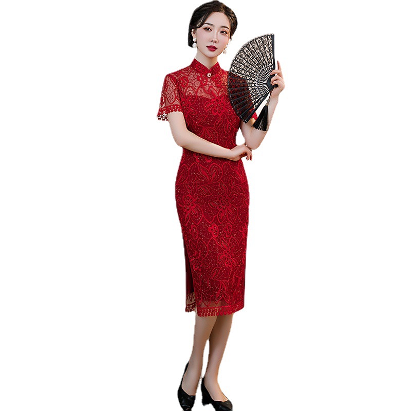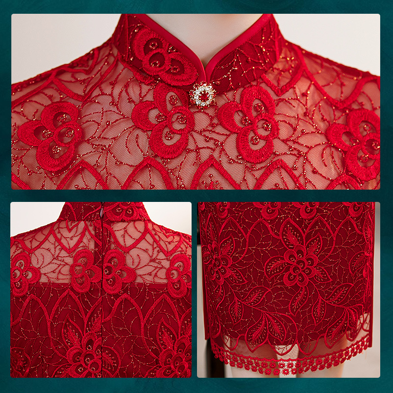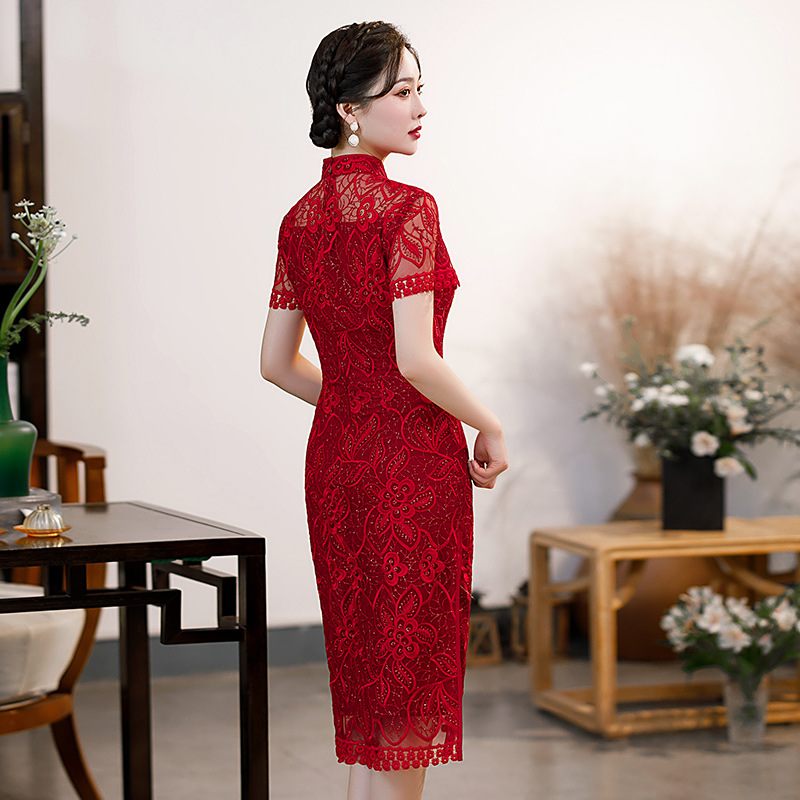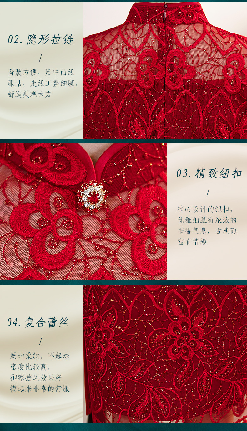 时尚亮片修身蕾丝红色旗袍气质刺绣晚礼服新娘敬酒连衣裙夏B1021