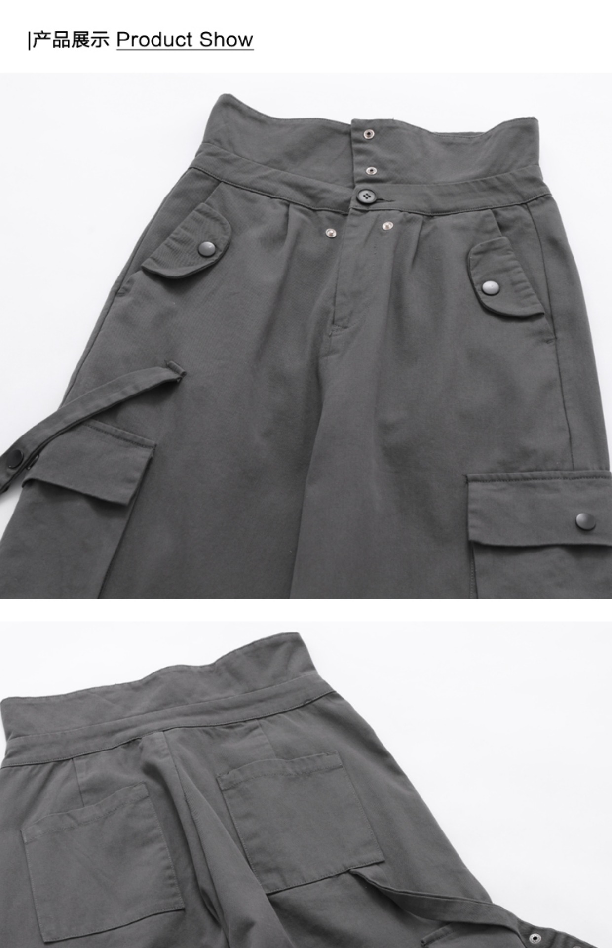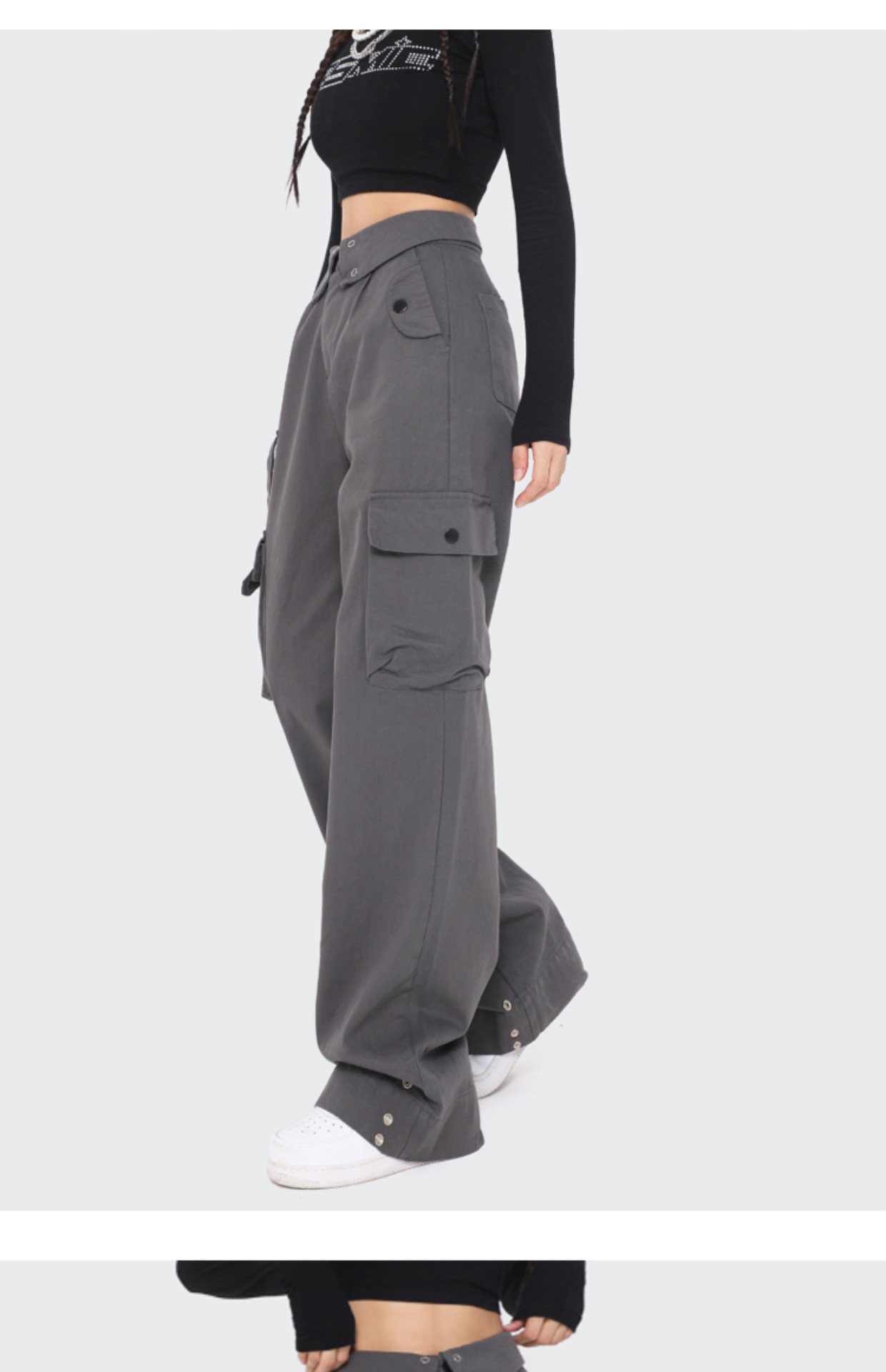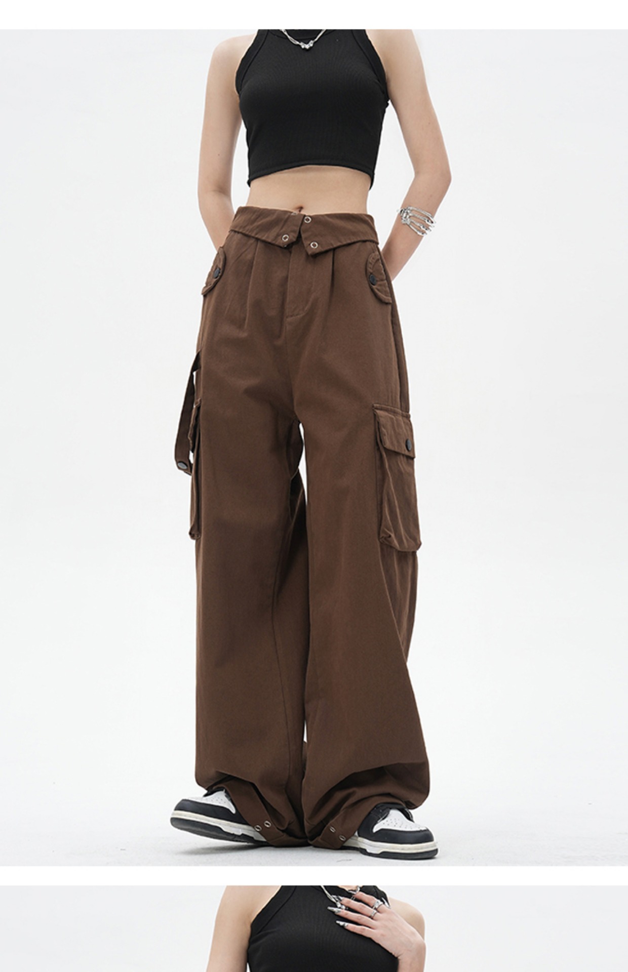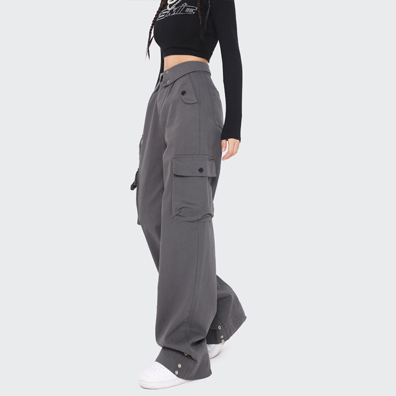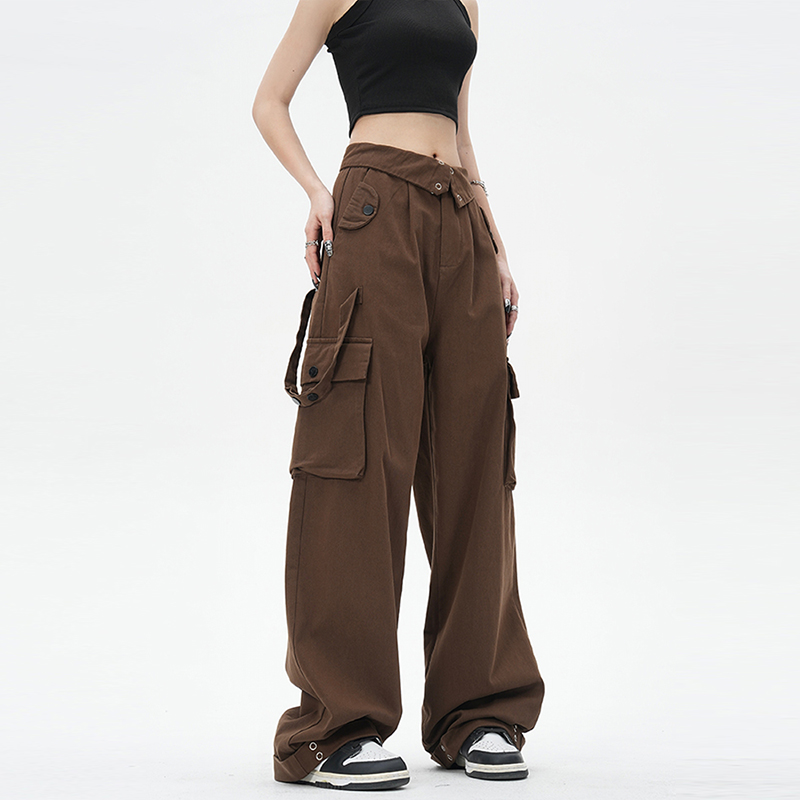 YOOTDS美式復古街頭工裝褲女夏季高腰ins潮牌寬鬆闊腿休閒長褲子