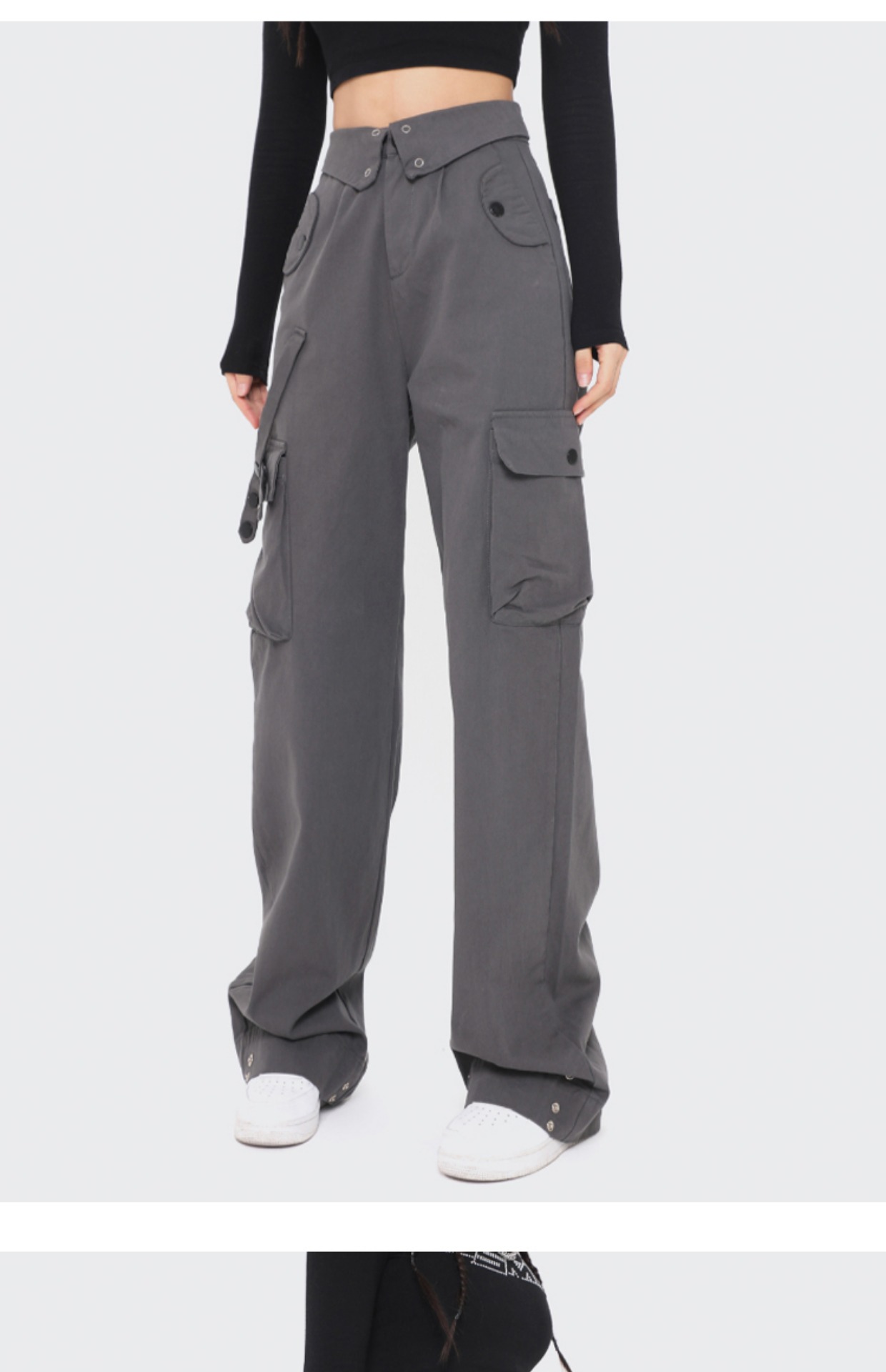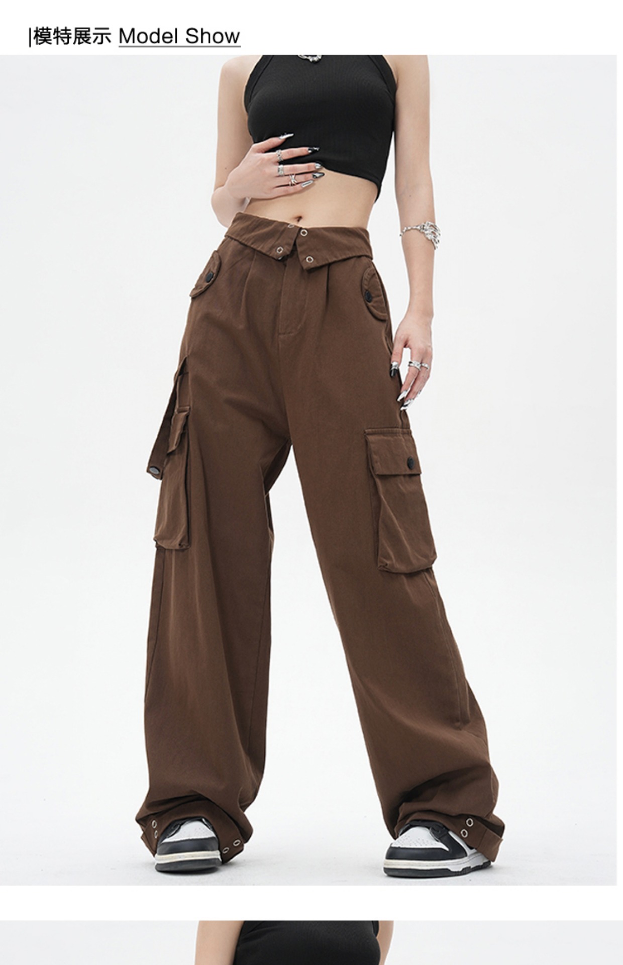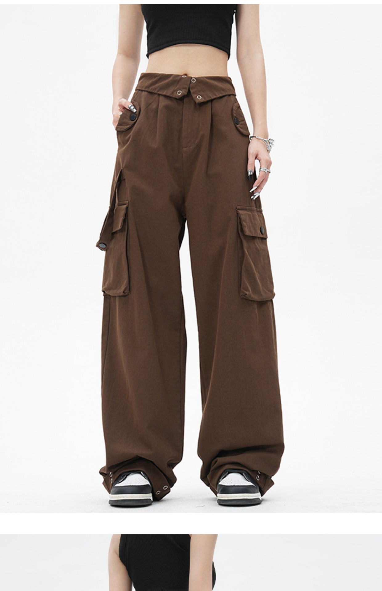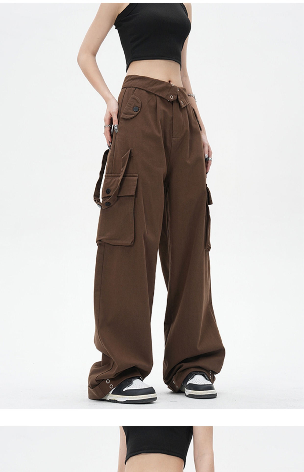 YOOTDS美式復古街頭工裝褲女夏季高腰ins潮牌寬鬆闊腿休閒長褲子