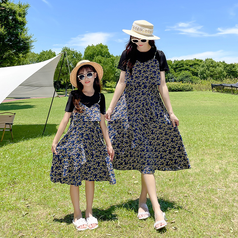 母女装亲子装连衣裙夏装2023新款假两件碎花裙女童短袖洋气公主裙