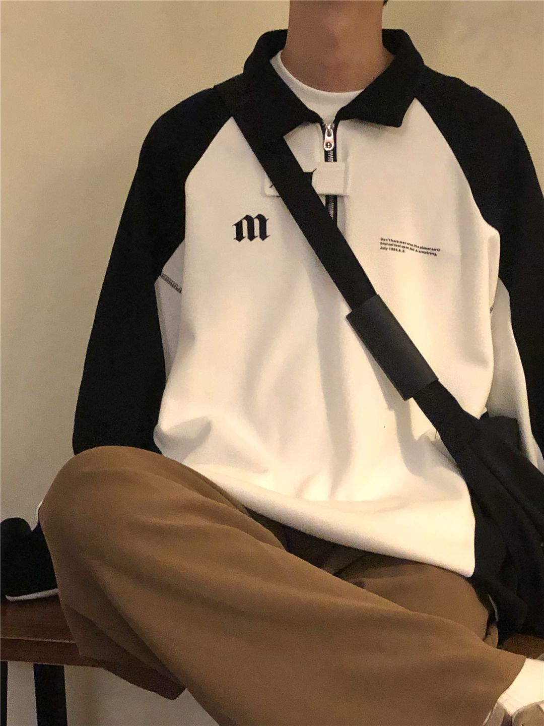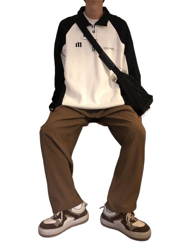 春秋新款POLO長袖厚棉T男oversize寬鬆美式復古學院半拉鍊撞色上衣