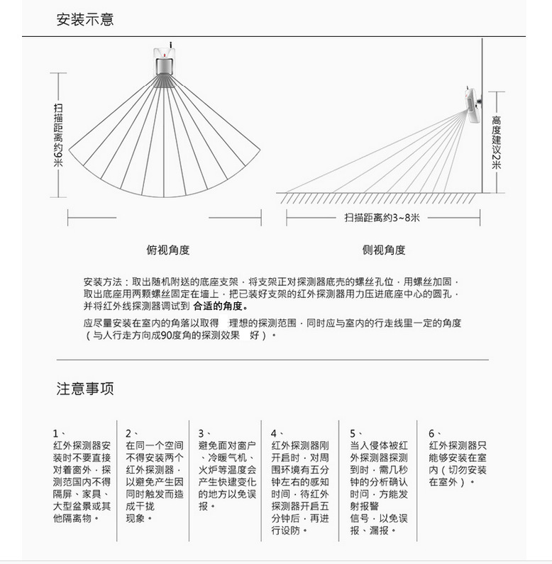 产品简介:本产品集探测、接收、报警于一体,当它发现被监视区域中有人活动,立刻会发出警笛声报警,以提醒主人注意或恐吓非法入侵者。适用于家庭、商店、厂矿企业、仓库、写字楼等场所安全保护,误入危险地区示警,商店营业场所来客报知及外出旅游时防范等。