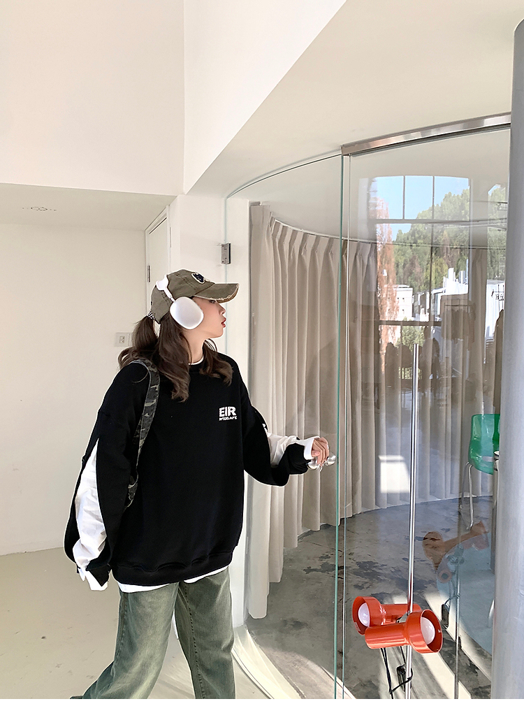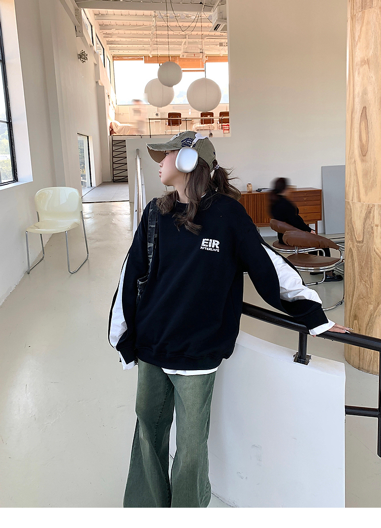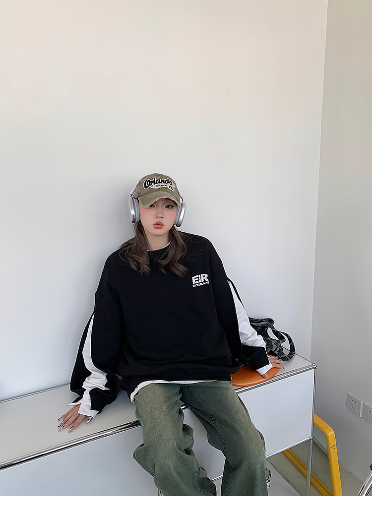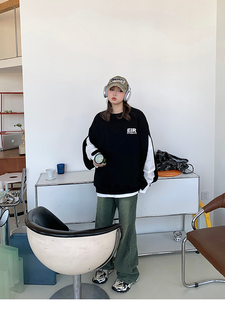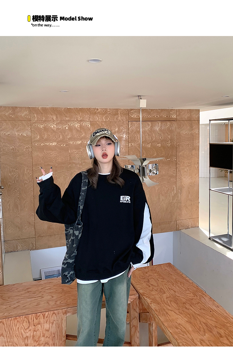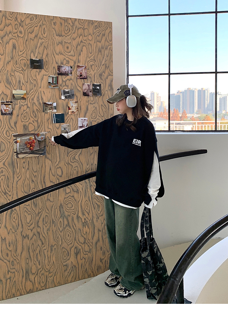 設計感小眾假兩件衛衣女春秋款2023新款春裝寬鬆黑色圓領上衣ins