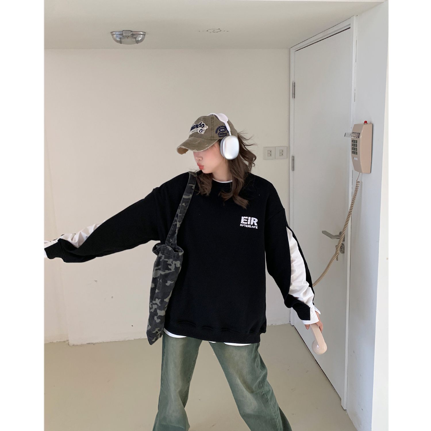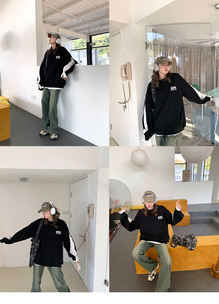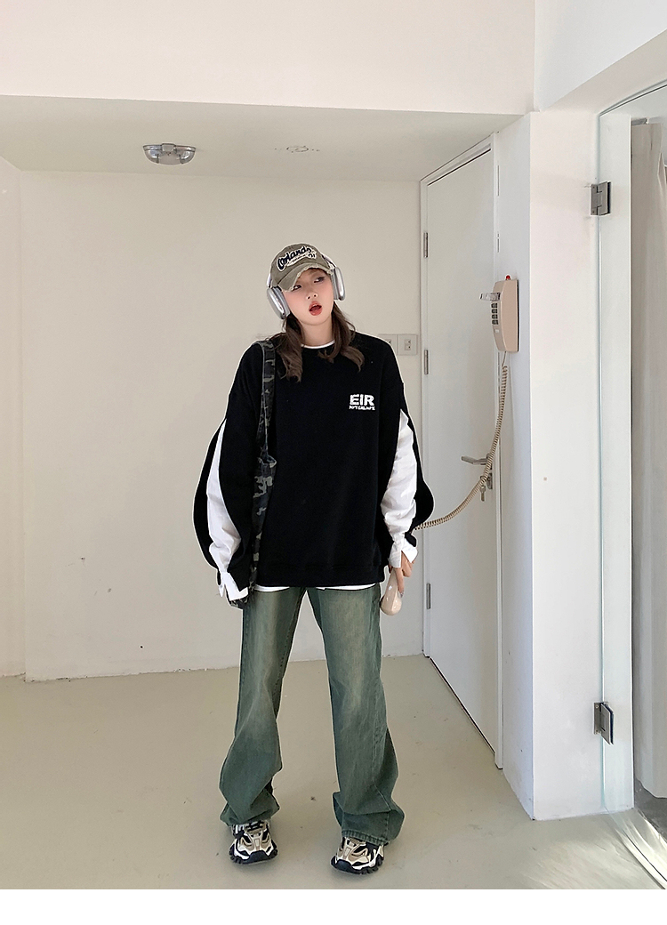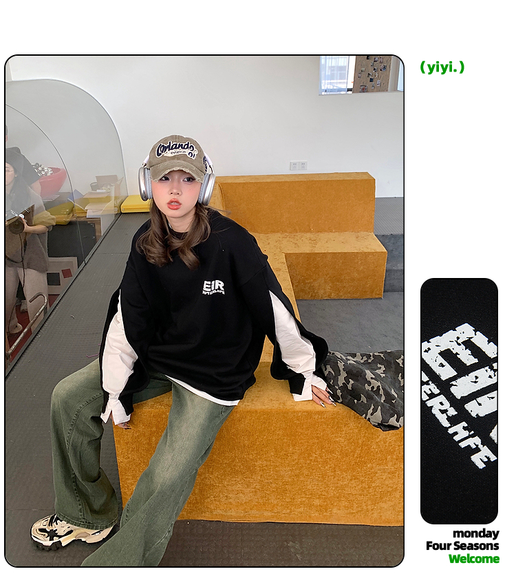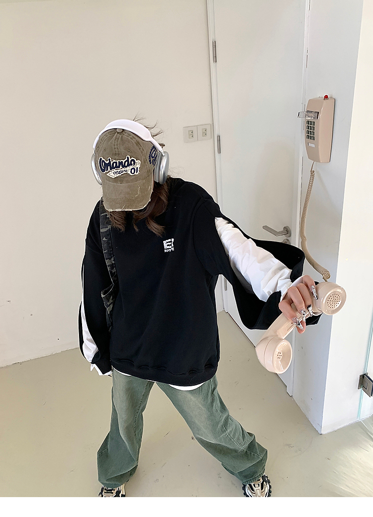 設計感小眾假兩件衛衣女春秋款2023新款春裝寬鬆黑色圓領上衣ins