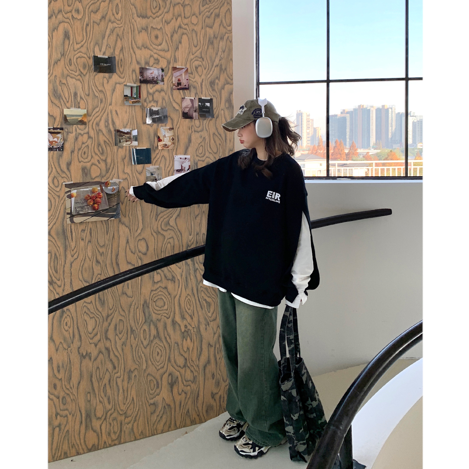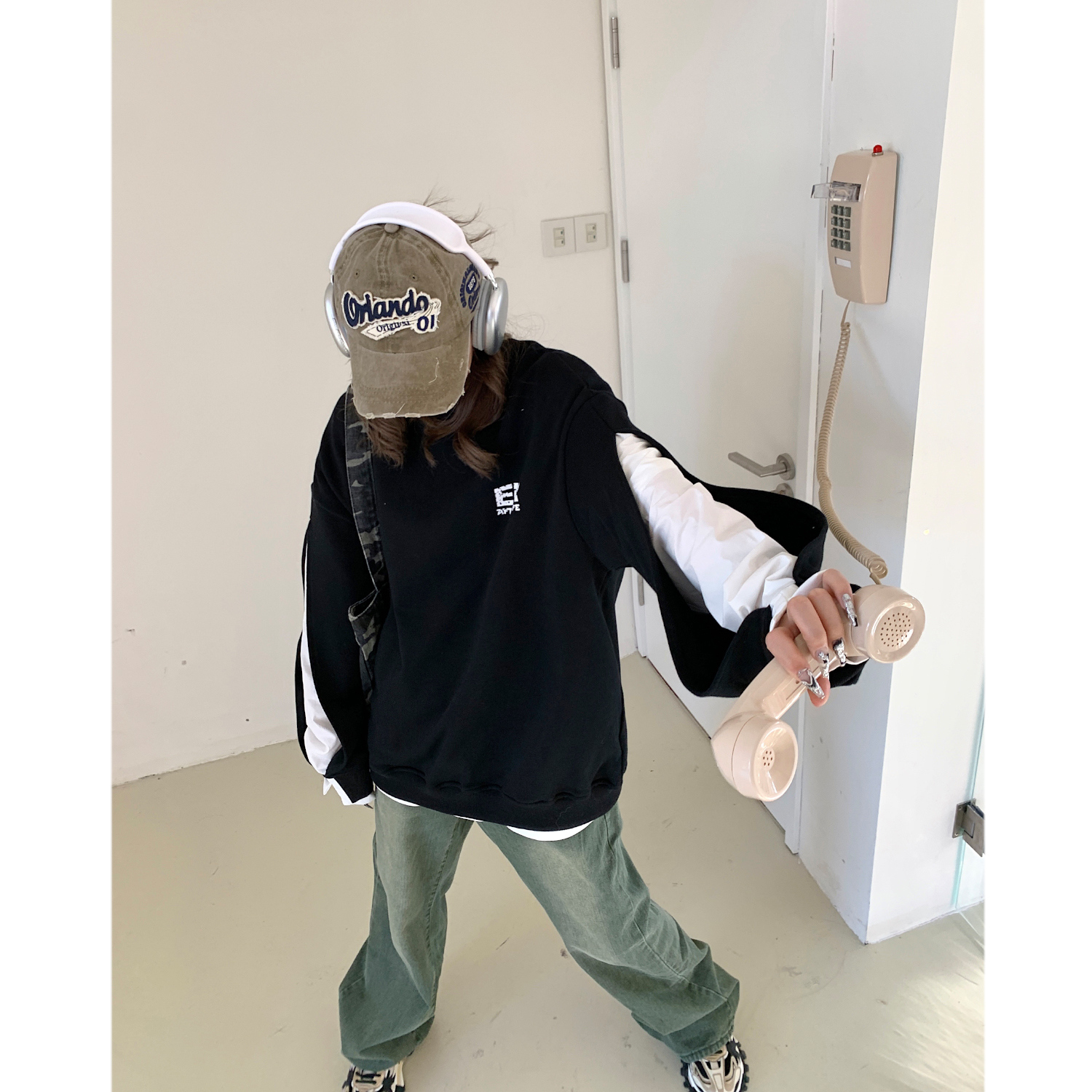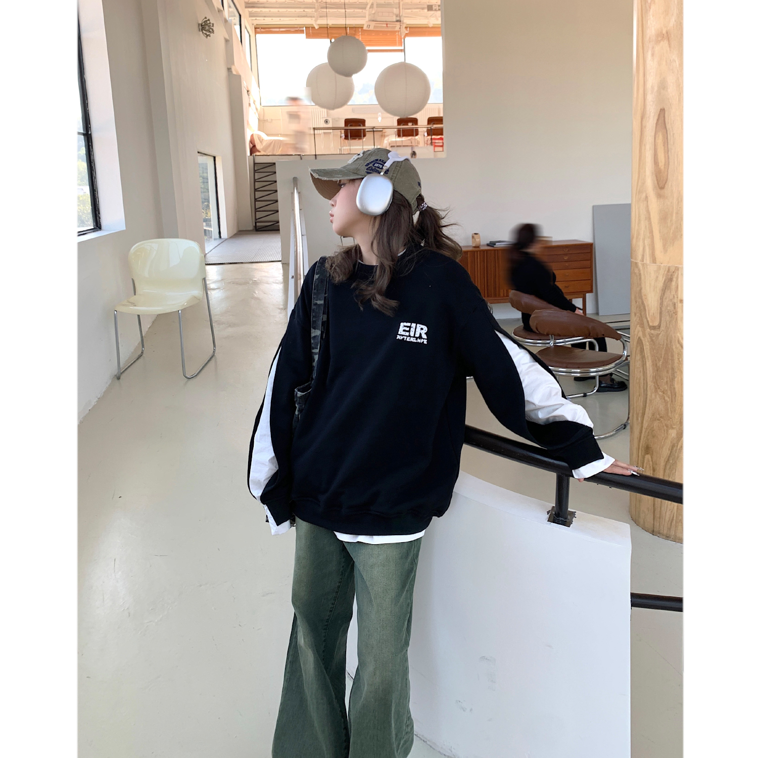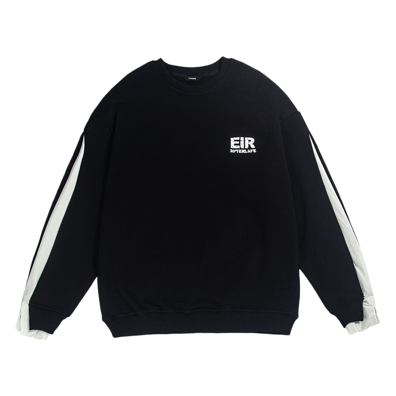 設計感小眾假兩件衛衣女春秋款2023新款春裝寬鬆黑色圓領上衣ins