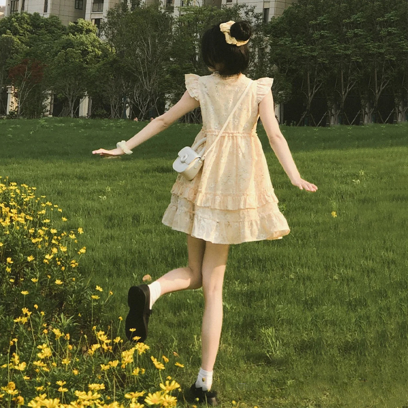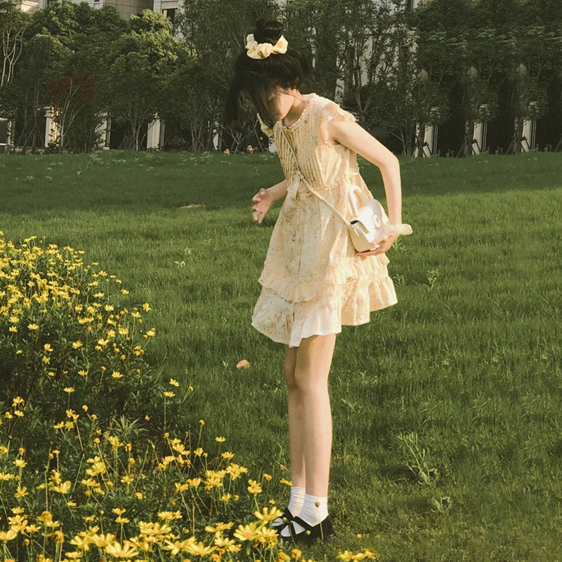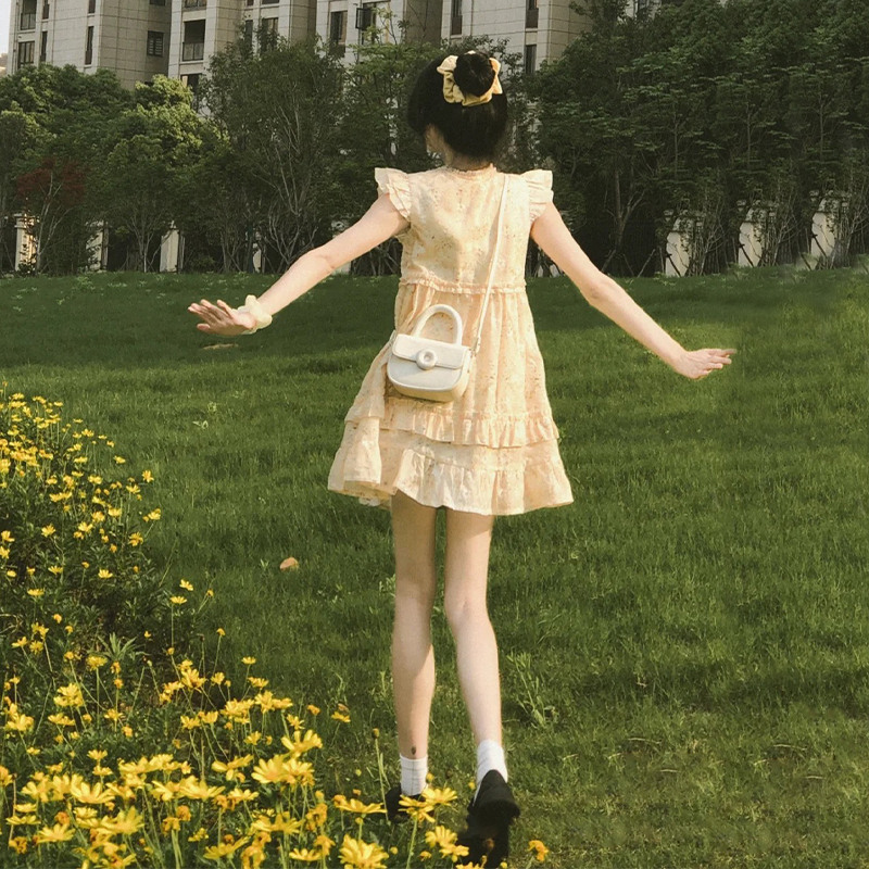 法式碎花1/4吋套筒扳手袖洋裝女夏季新款小個子寬鬆顯瘦休閒裙子a字短裙
