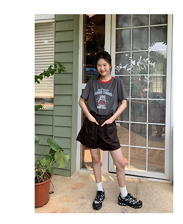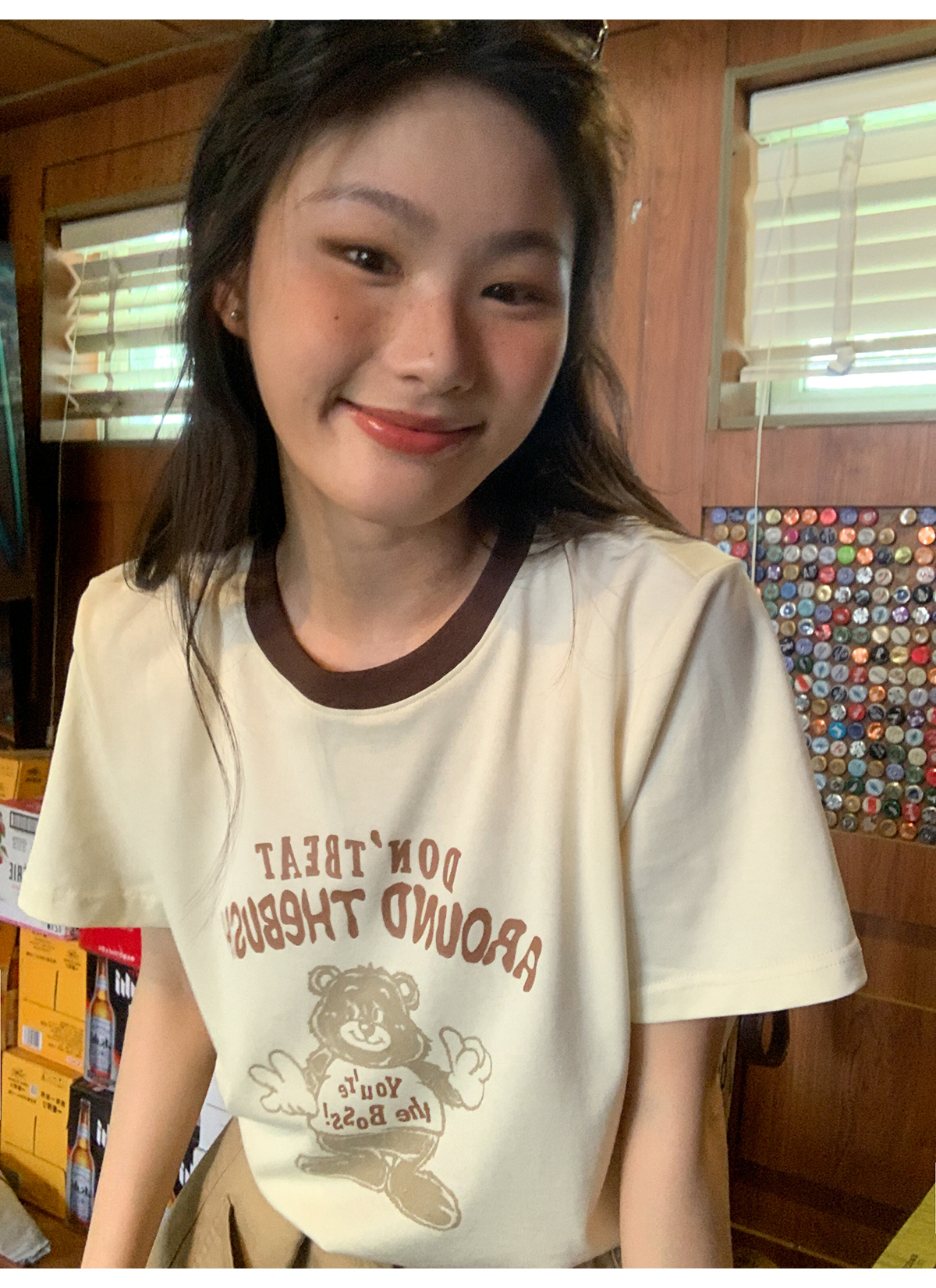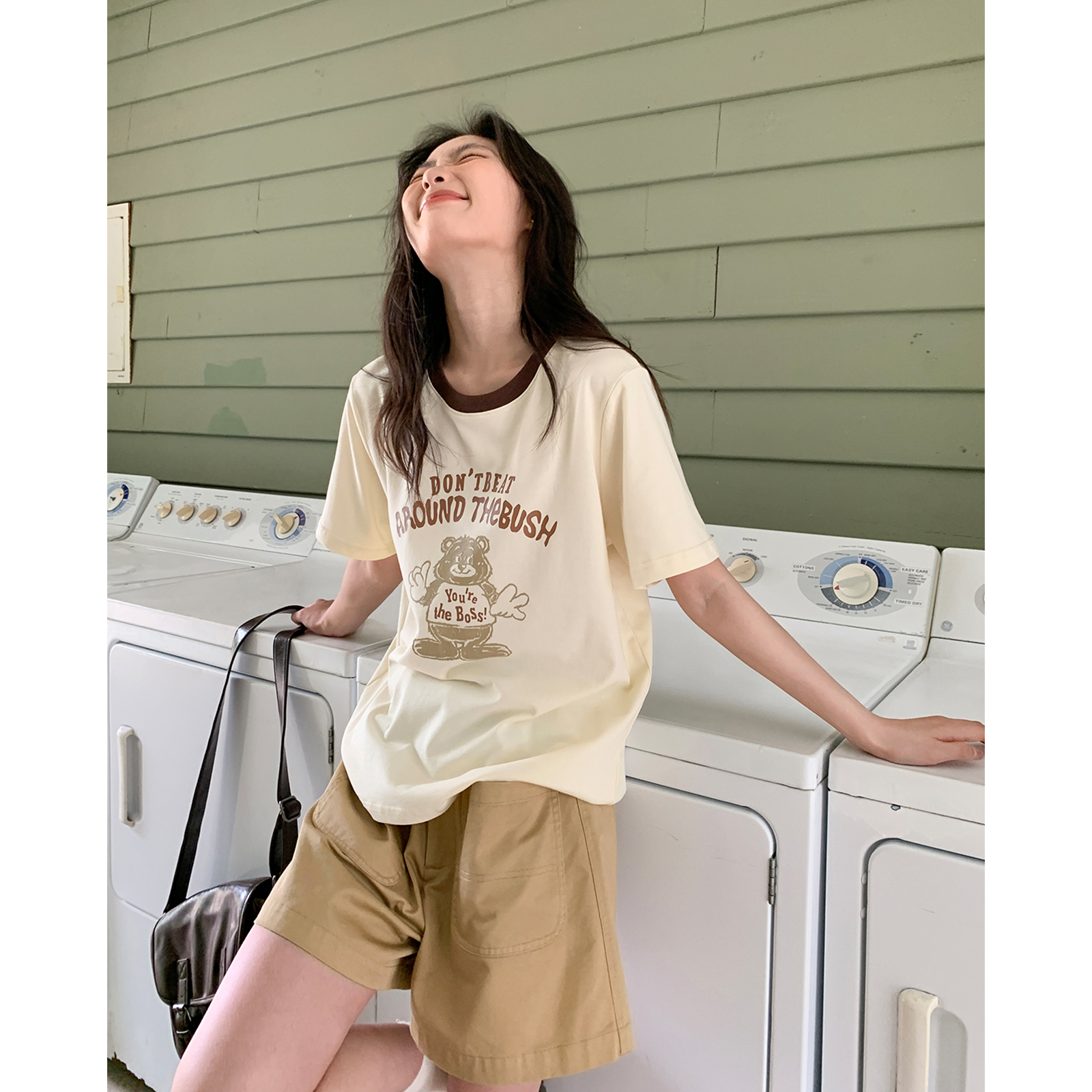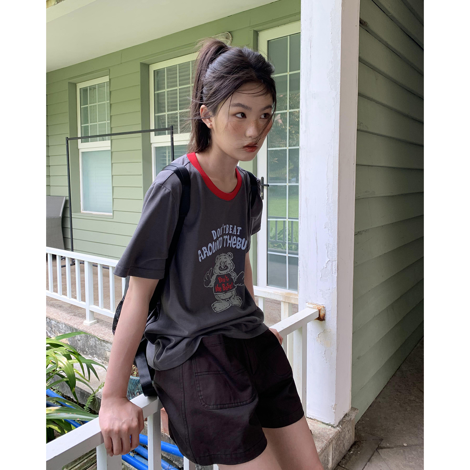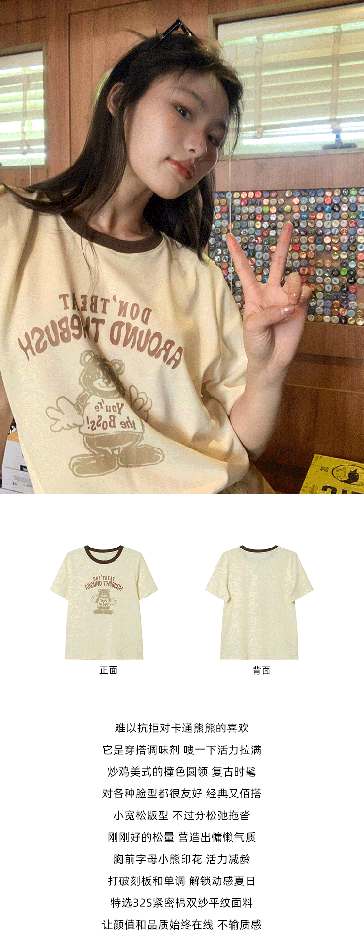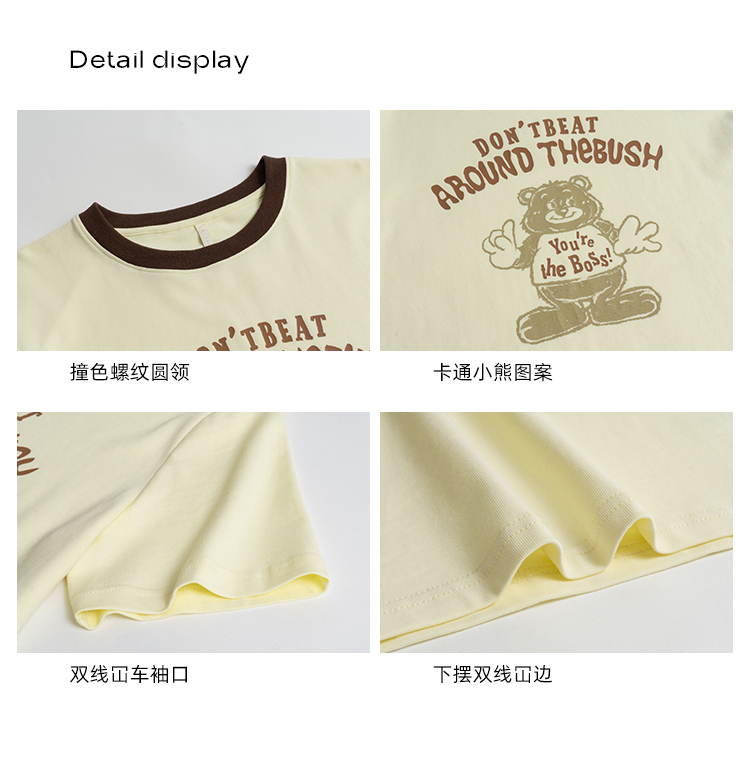 你好卡農 原創小熊印花撞色圓領短袖T恤女2023新款寬鬆T恤上衣夏