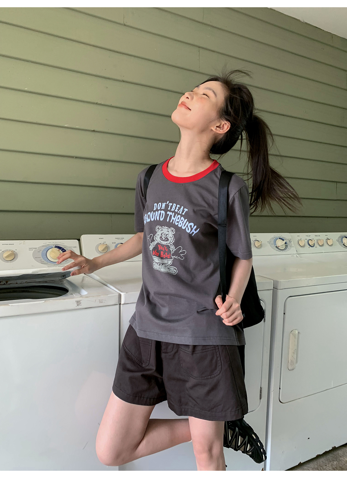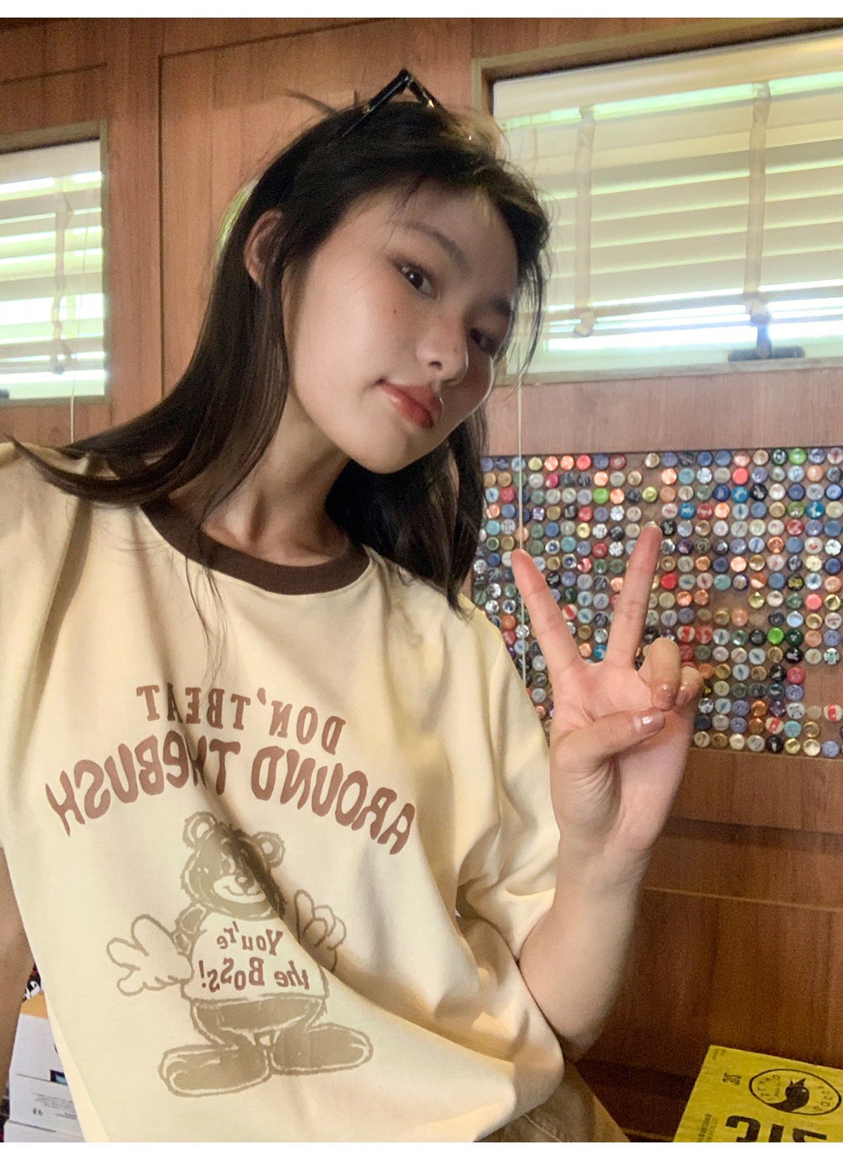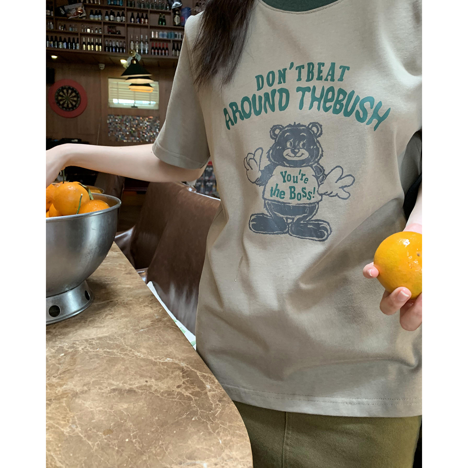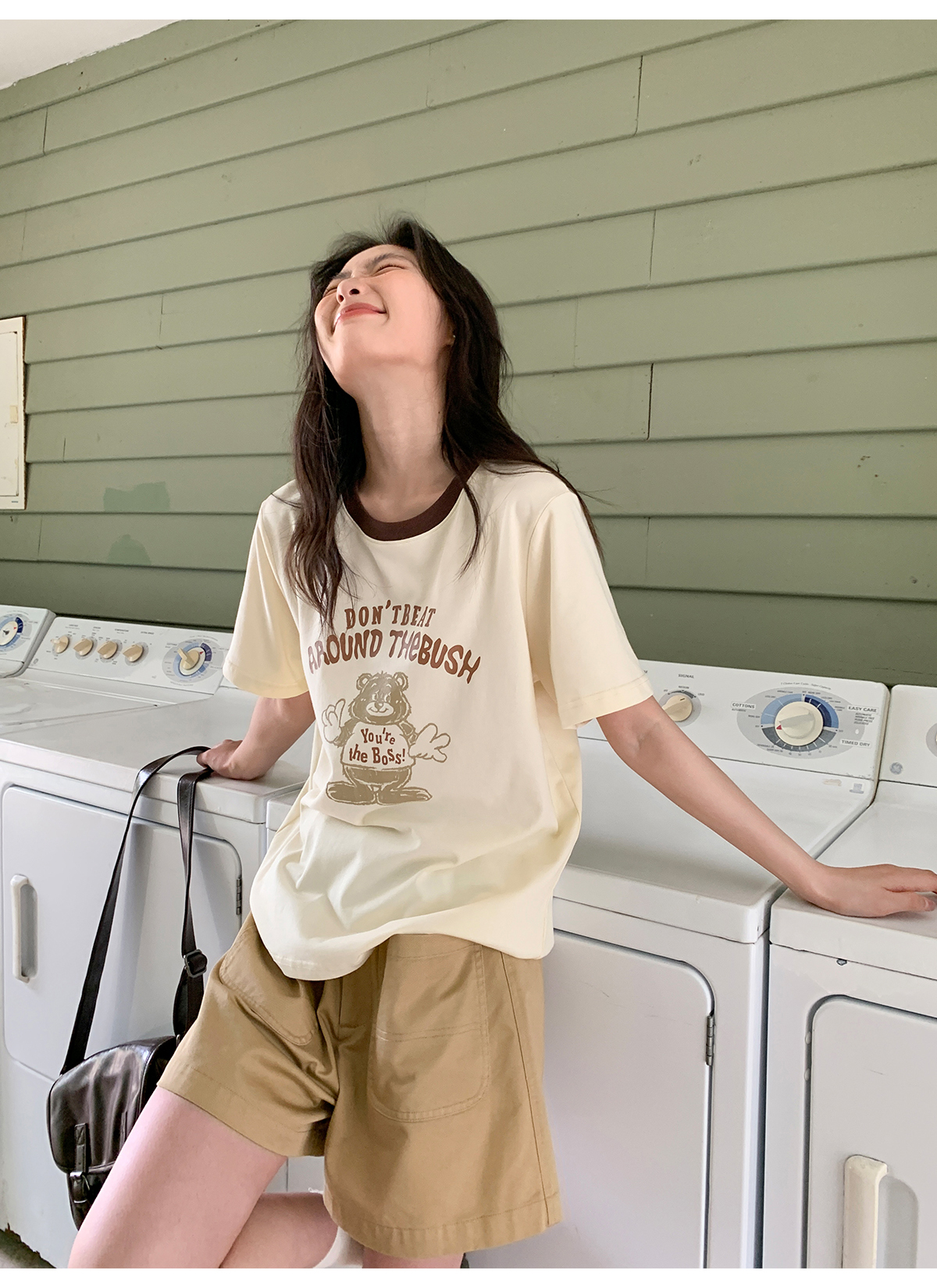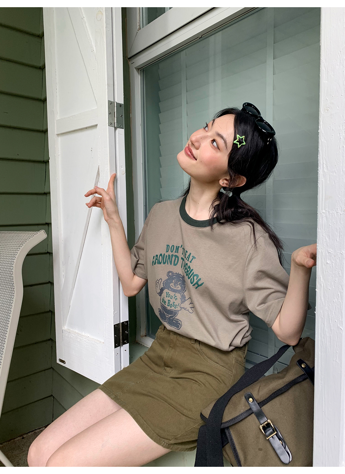 你好卡農 原創小熊印花撞色圓領短袖T恤女2023新款寬鬆T恤上衣夏