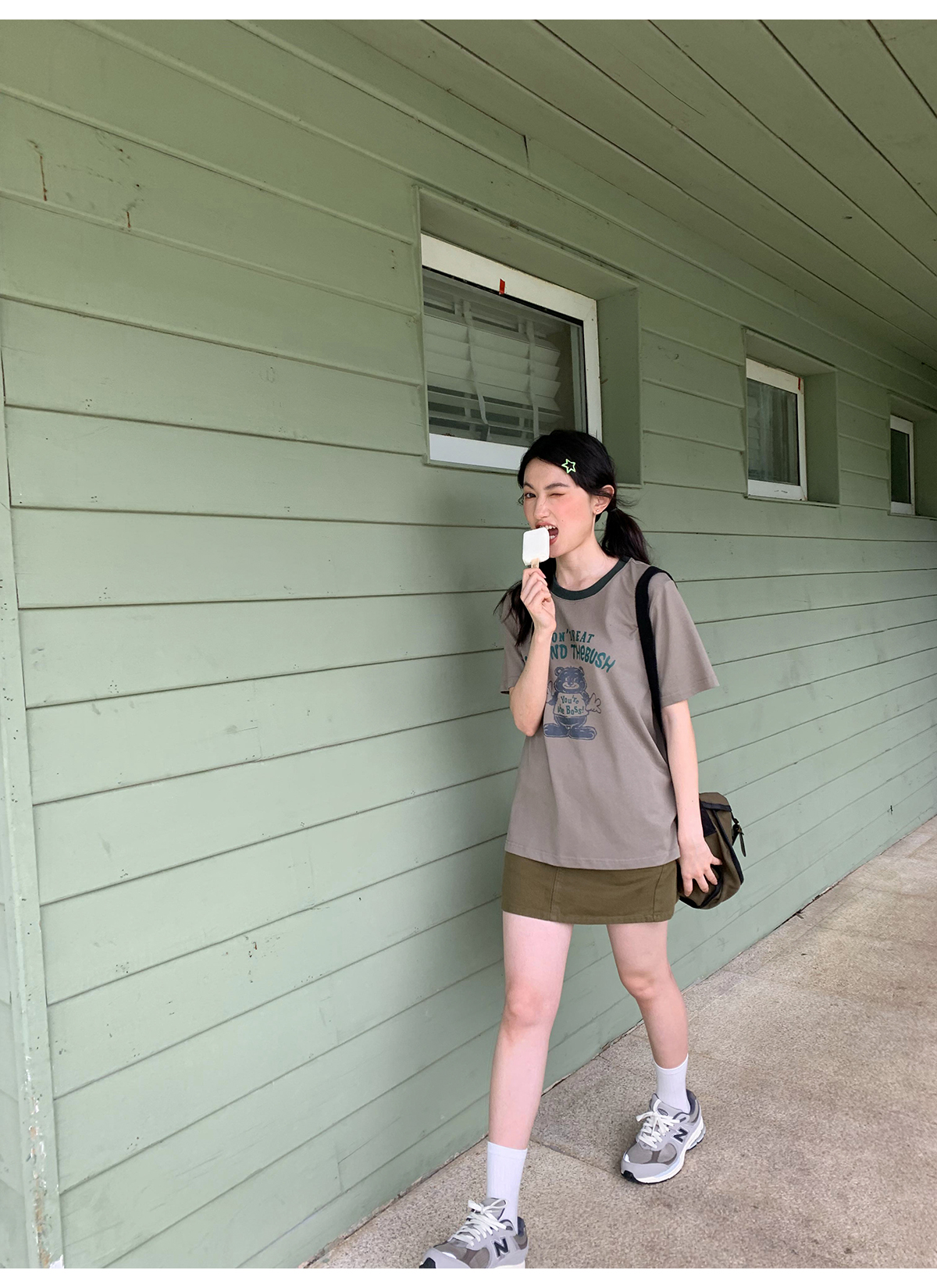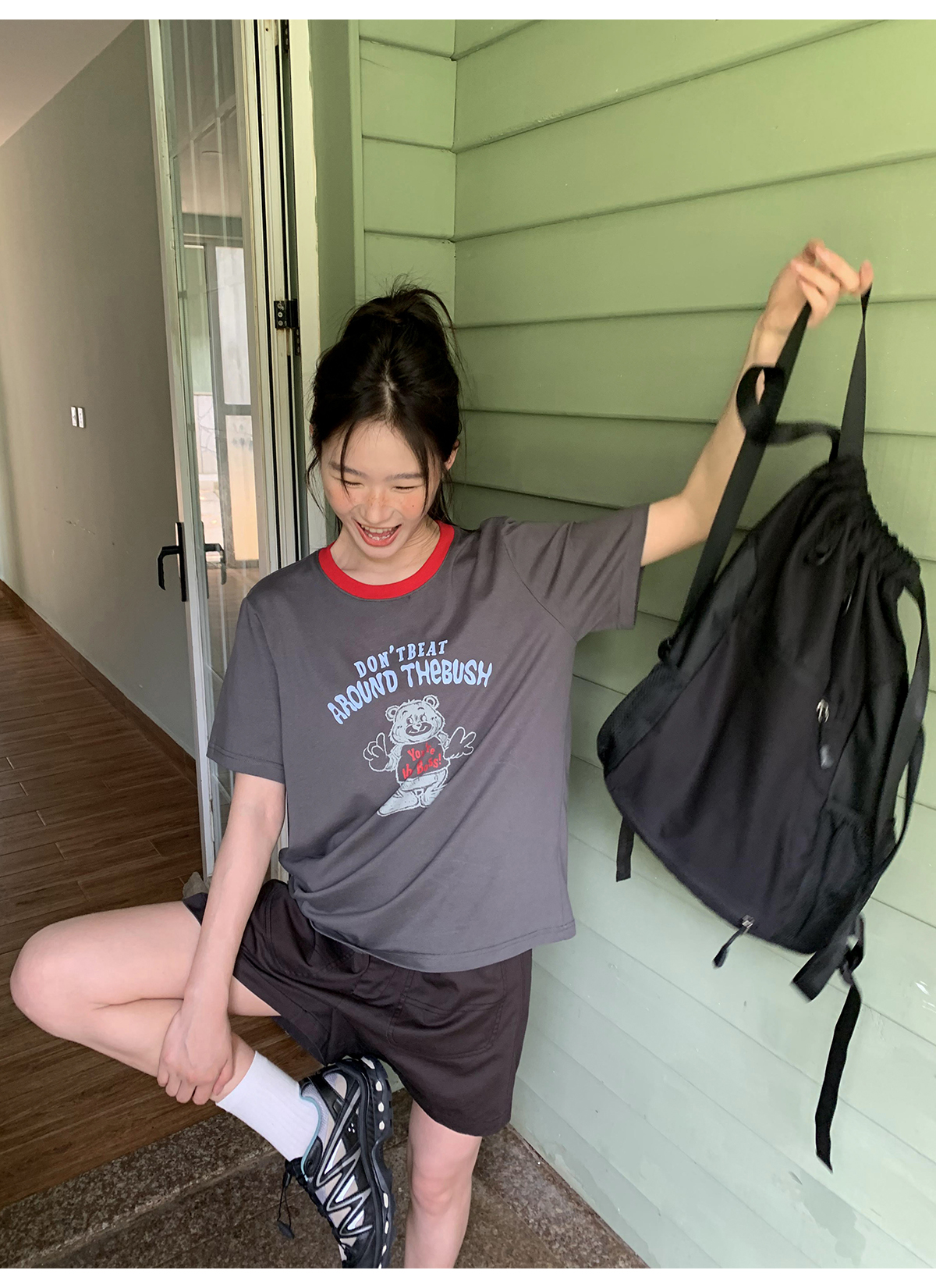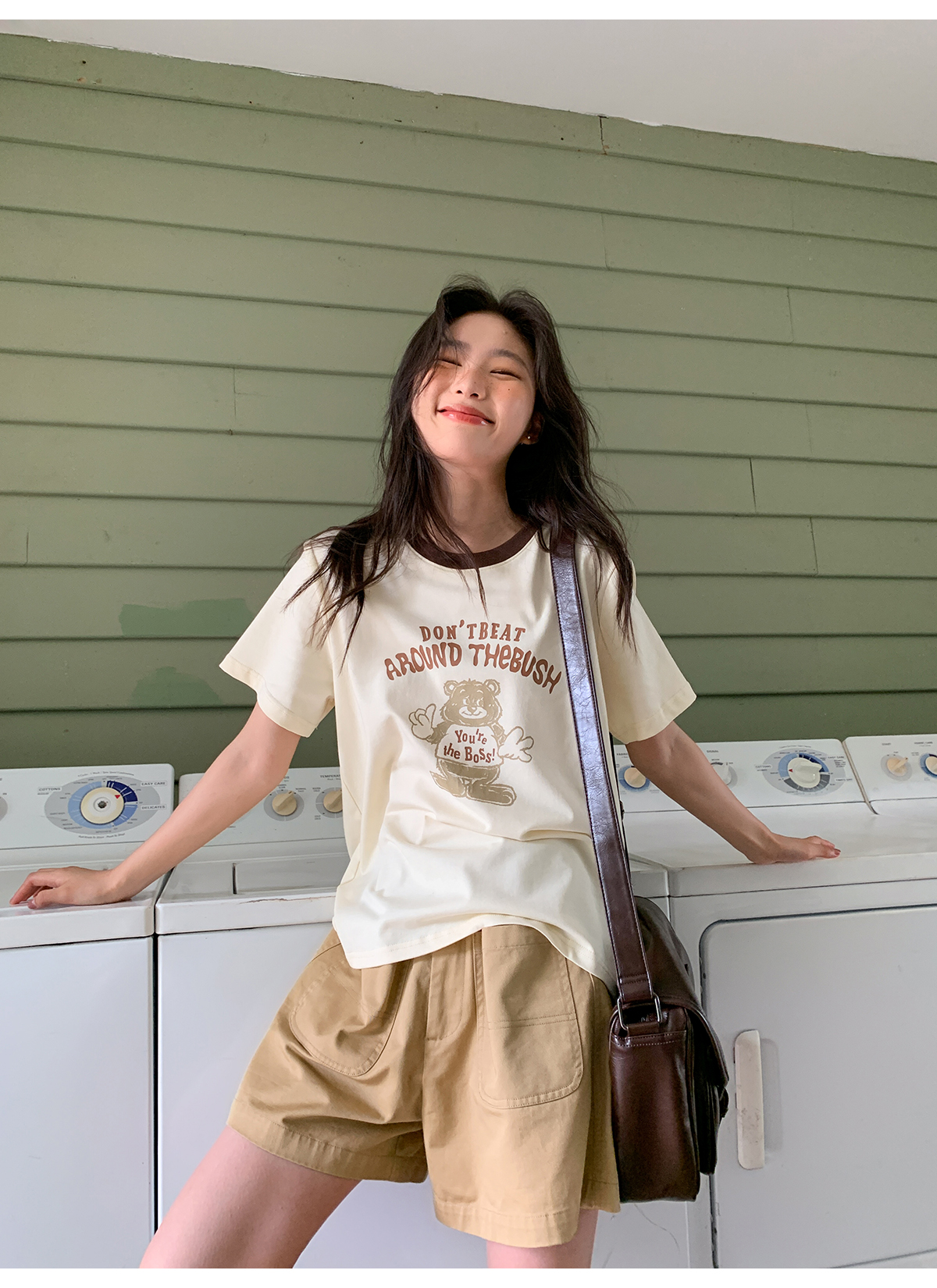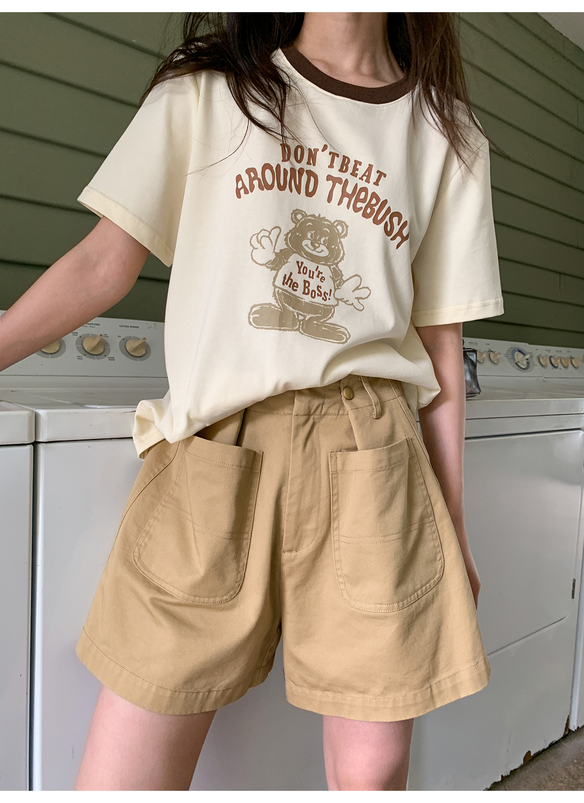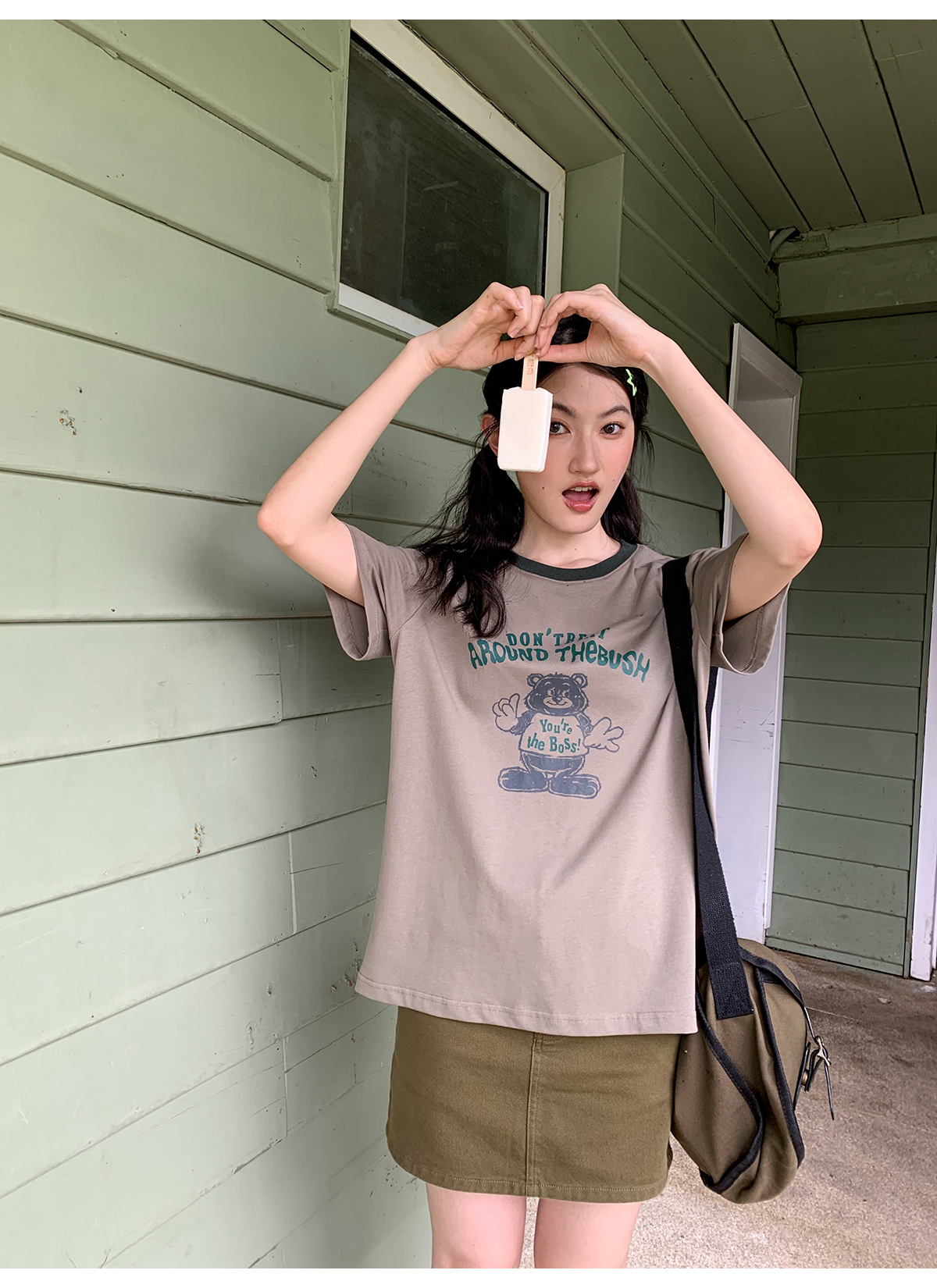 你好卡農 原創小熊印花撞色圓領短袖T恤女2023新款寬鬆T恤上衣夏
