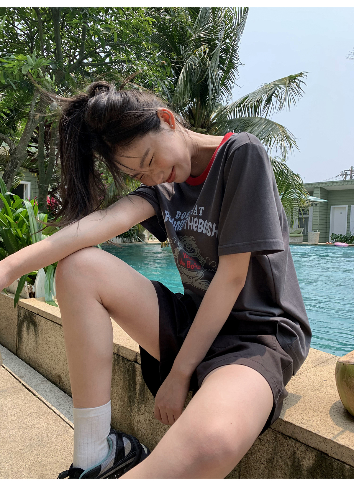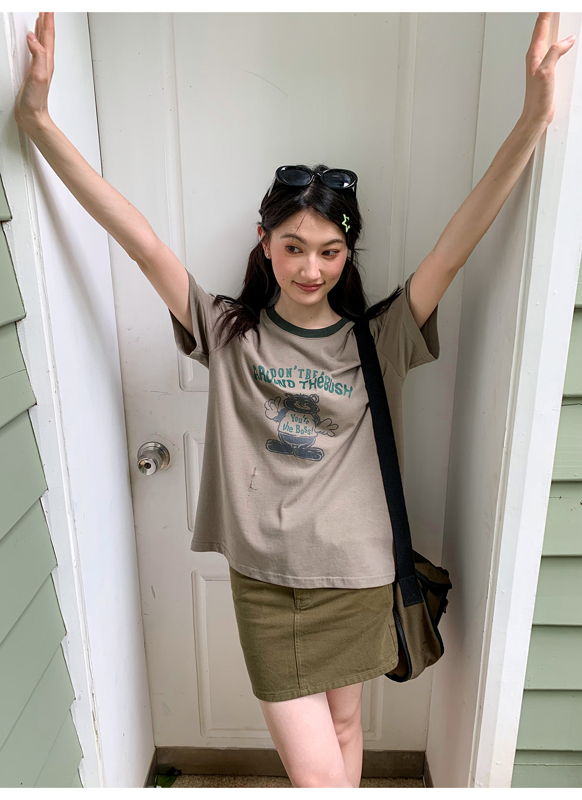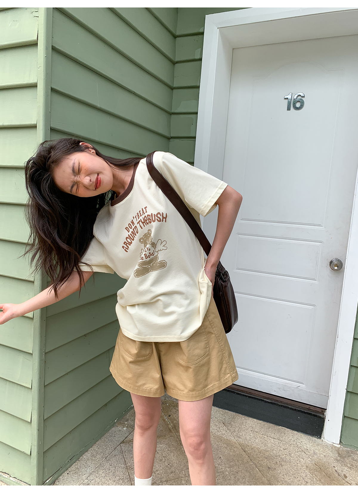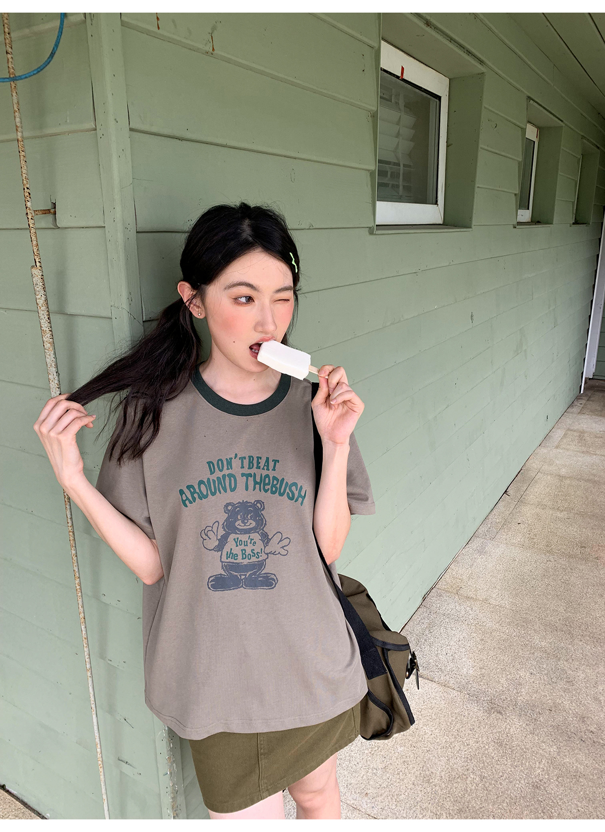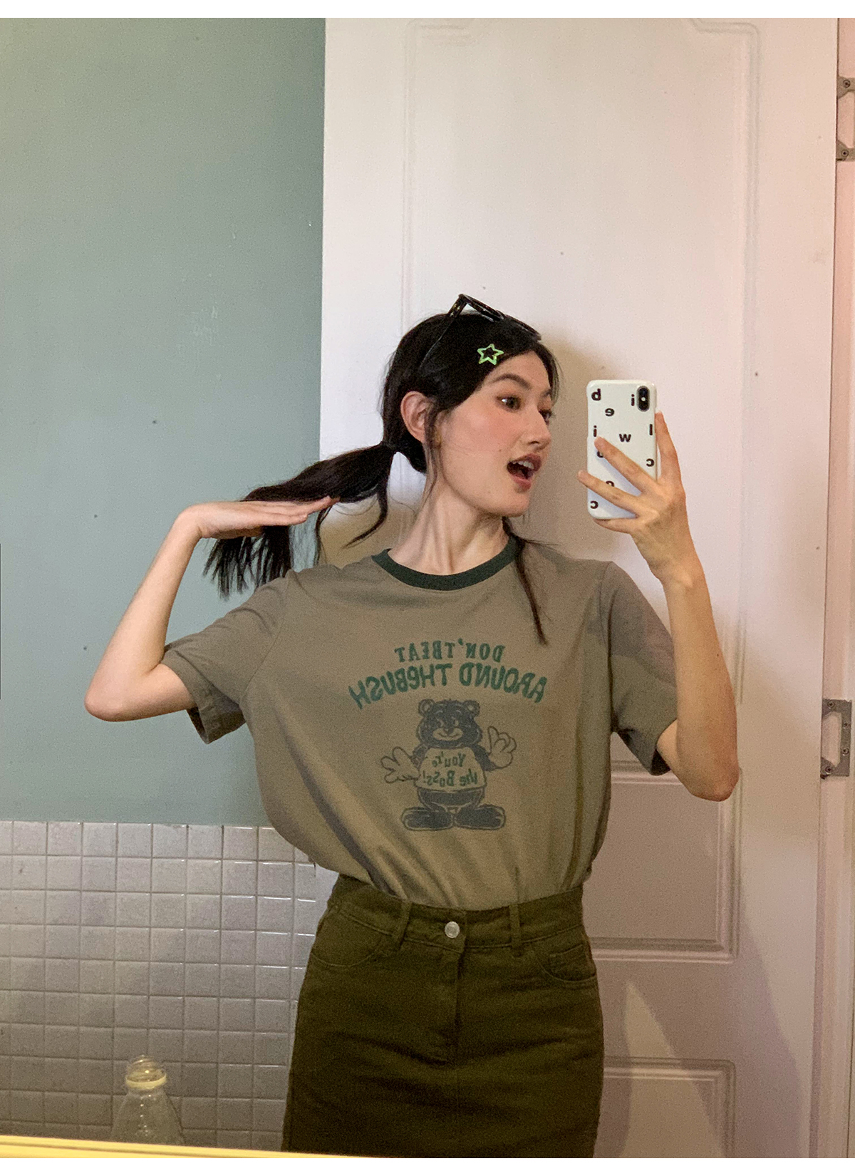你好卡農 原創小熊印花撞色圓領短袖T恤女2023新款寬鬆T恤上衣夏
