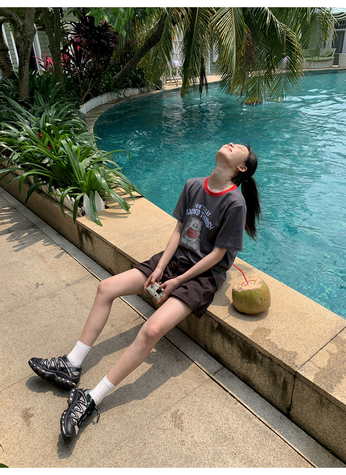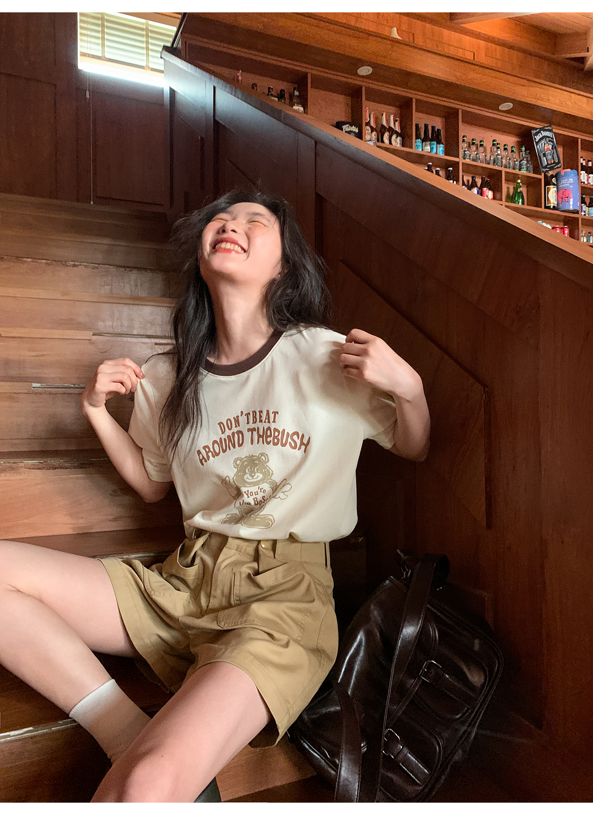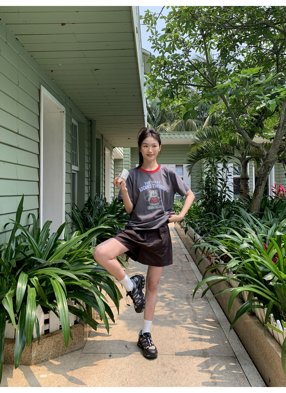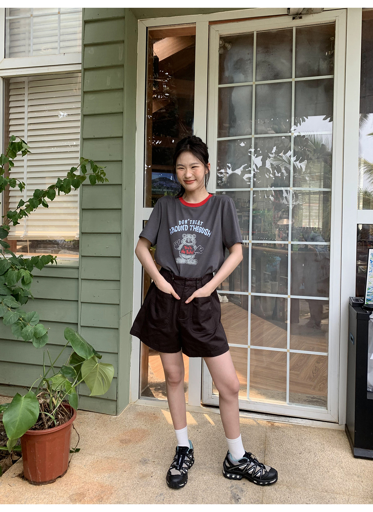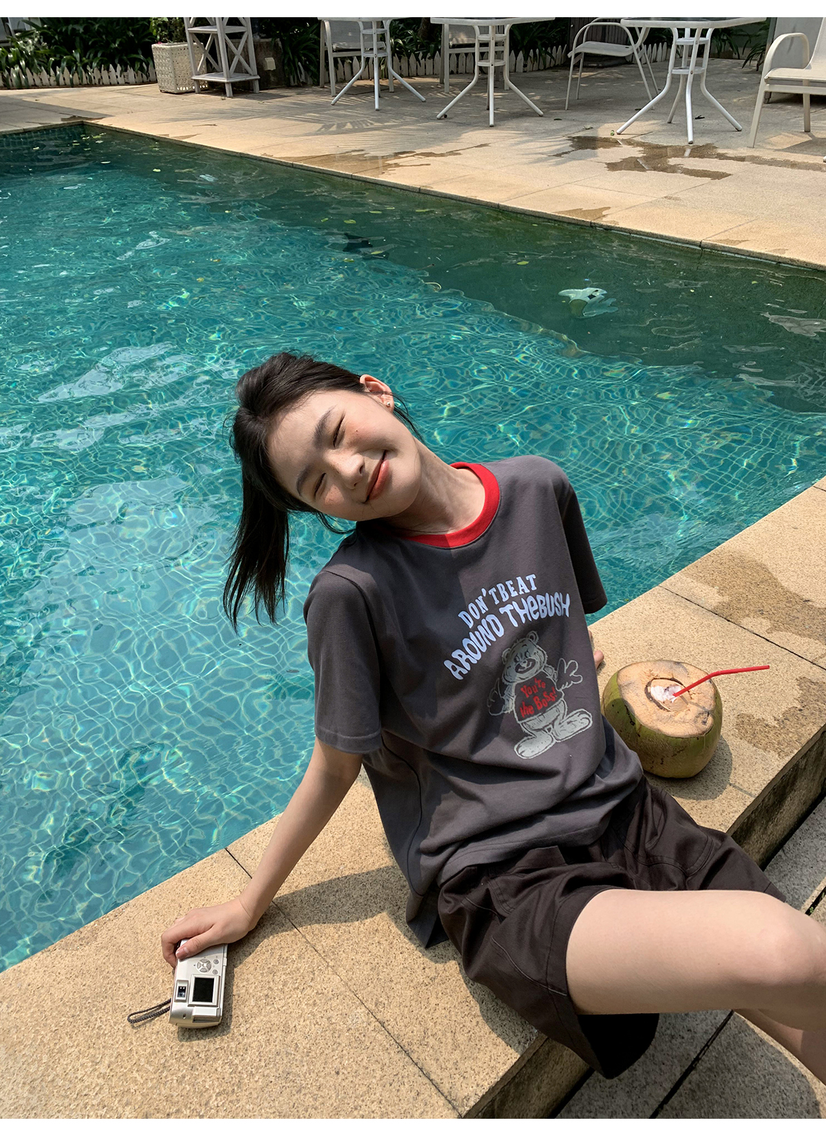 你好卡農 原創小熊印花撞色圓領短袖T恤女2023新款寬鬆T恤上衣夏