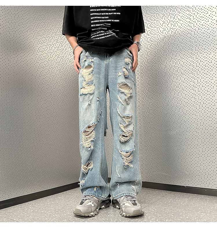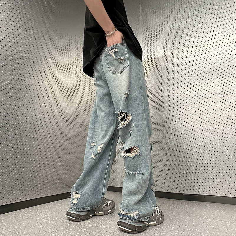 古著感直筒破洞牛仔褲男夏季美式嘻哈炸街拖地褲高街潮牌乞丐褲子