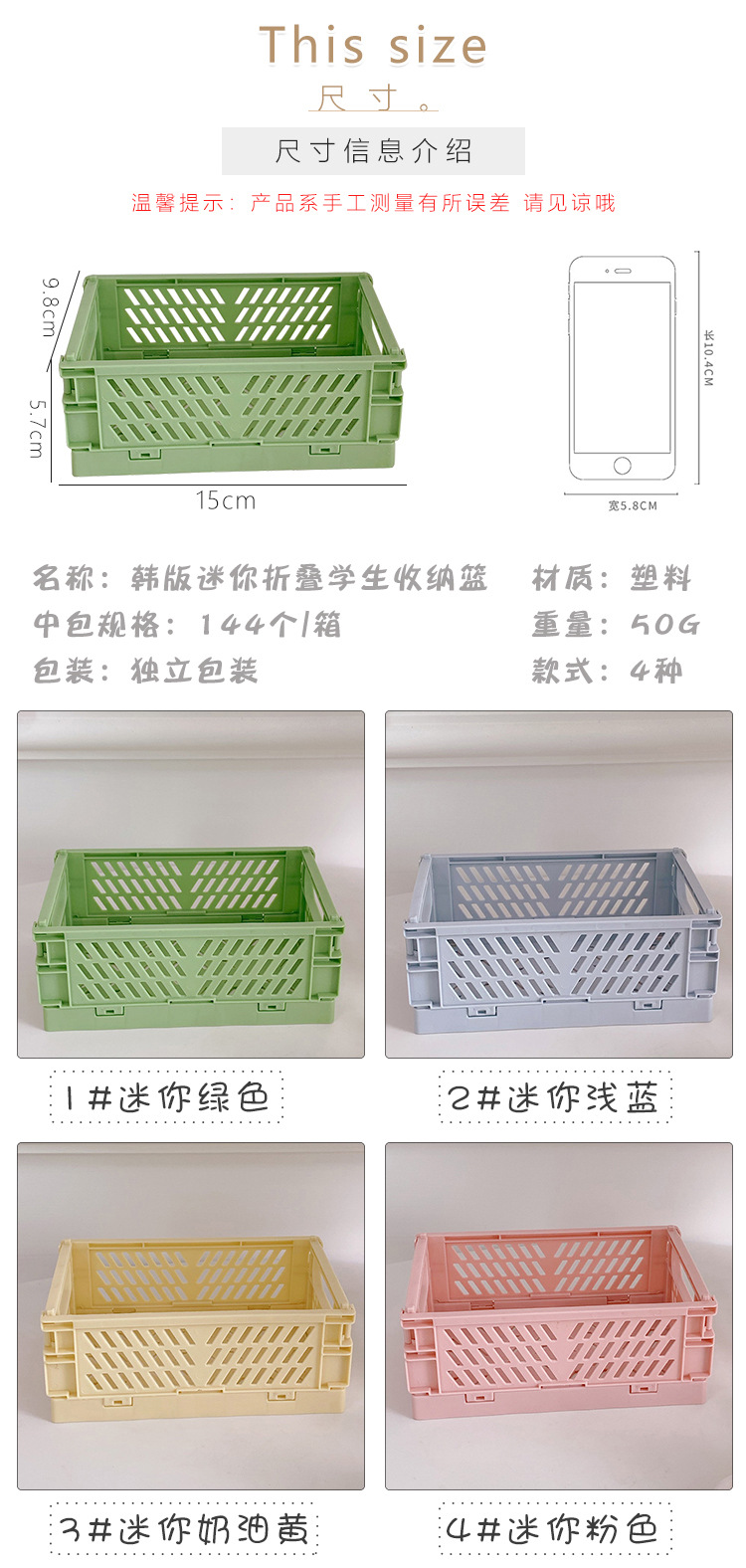 颜色 1#迷你绿色,2#迷你浅蓝,3#迷你奶油黄,4#迷你粉色,1#绿色收纳筐,2#浅黄收纳筐,3#浅蓝收纳筐,4#粉色收纳筐,5#虾粉收纳筐,6#白色收纳筐,7#紫色收纳筐,1#浅黄收纳筐(小号),2#浅粉收纳筐(小号),3#湖蓝收纳筐(小号),4#白色收纳筐(小号),5#浅黄收纳筐(大号),6#浅粉收纳筐(大号),7#湖蓝收纳筐(大号),8#白色收纳筐(大号),5#迷你白色,6#迷你紫色