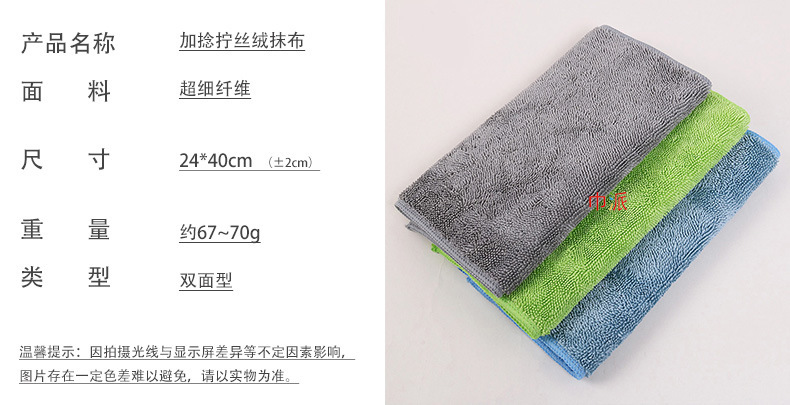 [1]:24*40cm加捻拧丝绒抹布,3公斤快递小包可装35条且满足店铺满 100元包邮活动,建议亲按照40的倍数拍下为您节省    运费【新疆、西藏、青海等偏远地区除外】