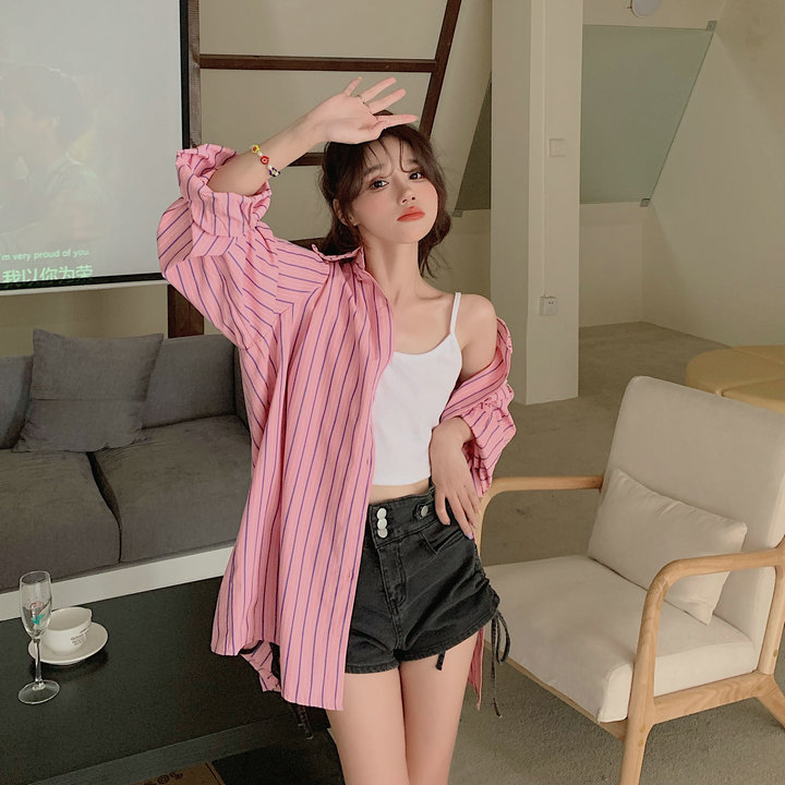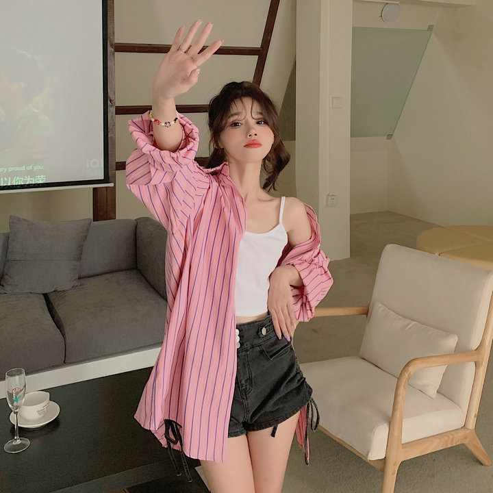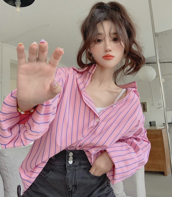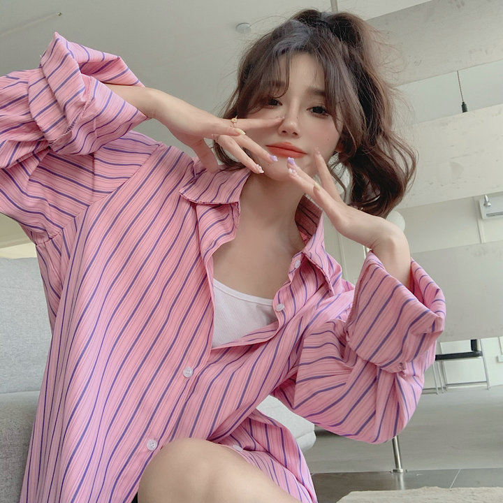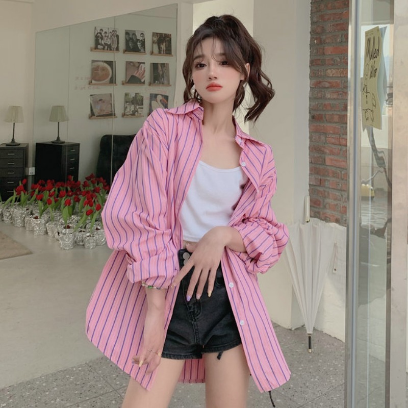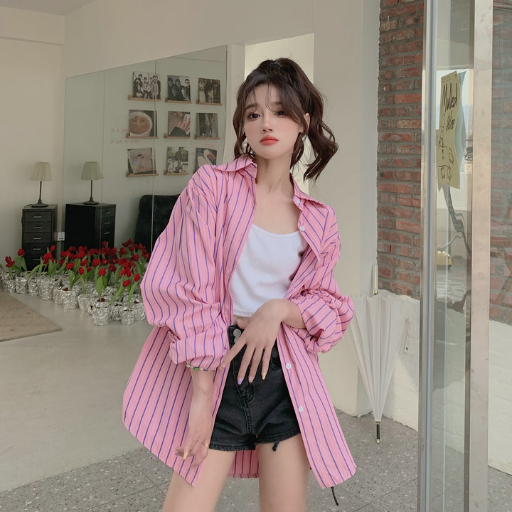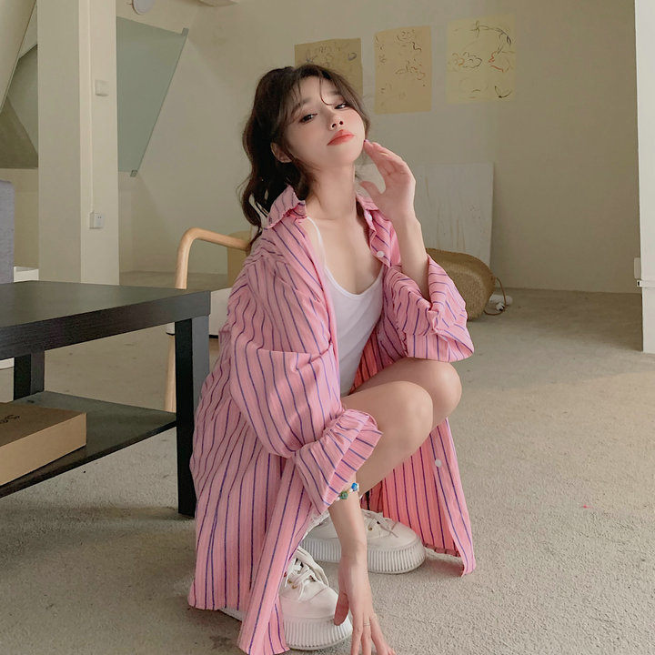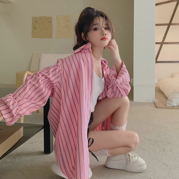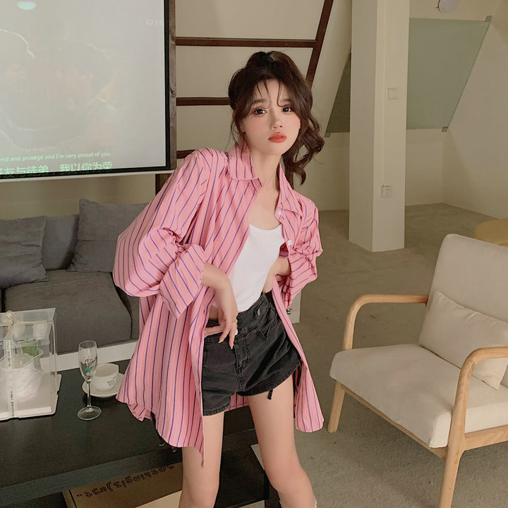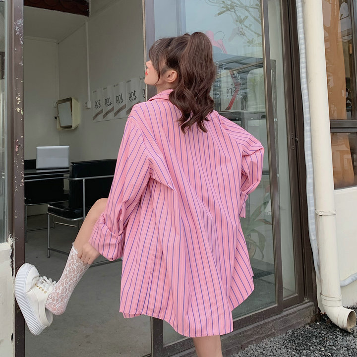 粉紅色條紋襯衫外套女春秋2023新款寬鬆慵懶風休閒中長版長袖上衣