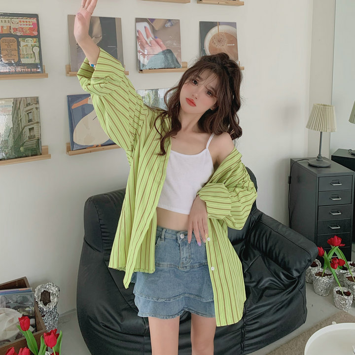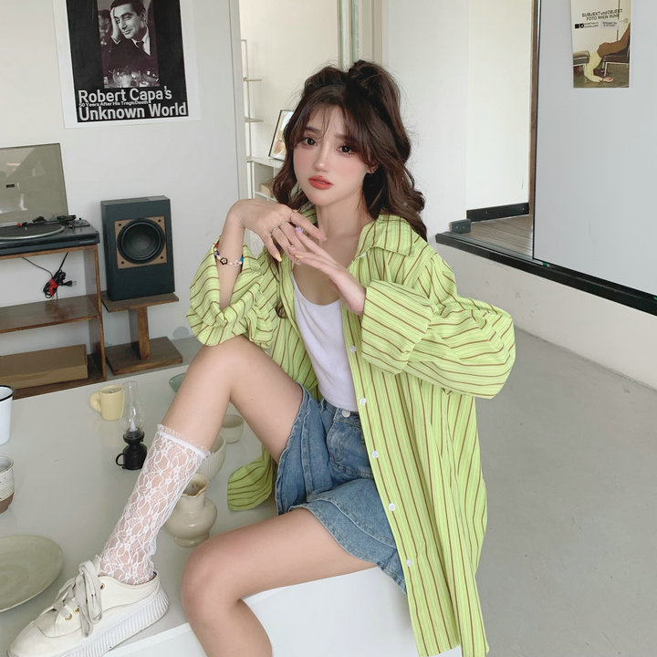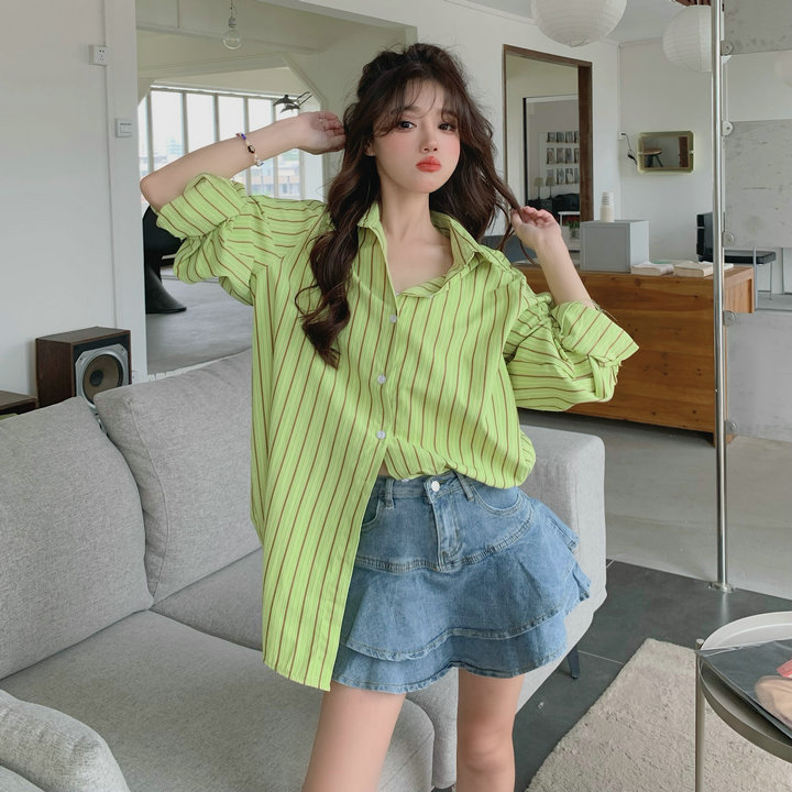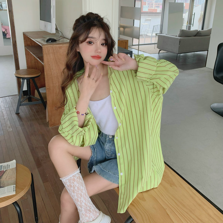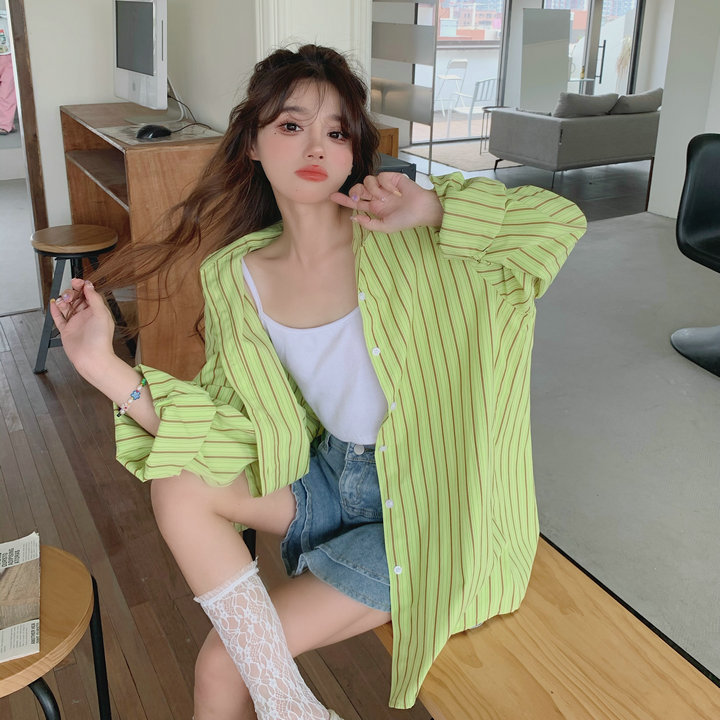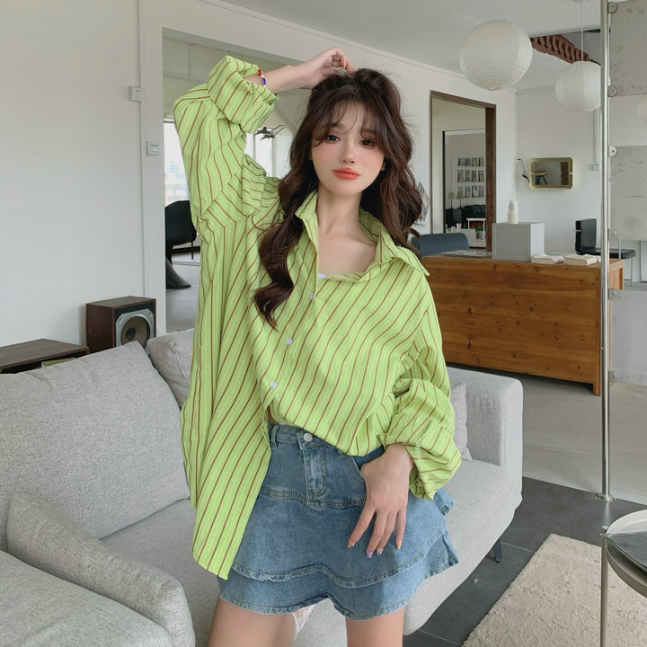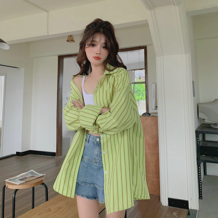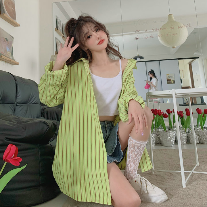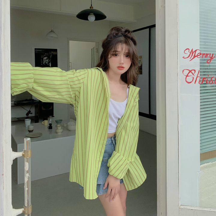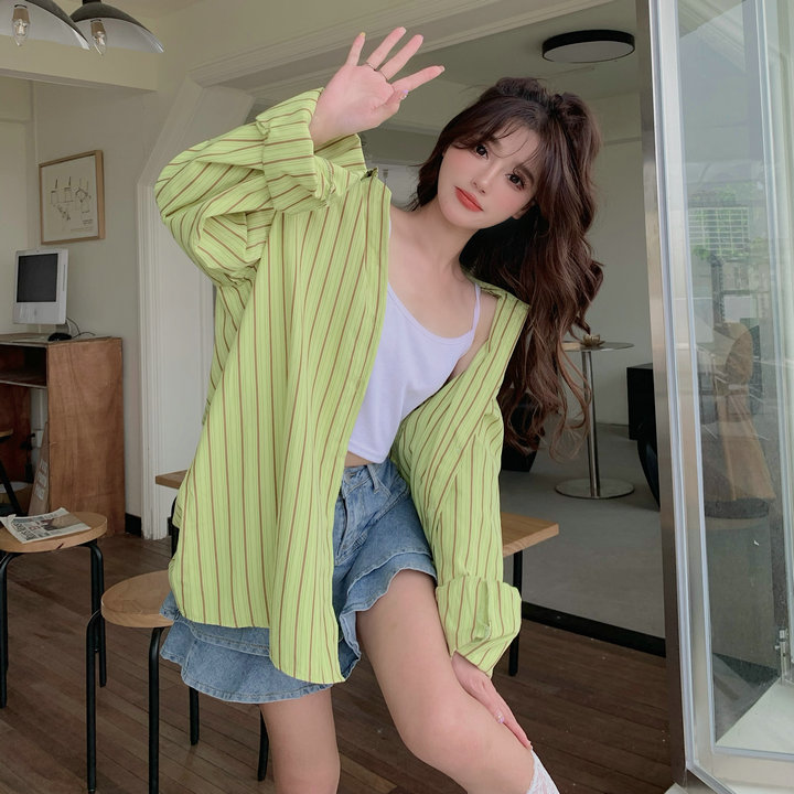 粉紅色條紋襯衫外套女春秋2023新款寬鬆慵懶風休閒中長版長袖上衣