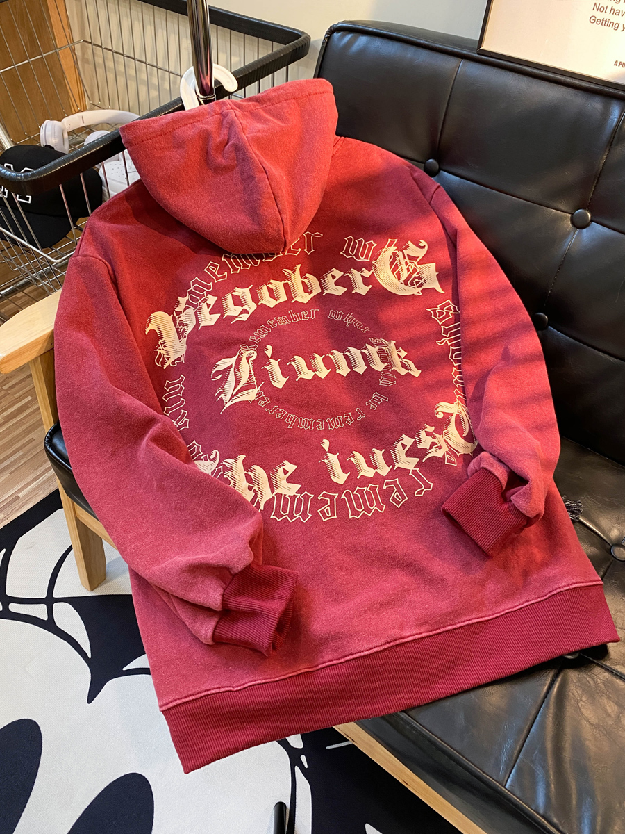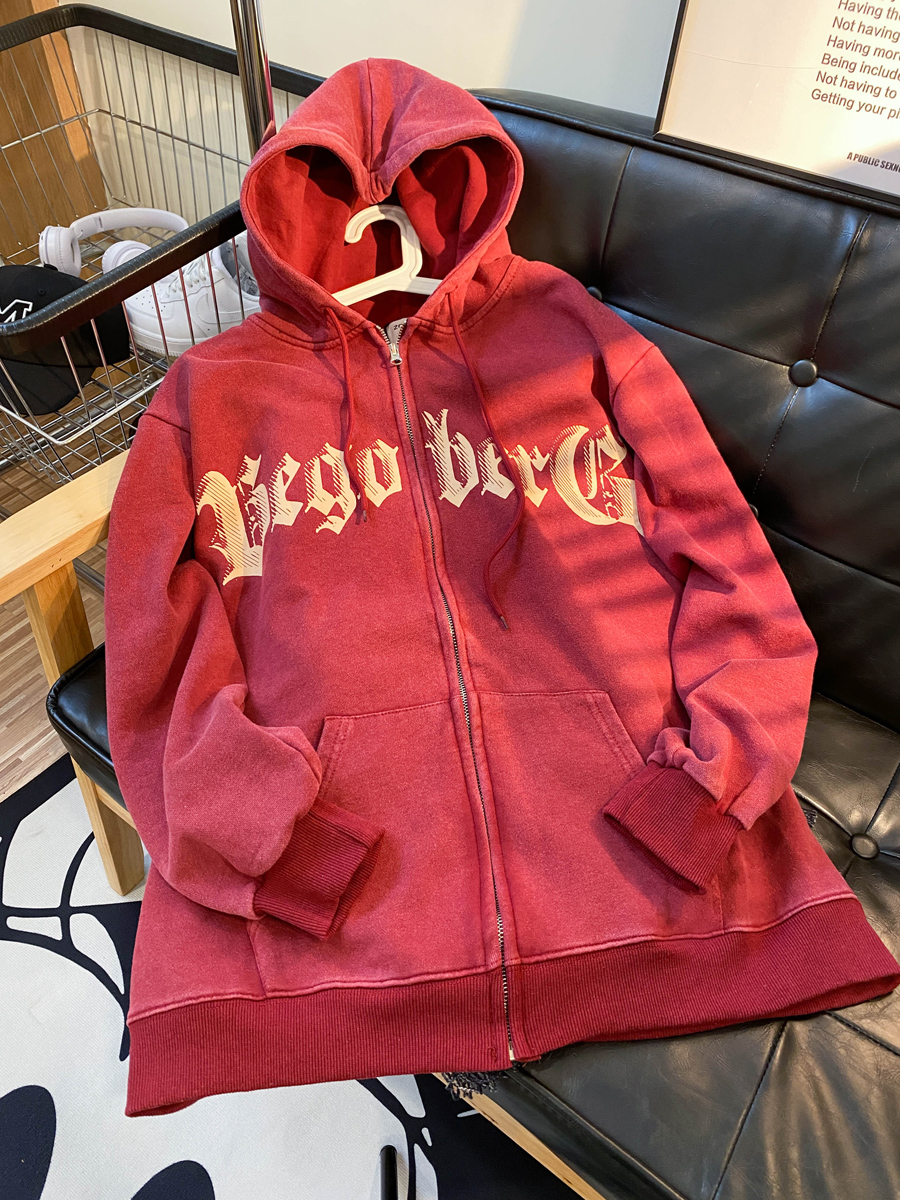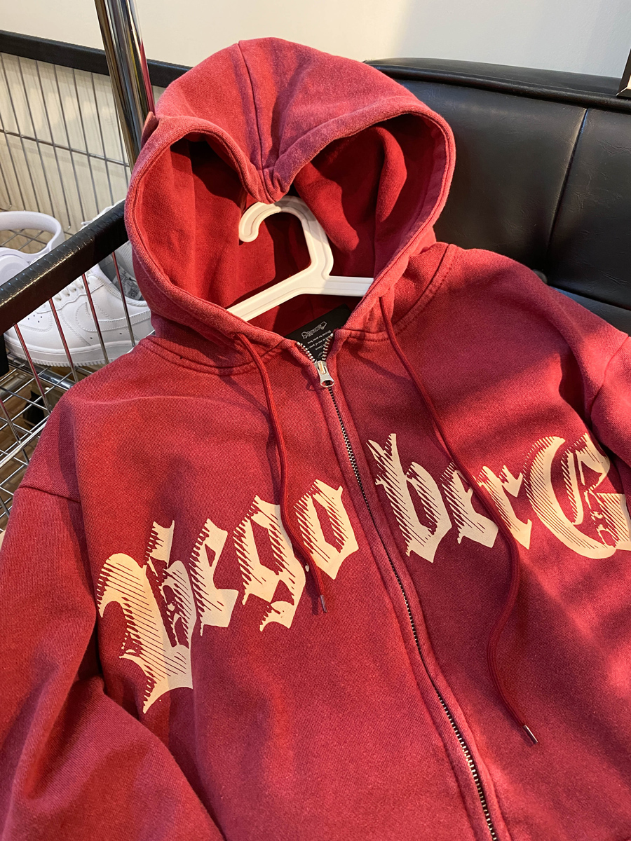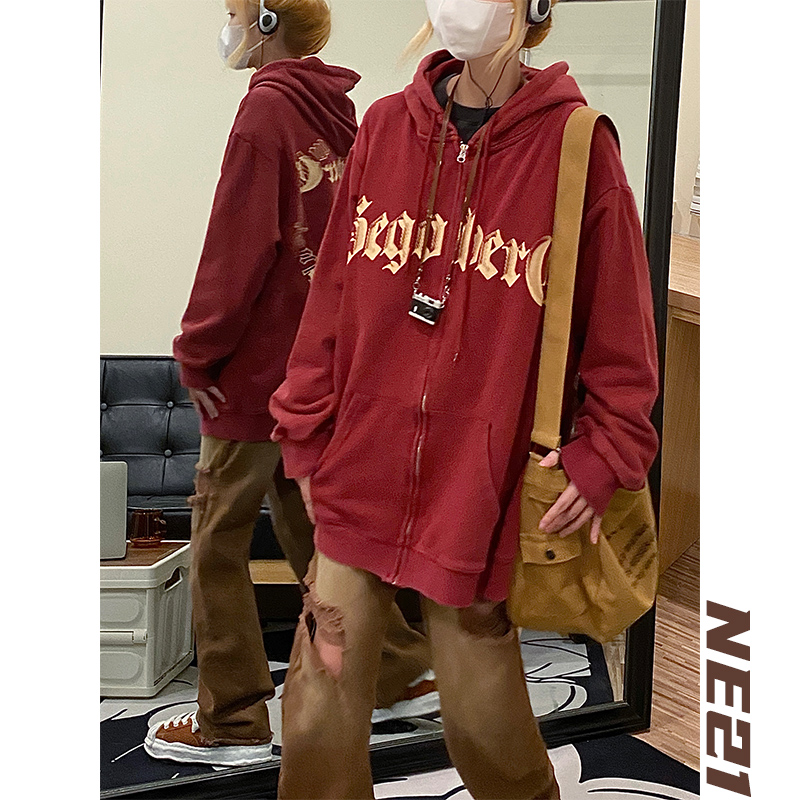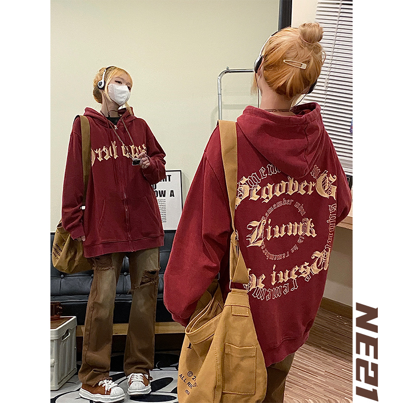 NE21OUS秋冬美式復古小眾開衫外套酒紅色加絨連帽拉鍊衛衣女潮INS