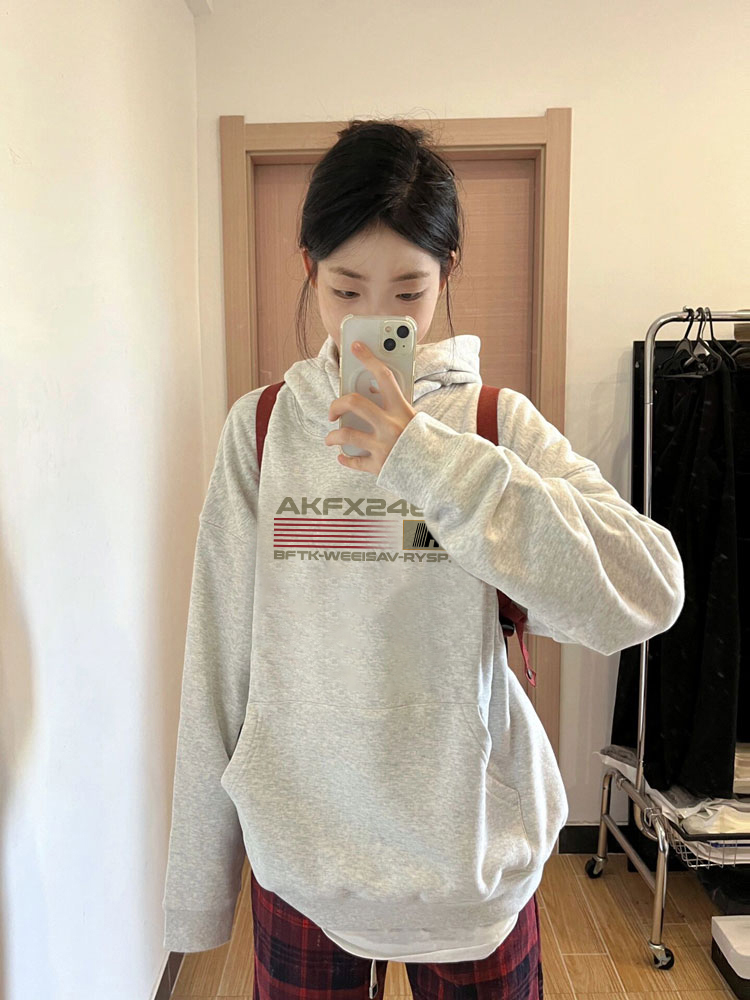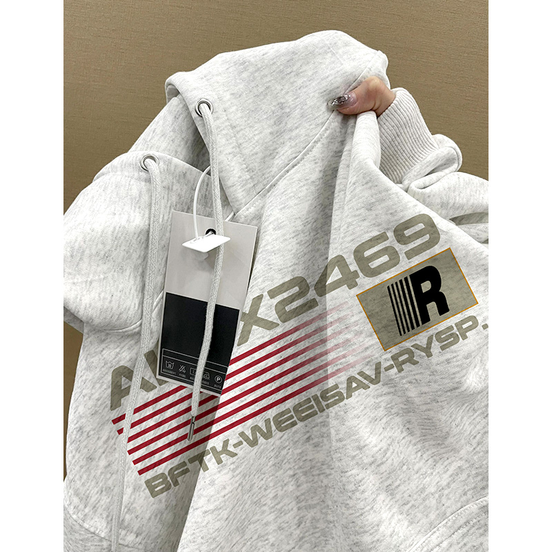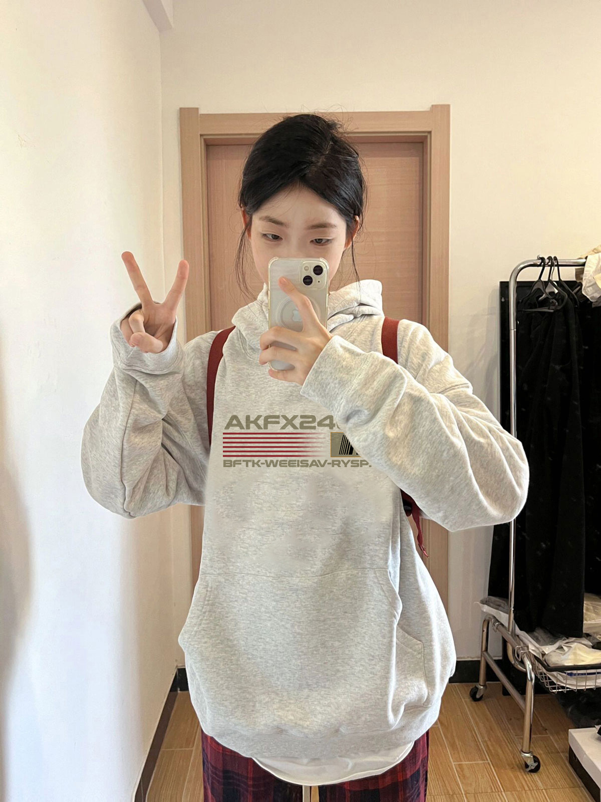美式連帽花灰色厚棉T女小個子秋冬復古vintage潮牌加絨上衣外套女