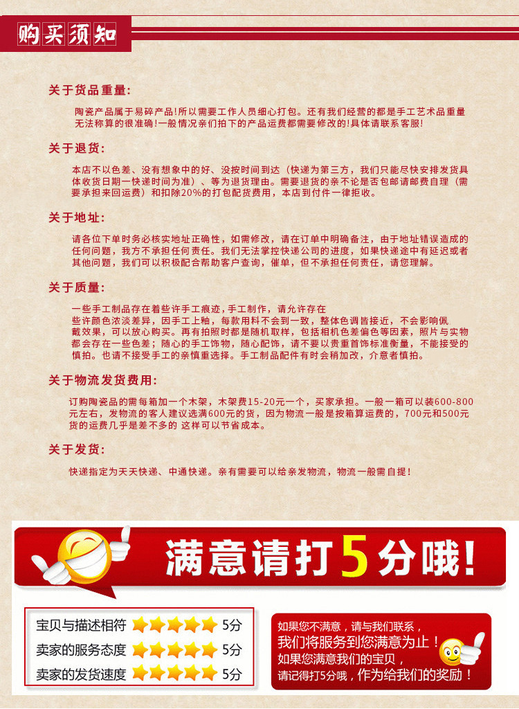 陶瓷产品属于易碎产品!所以需要工作人员细心打包。还有我们经营的都是手工艺术品重量无法称算的很准确!一般情况亲们拍下的产品运费都需要修改的!具体请联系客服!