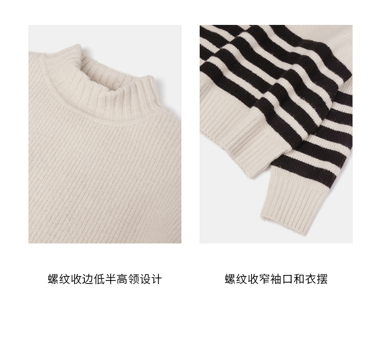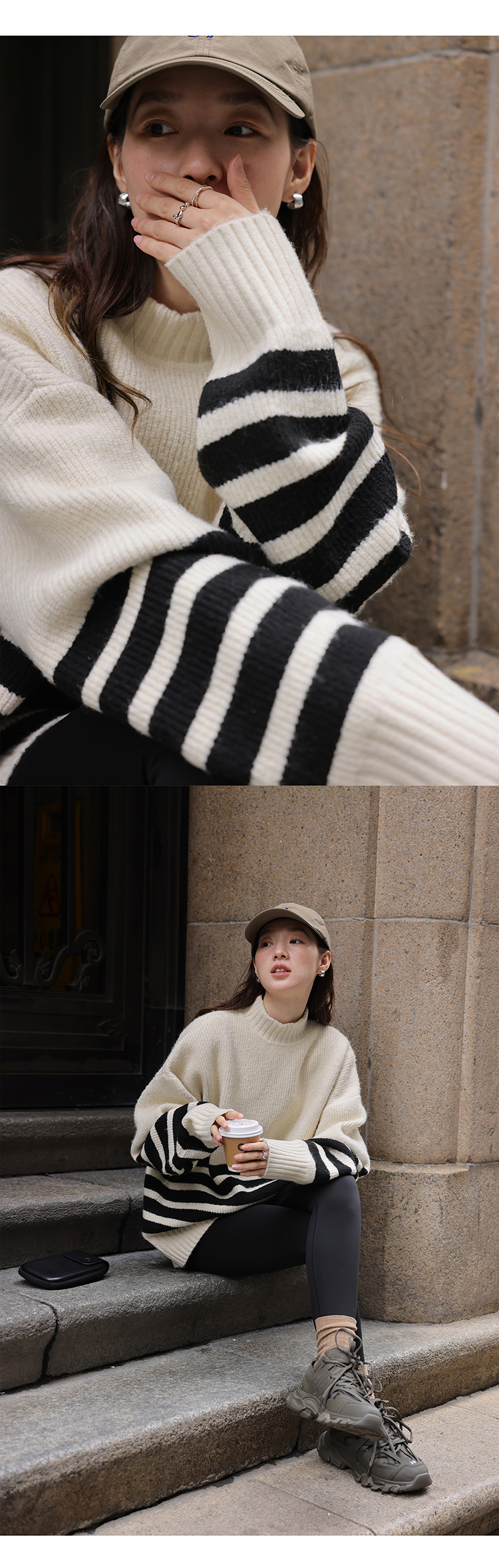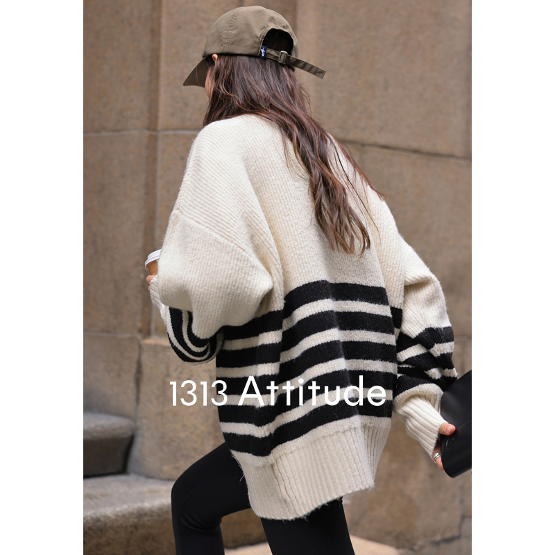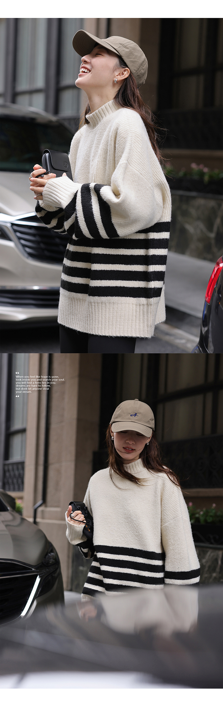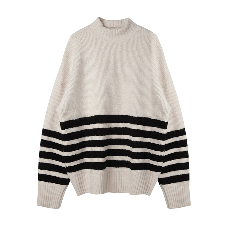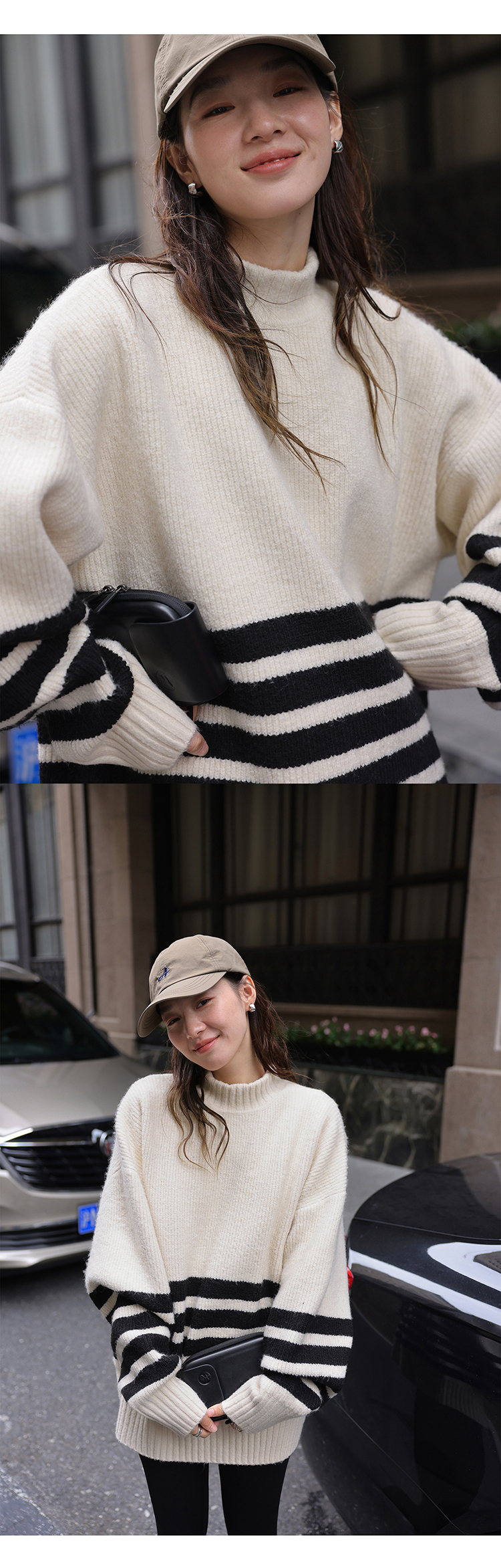 【現貨】1313復古淺米拼黑條紋寬鬆針織毛衫女寬鬆保暖半高領毛衣