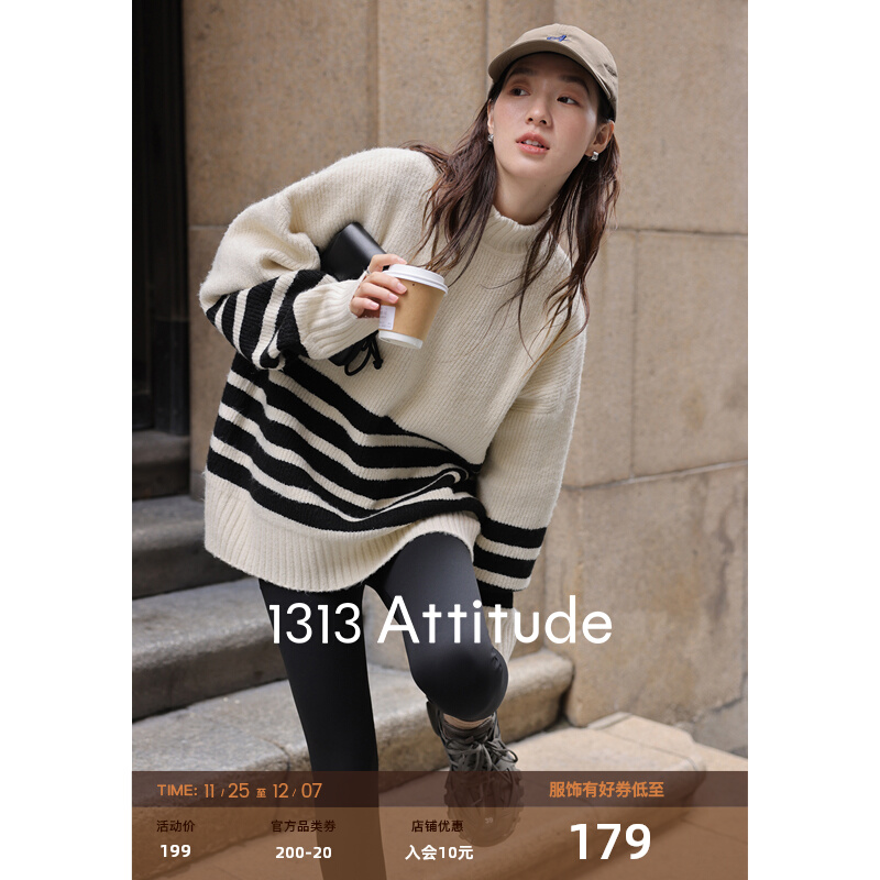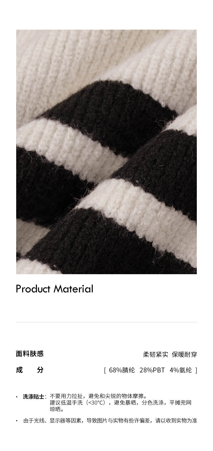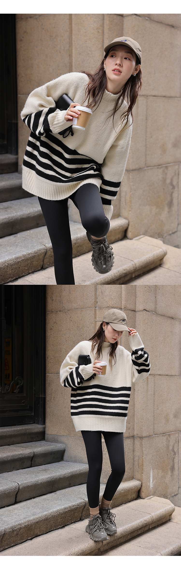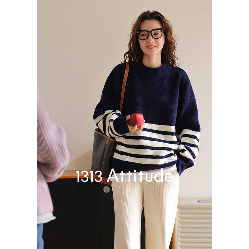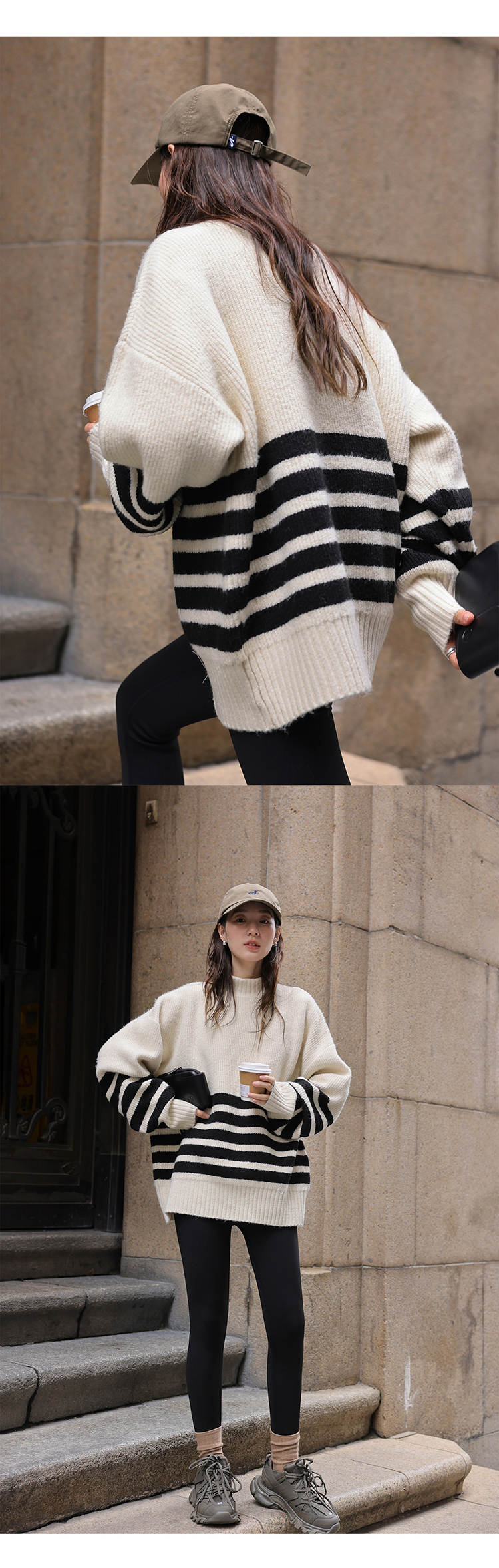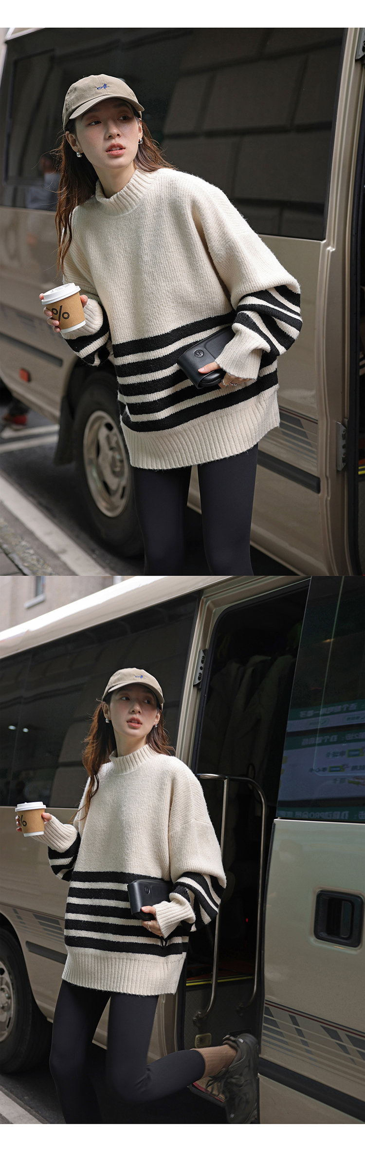 【現貨】1313復古淺米拼黑條紋寬鬆針織毛衫女寬鬆保暖半高領毛衣