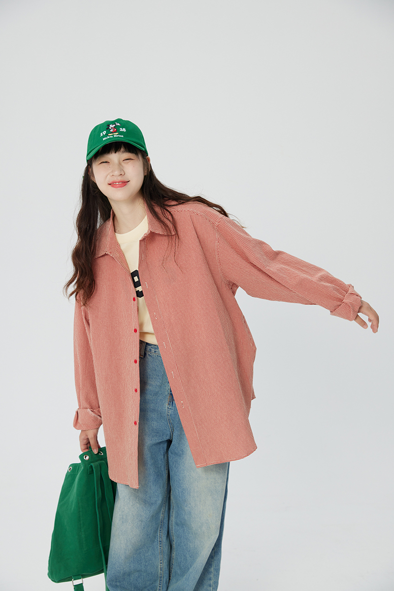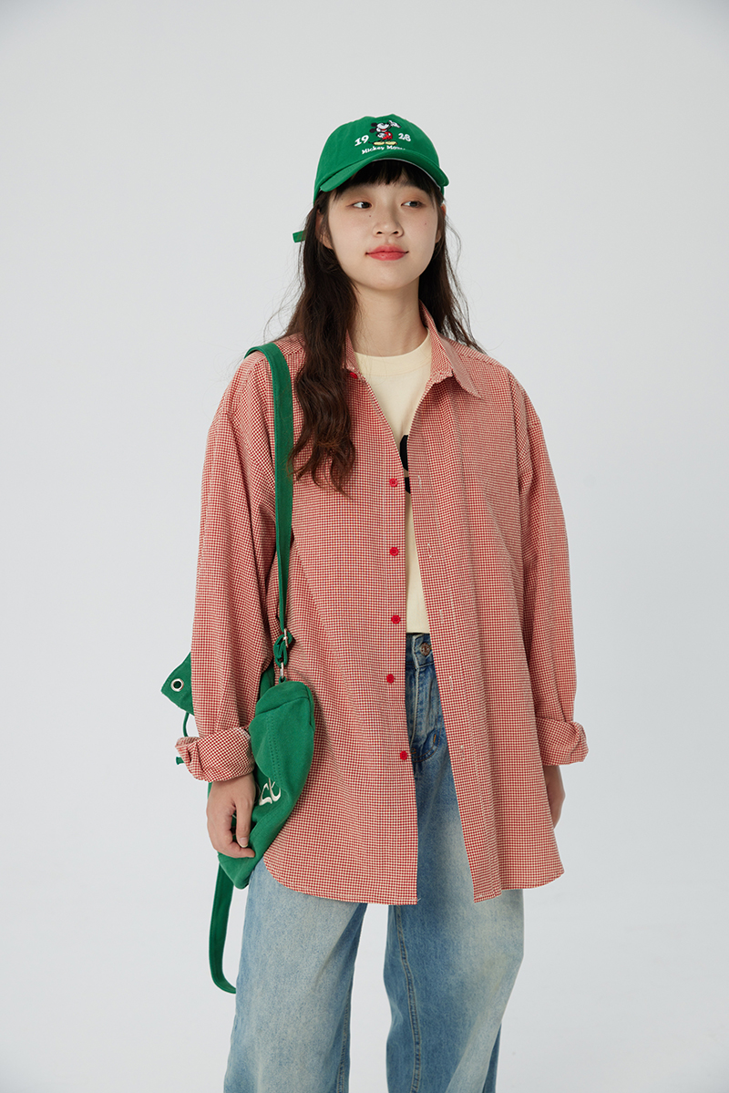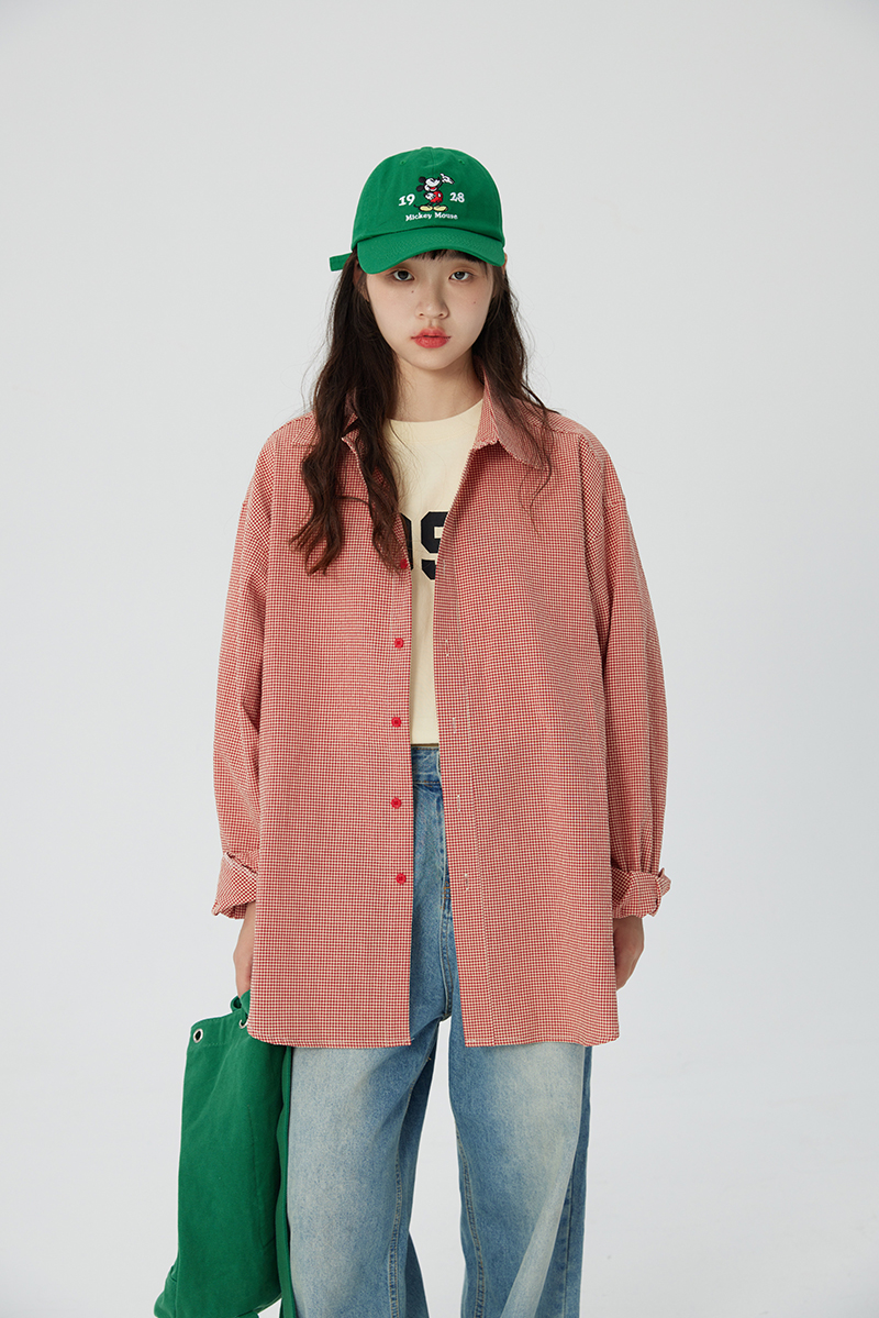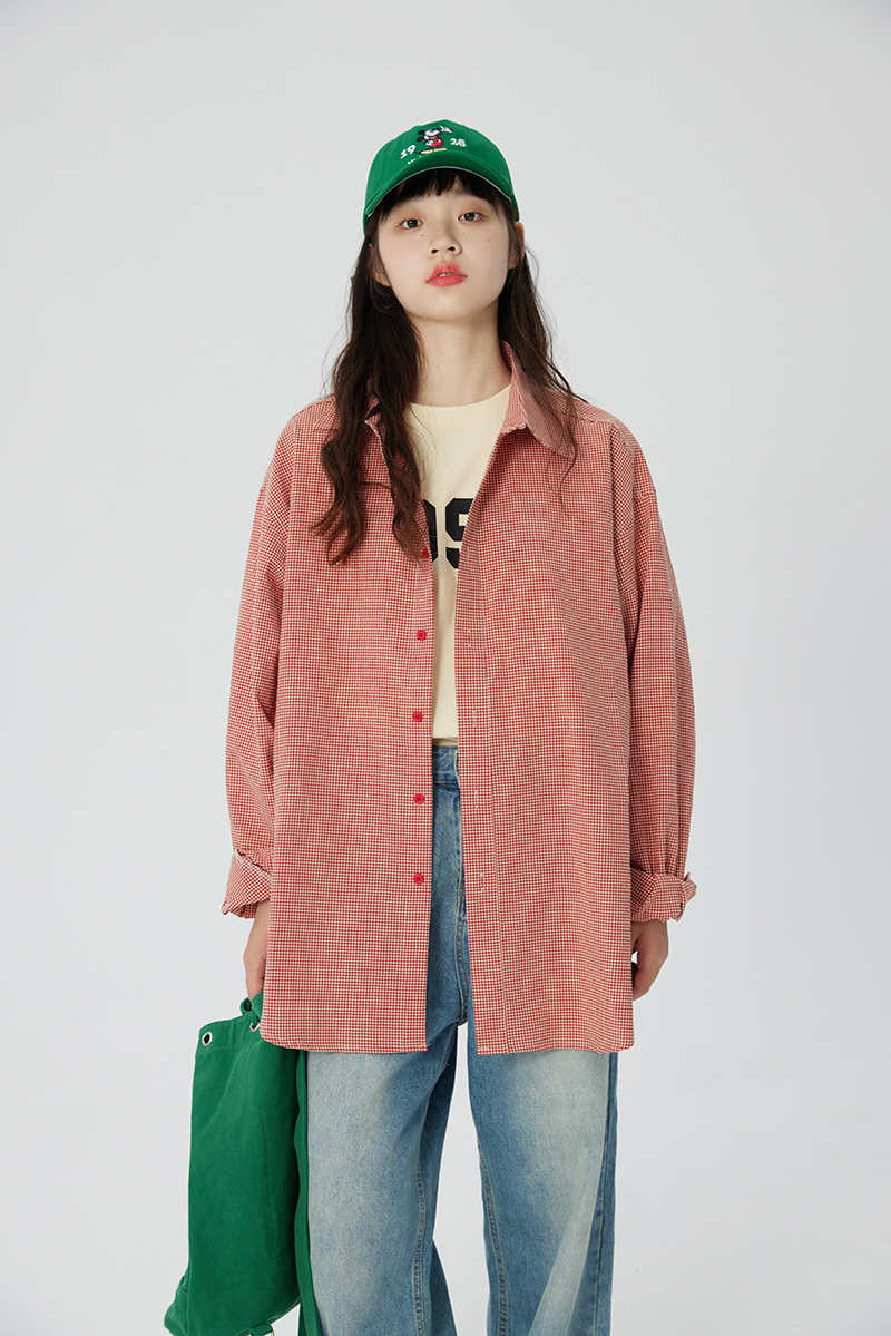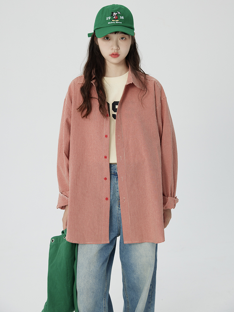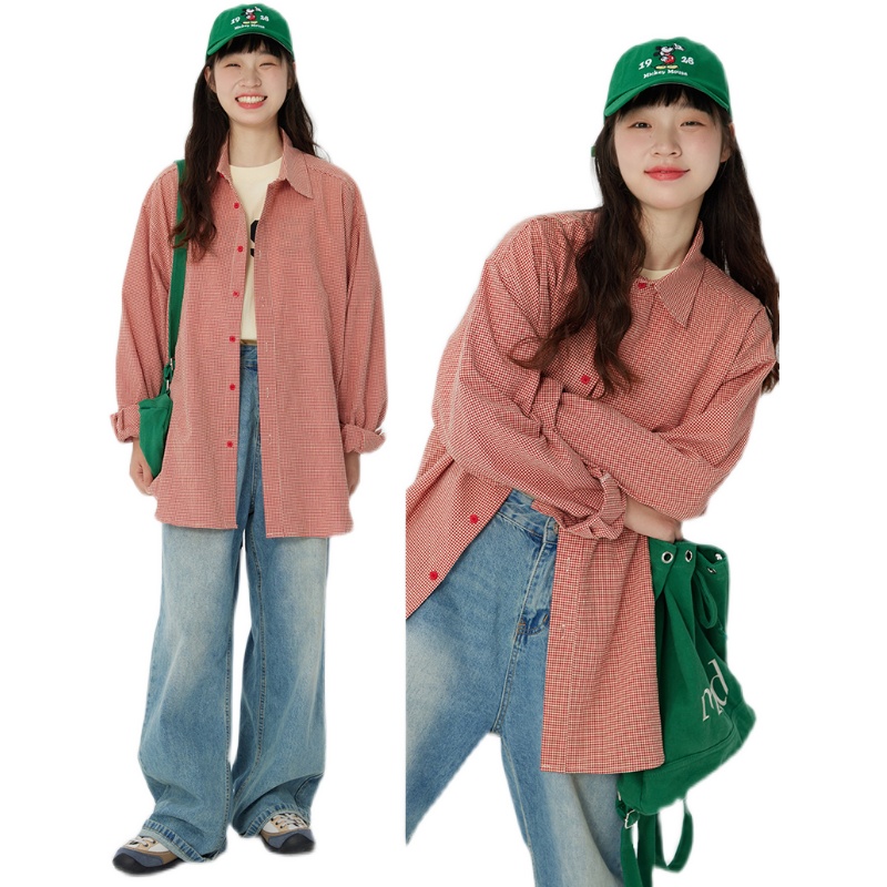 北原山貓 22ss/原創自制紅色長袖格子襯衫女休閒寬鬆外穿防曬上衣