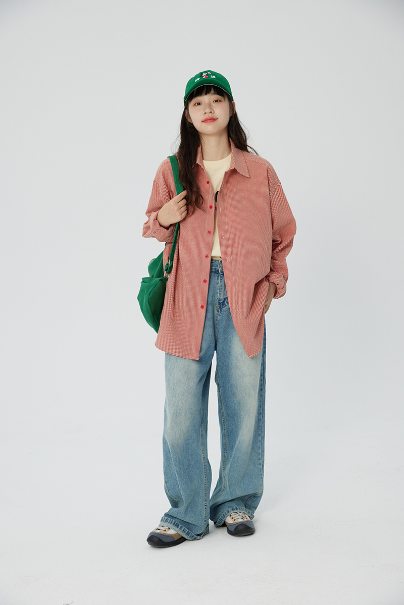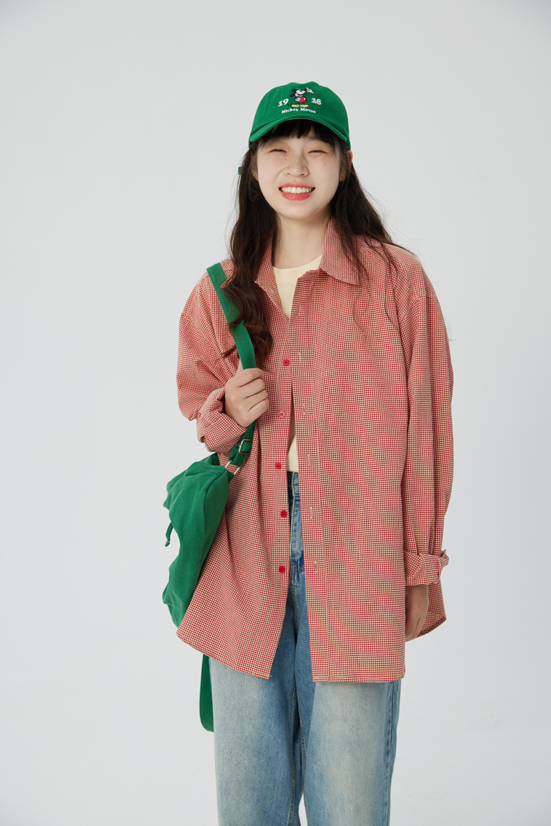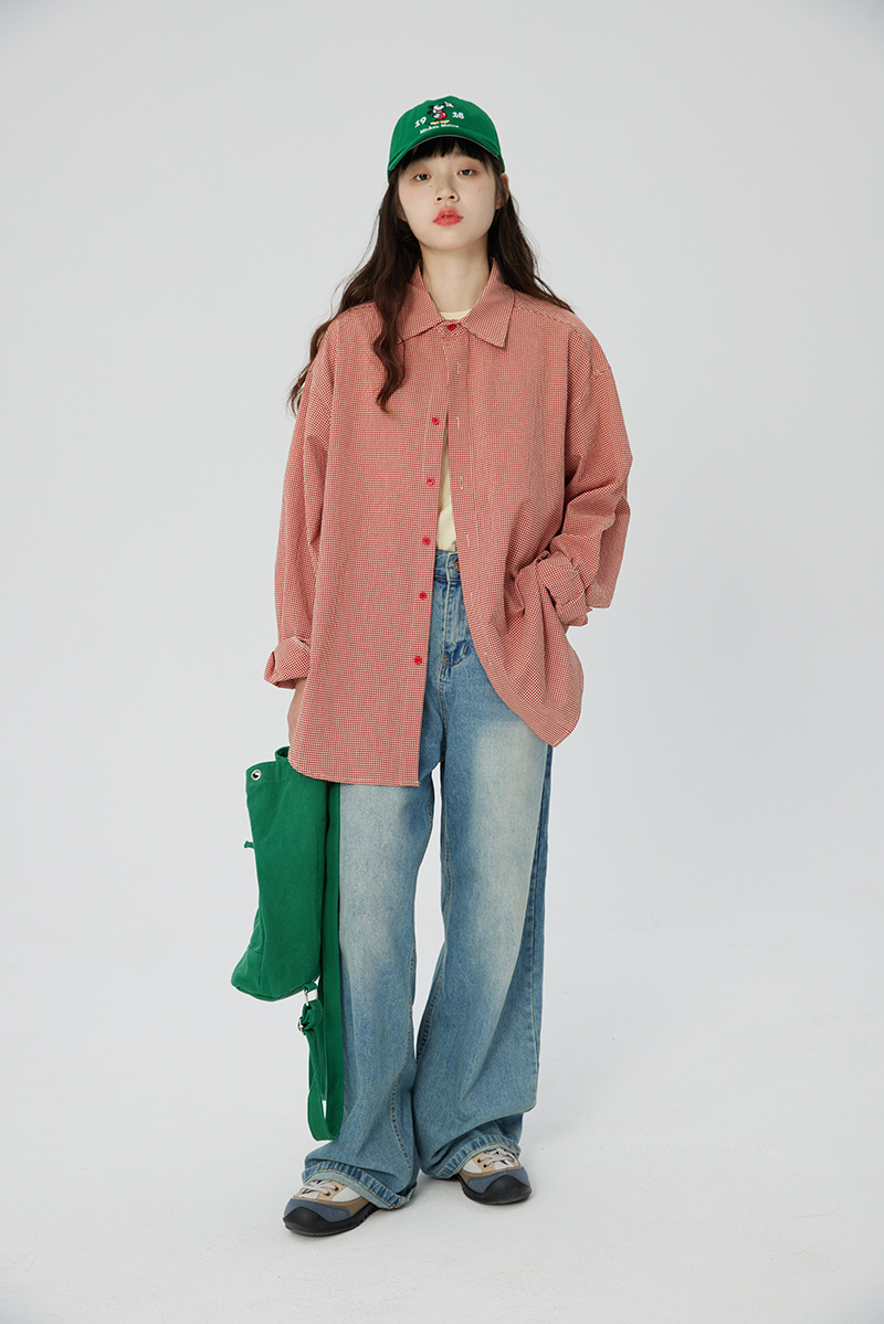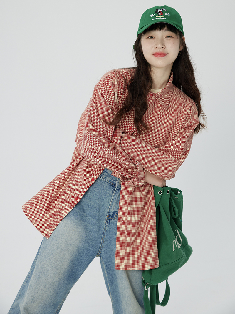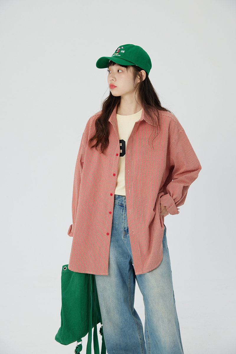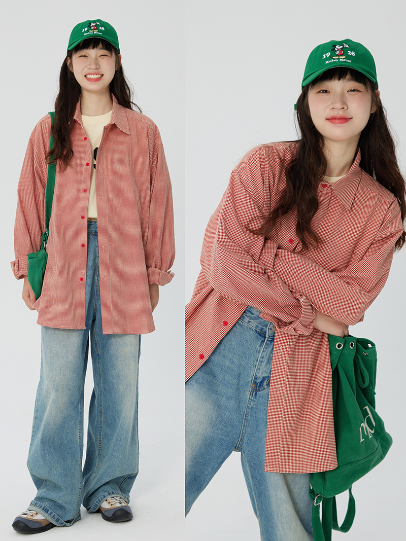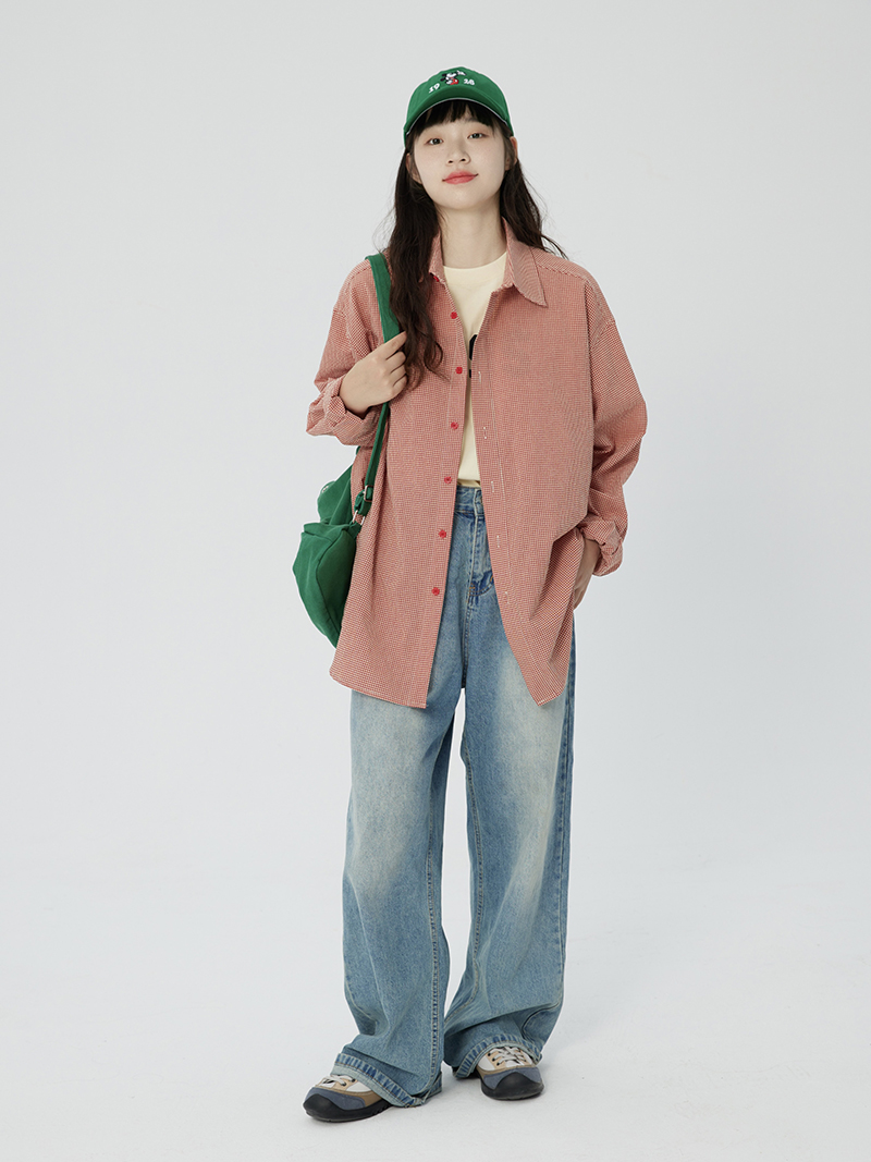 北原山貓 22ss/原創自制紅色長袖格子襯衫女休閒寬鬆外穿防曬上衣