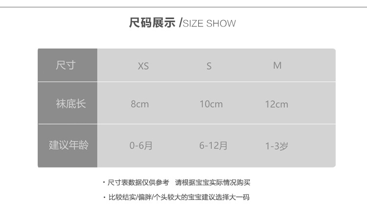 童袜尺码 XS码(0-6个月),S码(6-12个月),M码 (1-3岁)