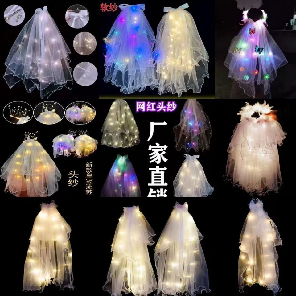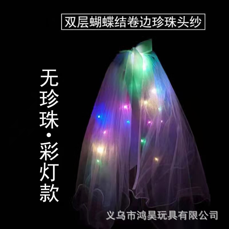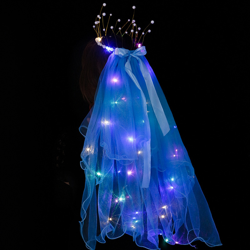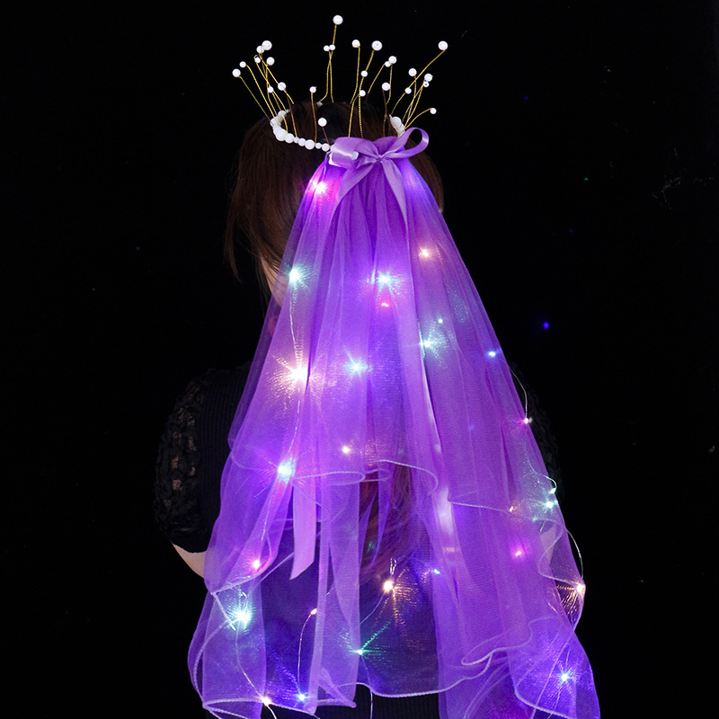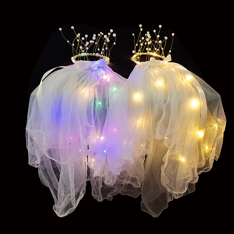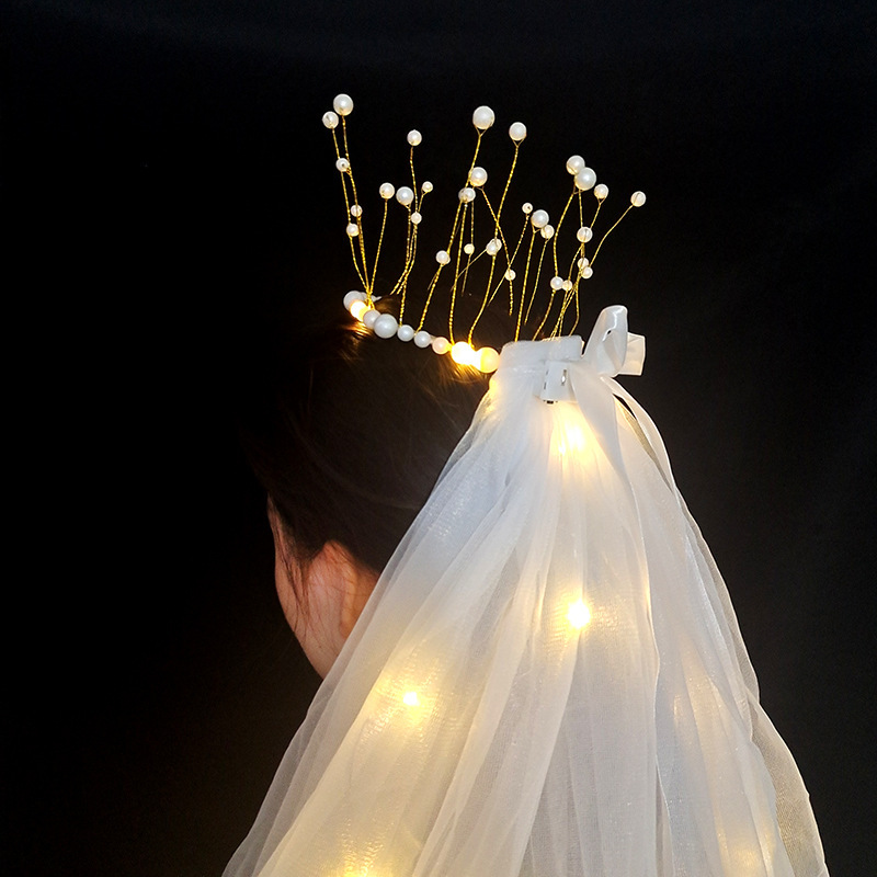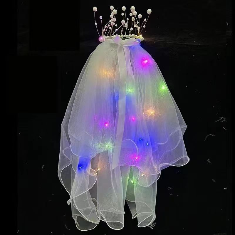 发光双层珍珠头纱网红带灯软纱闪光披纱女孩装扮流苏珍珠皇冠头饰