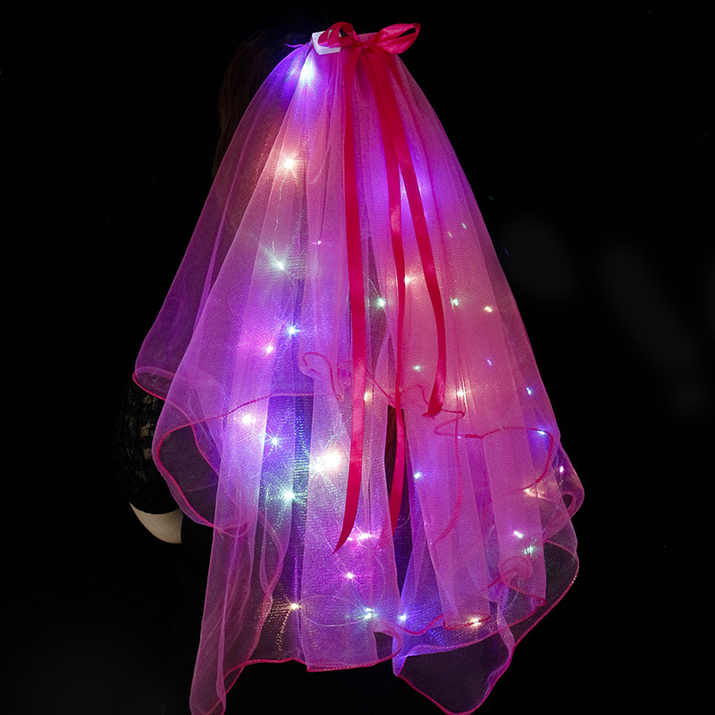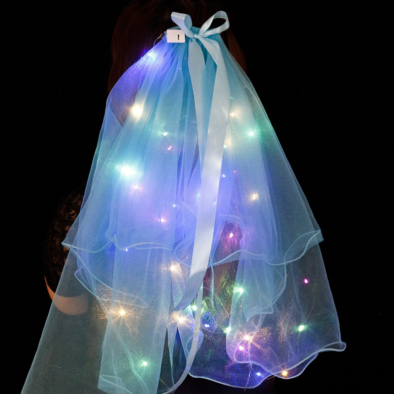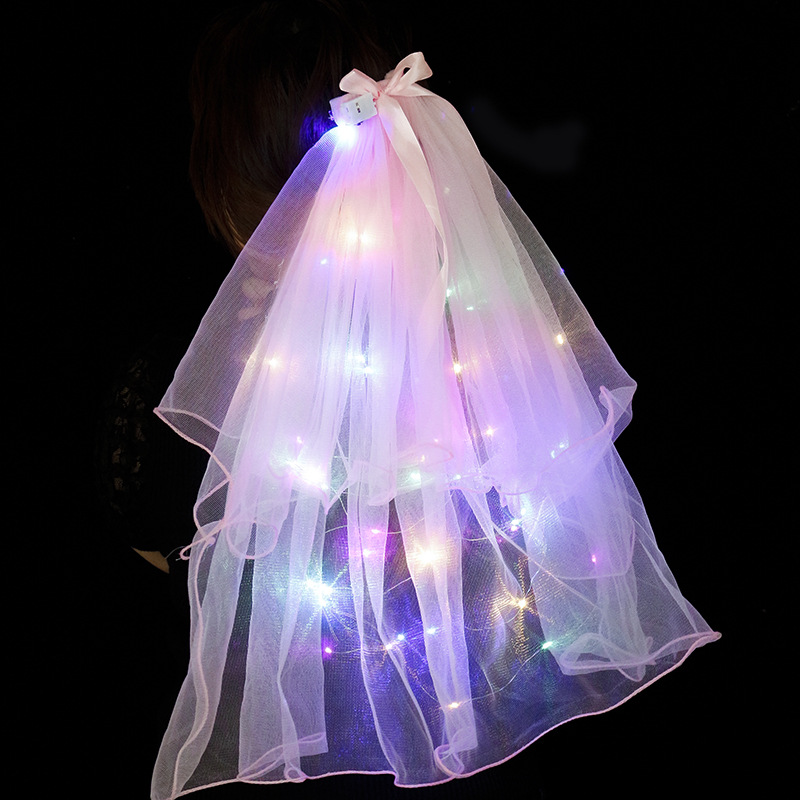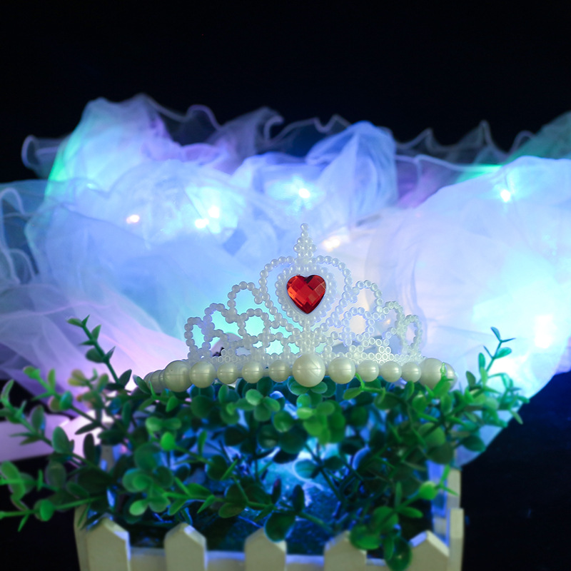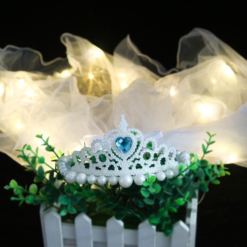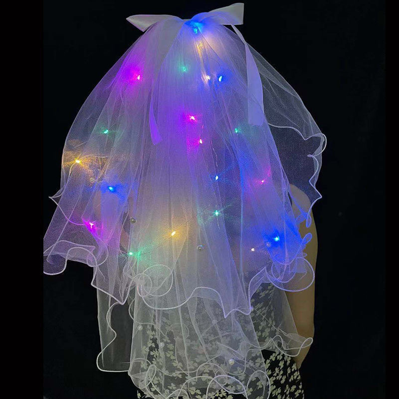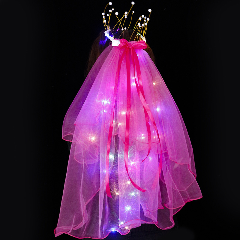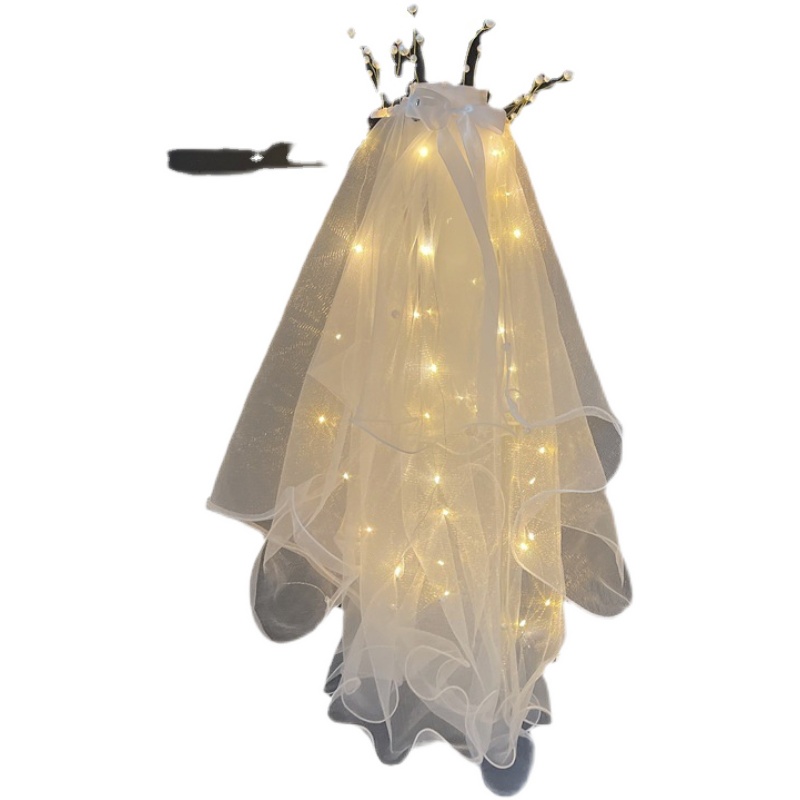 发光双层珍珠头纱网红带灯软纱闪光披纱女孩装扮流苏珍珠皇冠头饰