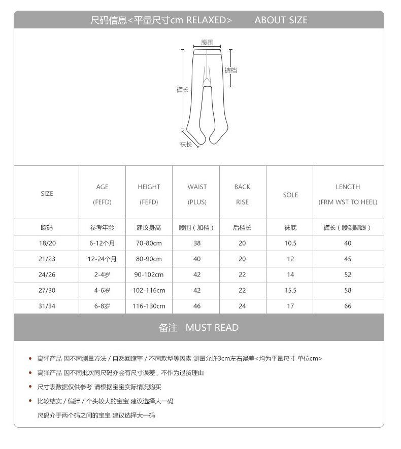 童袜尺码 18/20码6-12个月,21/23码1-2岁,24/26码2-4岁,27/30码4-6岁,31/34码6-8岁