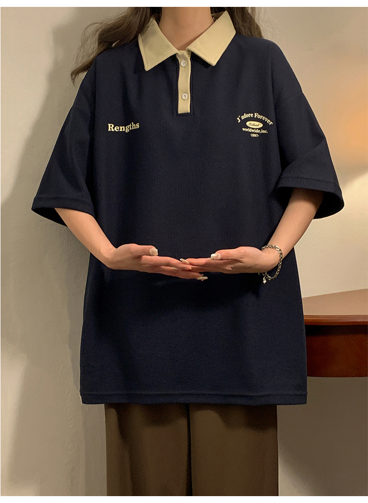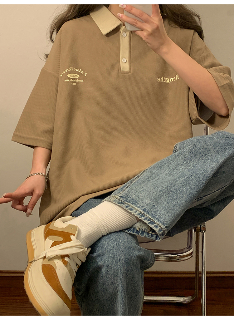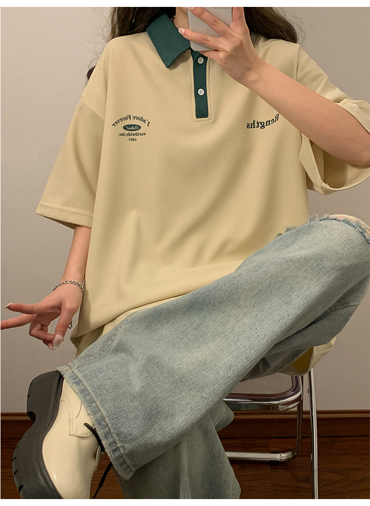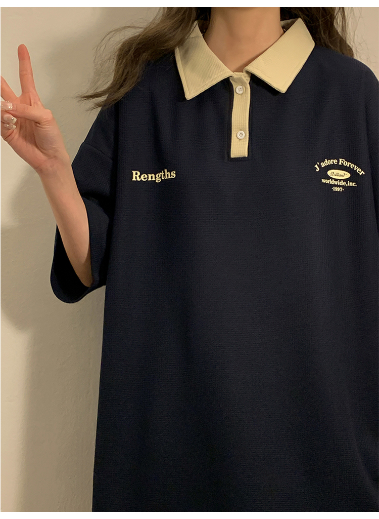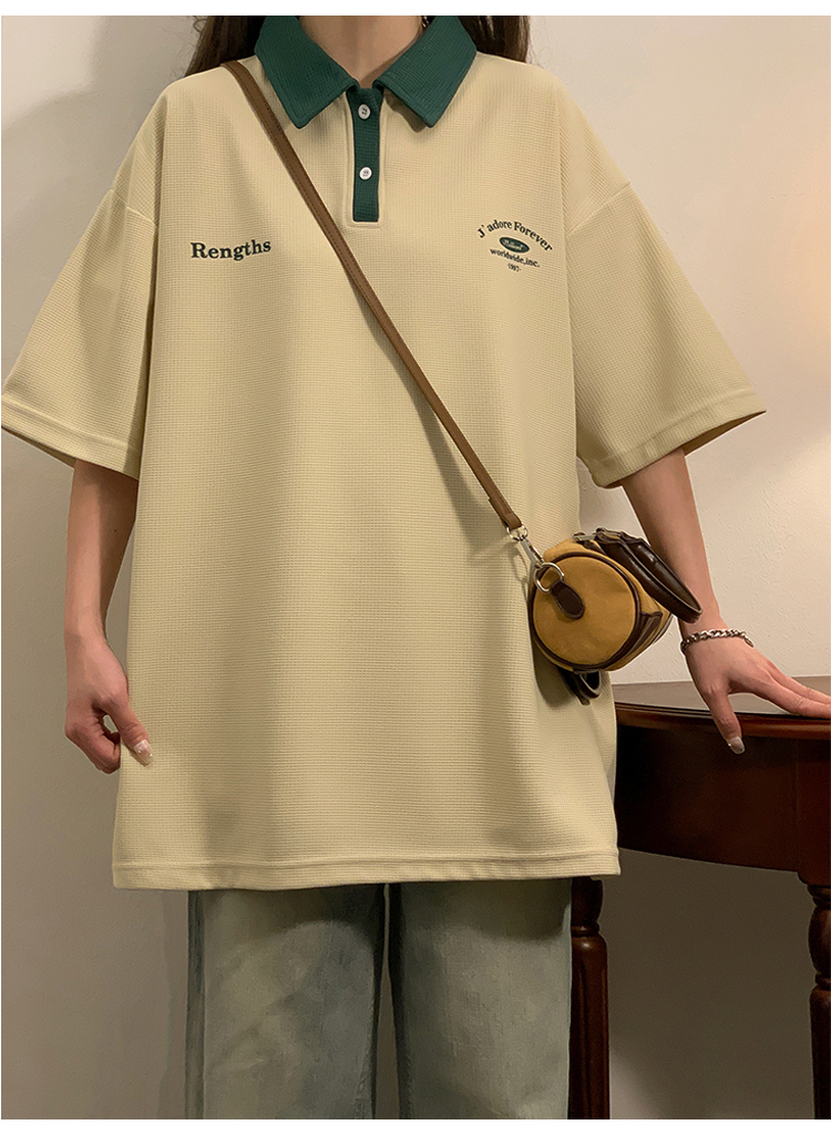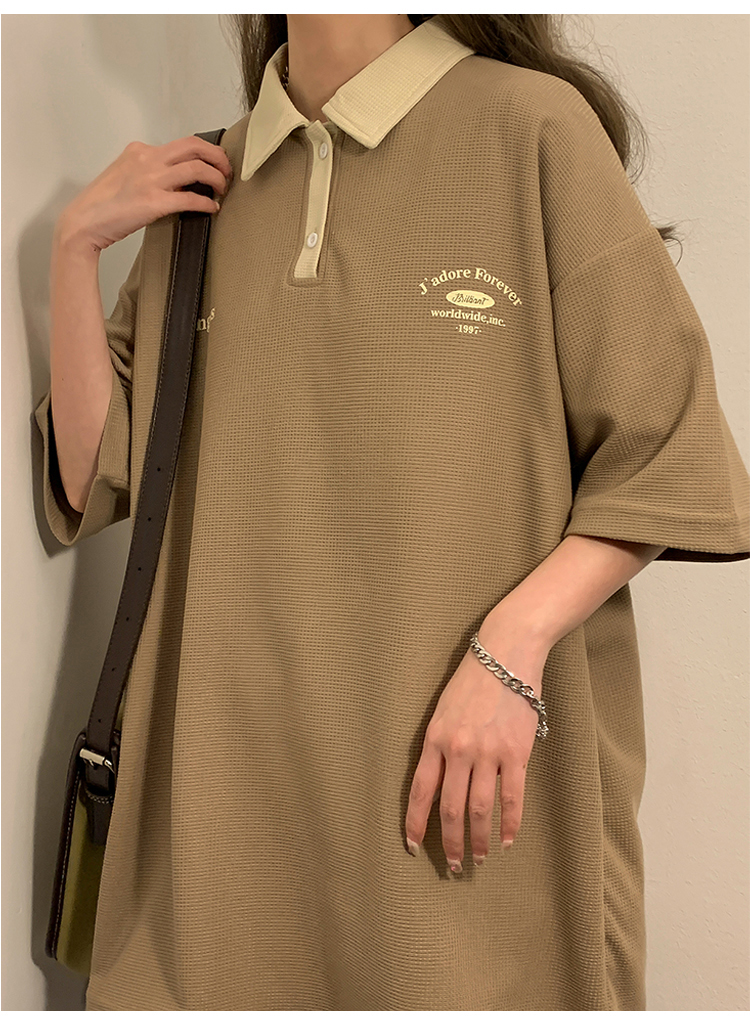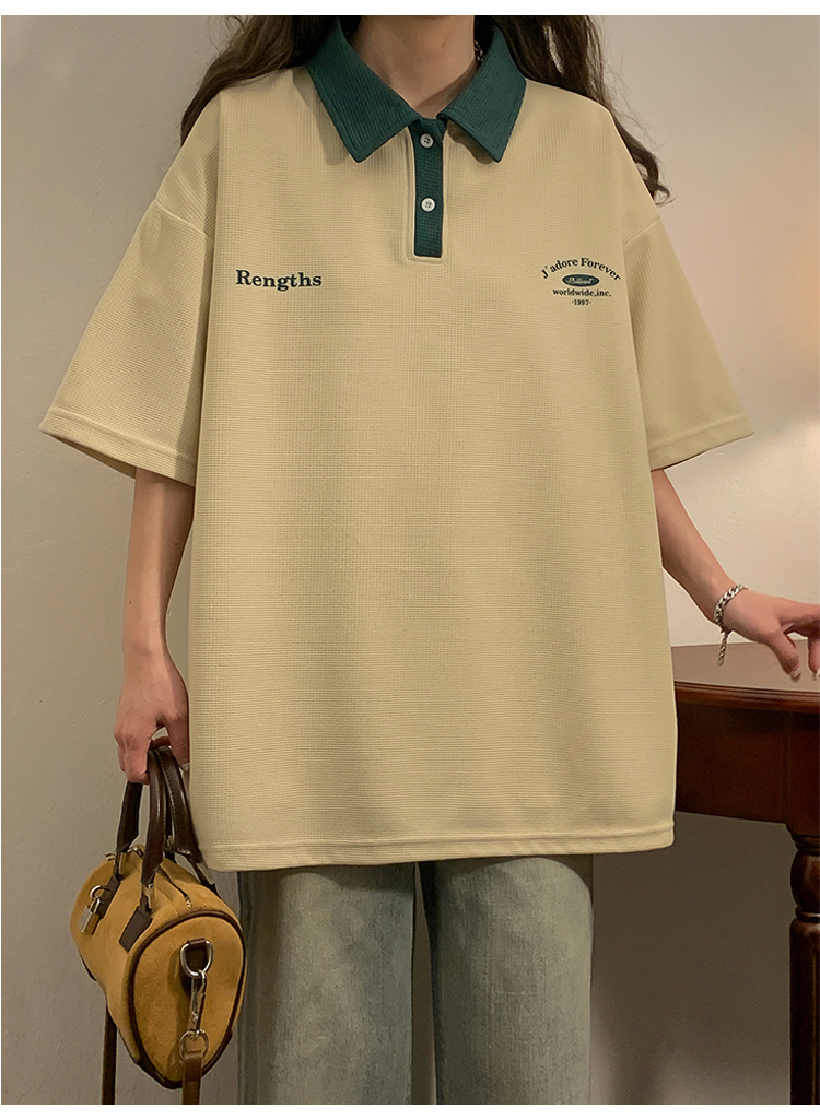 日系正肩Polo衫女夏季大尺碼美式短袖t恤2023新款T恤寬鬆半袖上衣