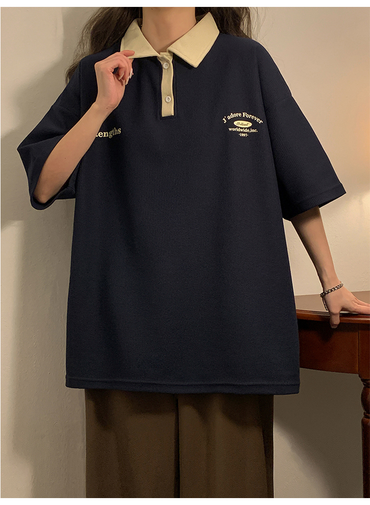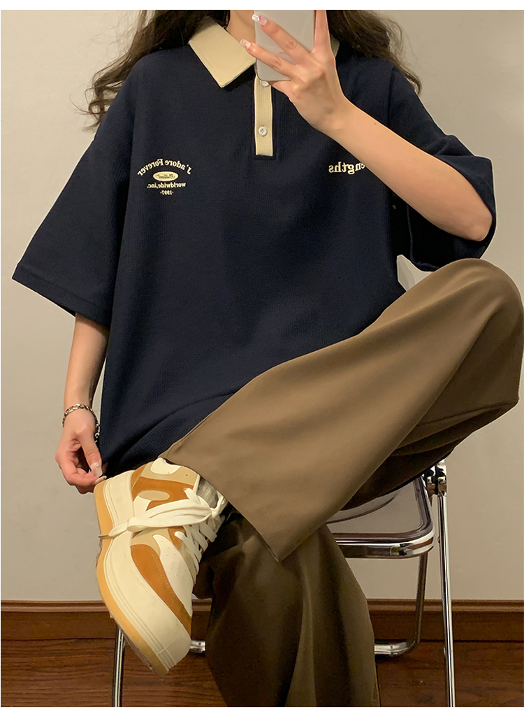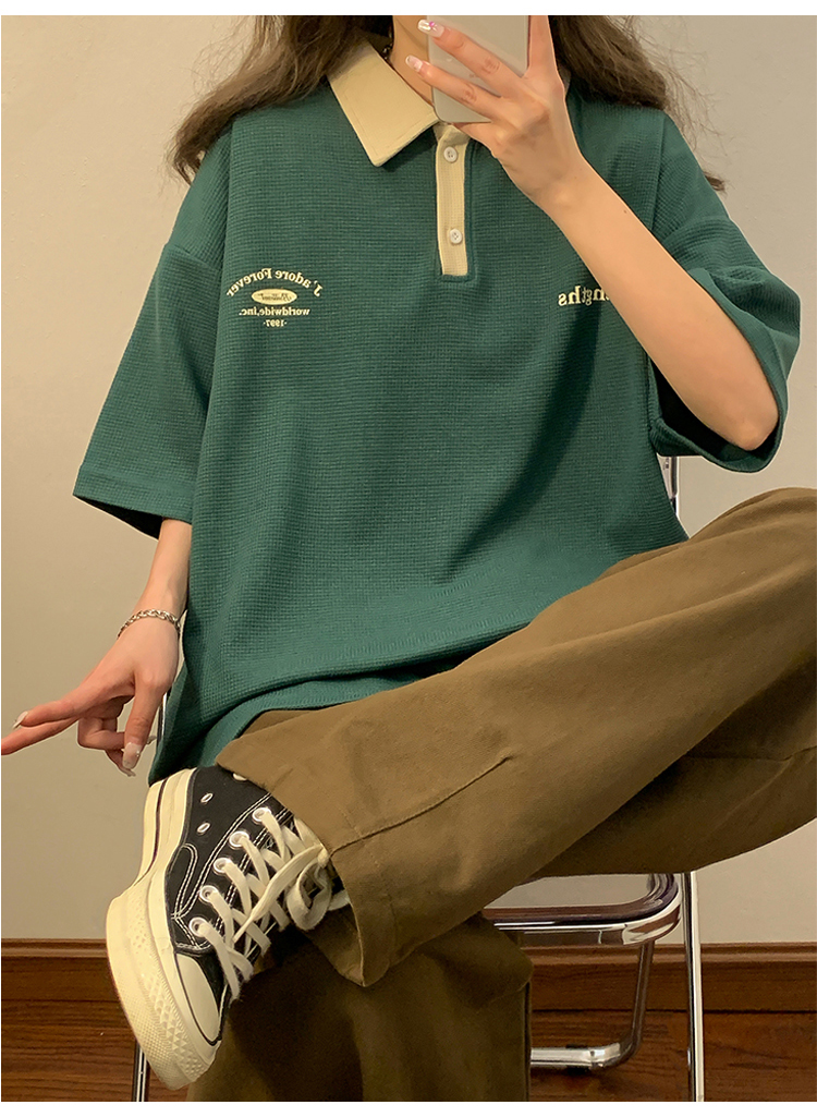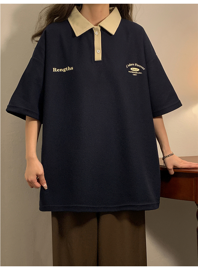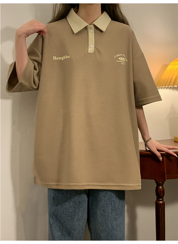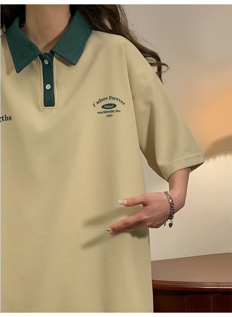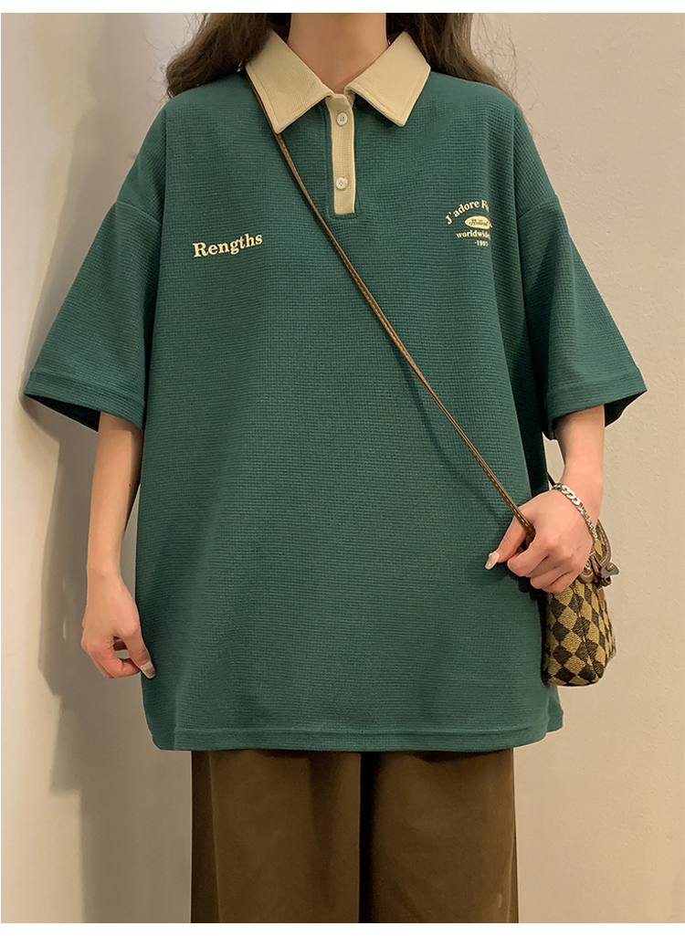 日系正肩Polo衫女夏季大尺碼美式短袖t恤2023新款T恤寬鬆半袖上衣
